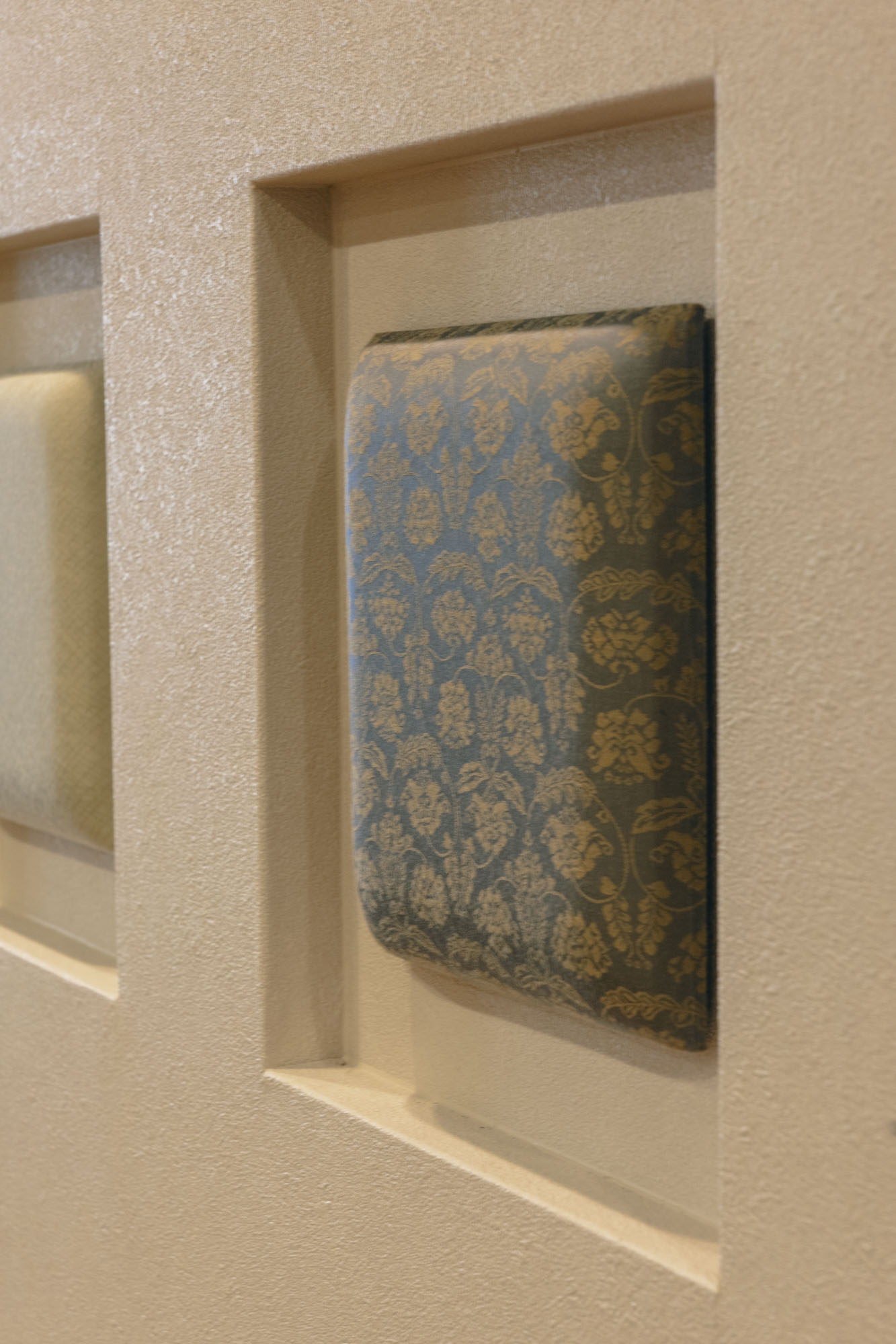 ニッチにぴったりはまるサイズ感。角を丸くすることで、立体感と優しさを演出。3種類の生地を選定しました。 ◆牡丹唐草…一重蔓唐草の先端に牡丹の花がある文様が全面的に配された図柄。表具用ででは最も定番的な植物模様。 ◆地紋柄…手書きでひっかいたような線の交差による抽象的な地紋柄。主役の本紙(絵や書)を邪魔しない合わせやすい地模様。 ◆更紗華文…インド、ペルシャから南蛮船により渡来した型染めの布は室町から江戸にかけて貴重品とされた。その表現の花文を図案化したもの。 額装や掛け軸の生地は、主張しすぎてはいけない。 脇役でありつつ、魅力的であることがポイント