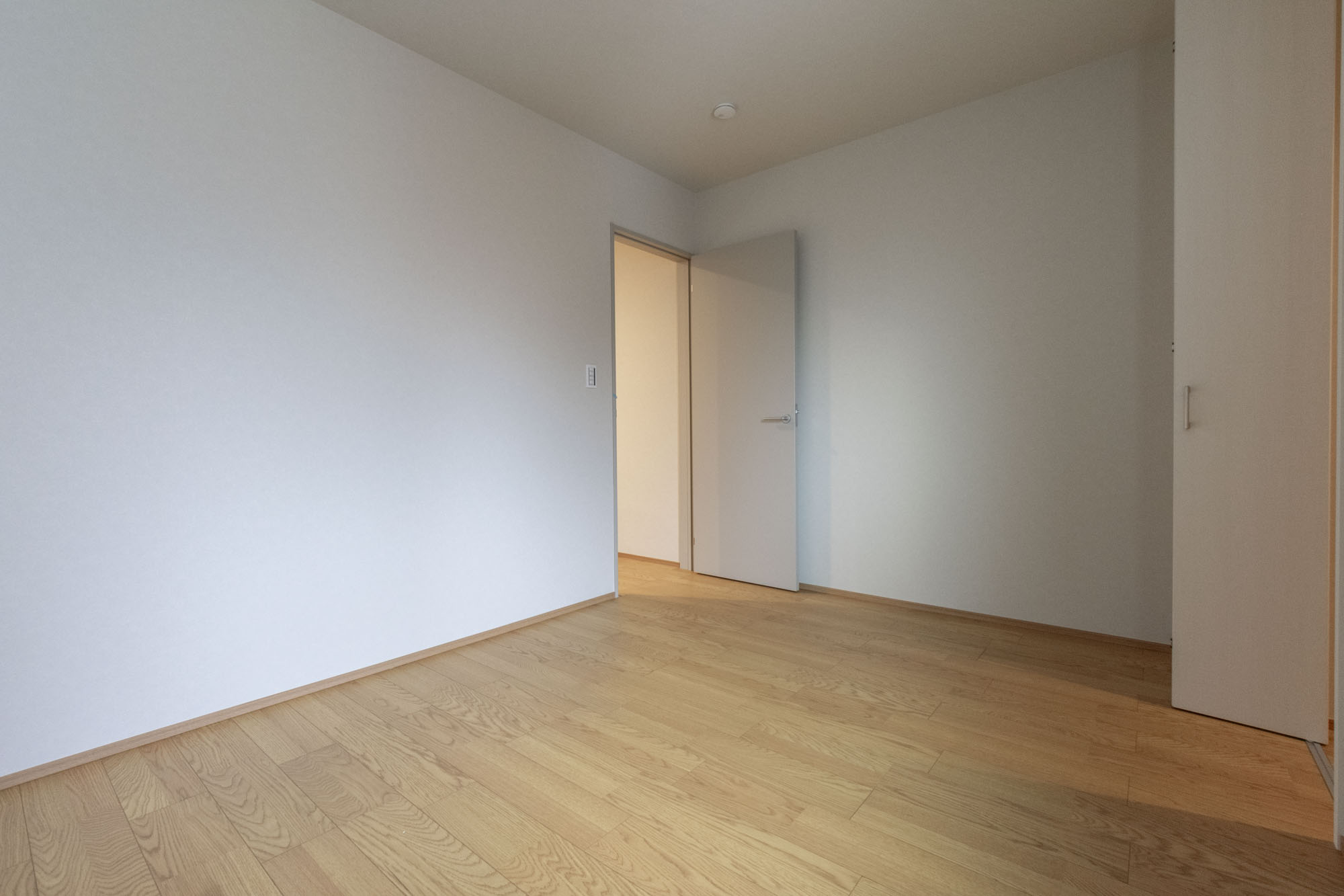 グレージュの落ち着いた床にショコラブラックの引き締まった扉で町屋風の趣のある空間を演出 落ち着いた色だけでなく、織物調の白い壁紙を使うことで狭小地でも明るく広い空間に感じられます
