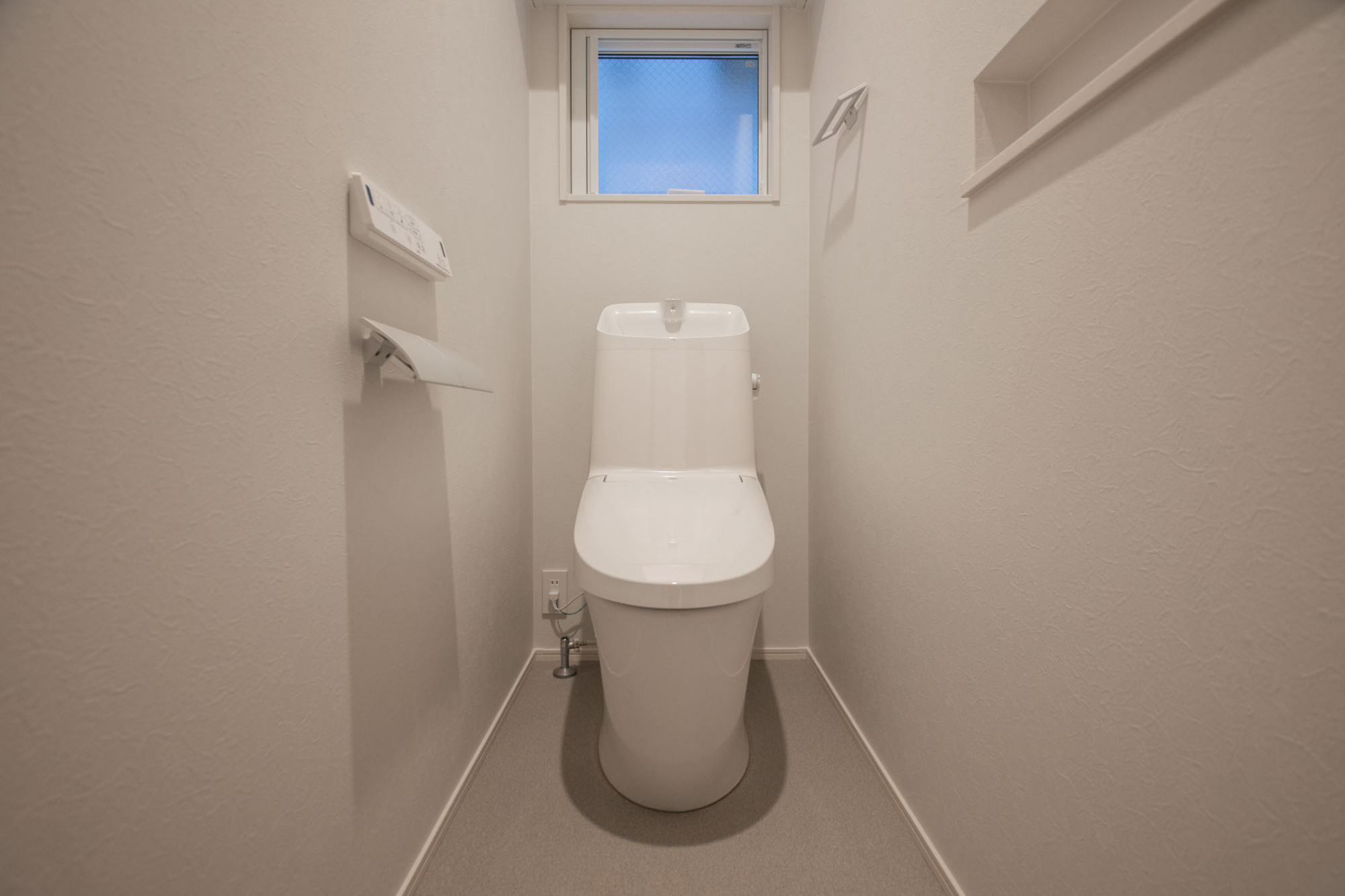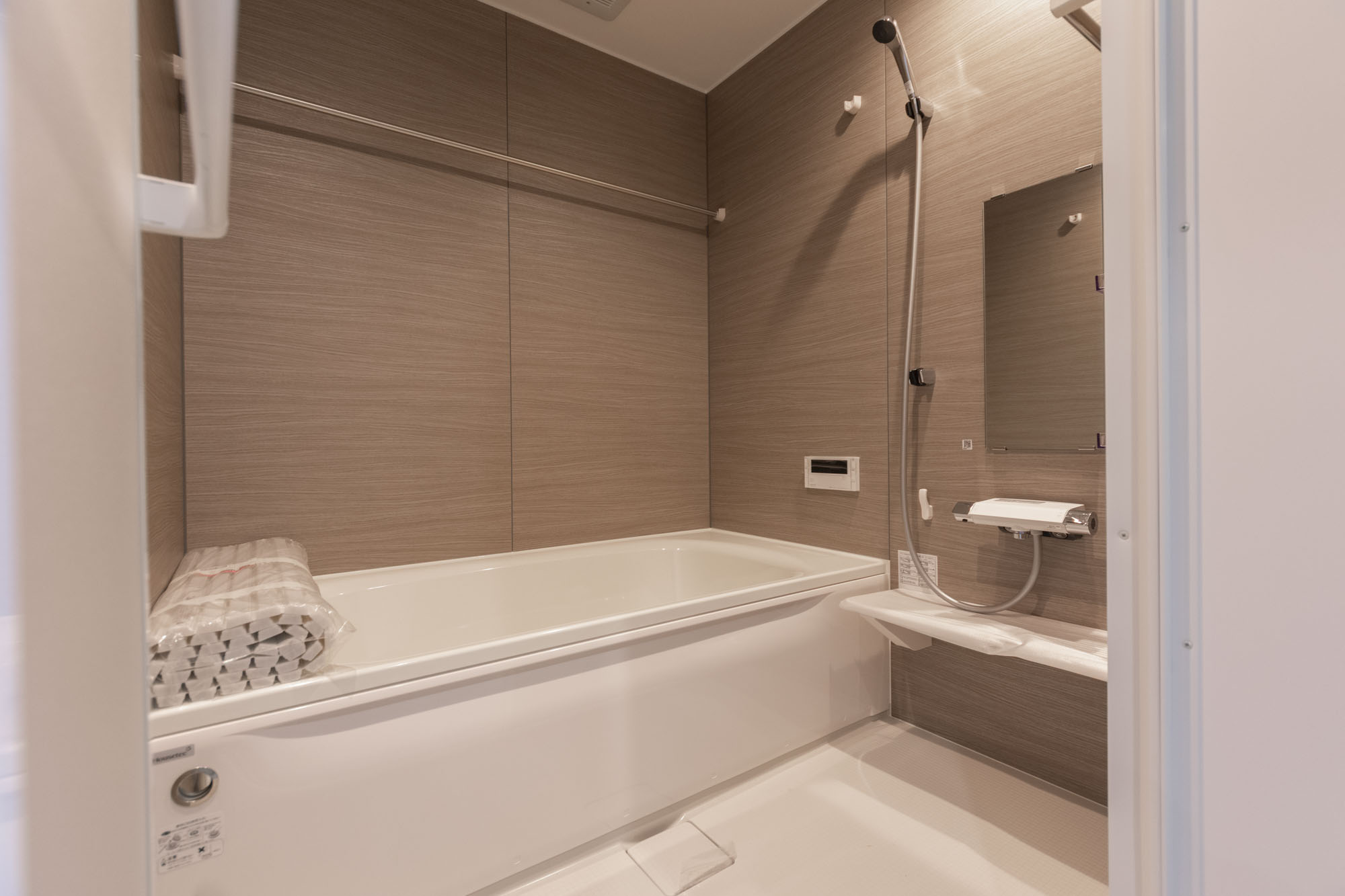 洗面(AICA):引き出し付き、収納棚付き。優しい木目柄の洗面とモルタル調のクッションフロアで和モダンを演出しました。 ・鏡(カワジュン):大小2枚。一人は立って洗面ボウルを使い、一人は座って化粧することもできます。お年頃のお子様が髪の毛を巻くのに洗面台を占領し、朝の洗面渋滞が起こることもありません!