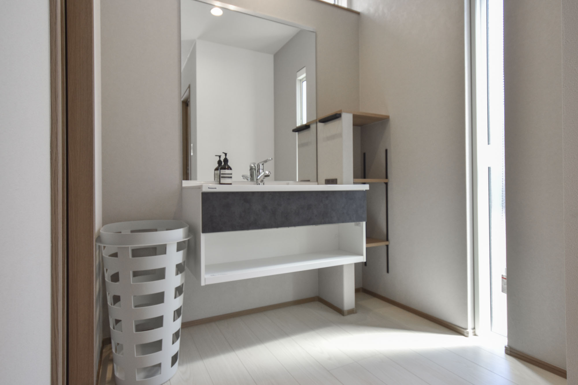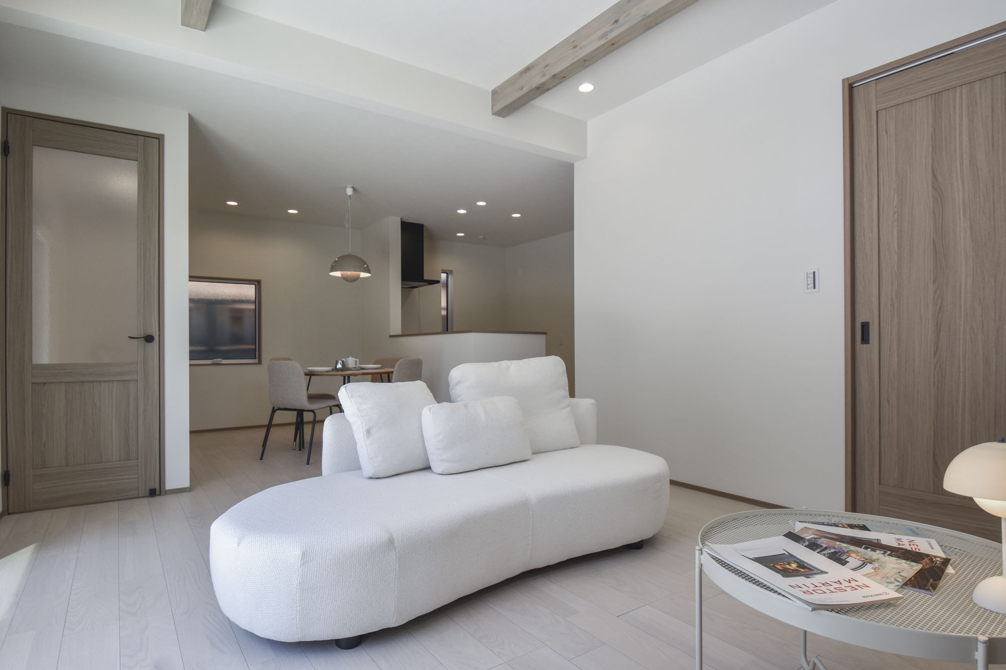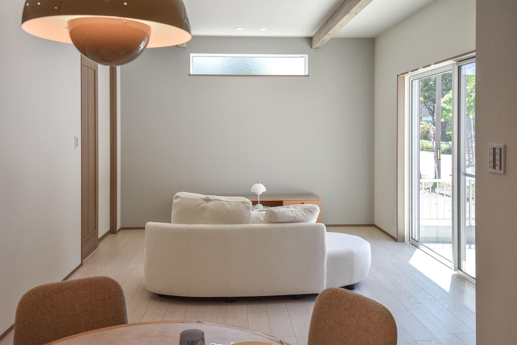 同系色でもわずかに色味の異なる複数の色を重ねる「トーン・オン・トーン」と呼ばれる手法を取り入れ、部屋全体をシンプルにオフホワイト×グレージュで統一。ニューノルディックらしいシンプルで洗練された雰囲気を大切にすると同時に、生活動線を意識した間取りも必見です