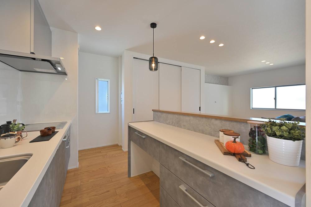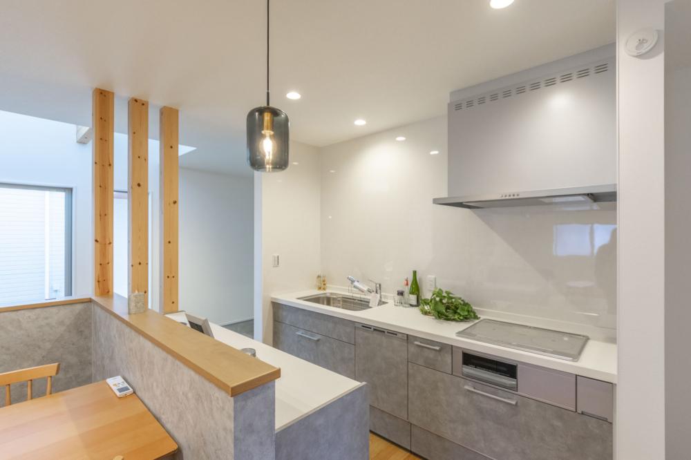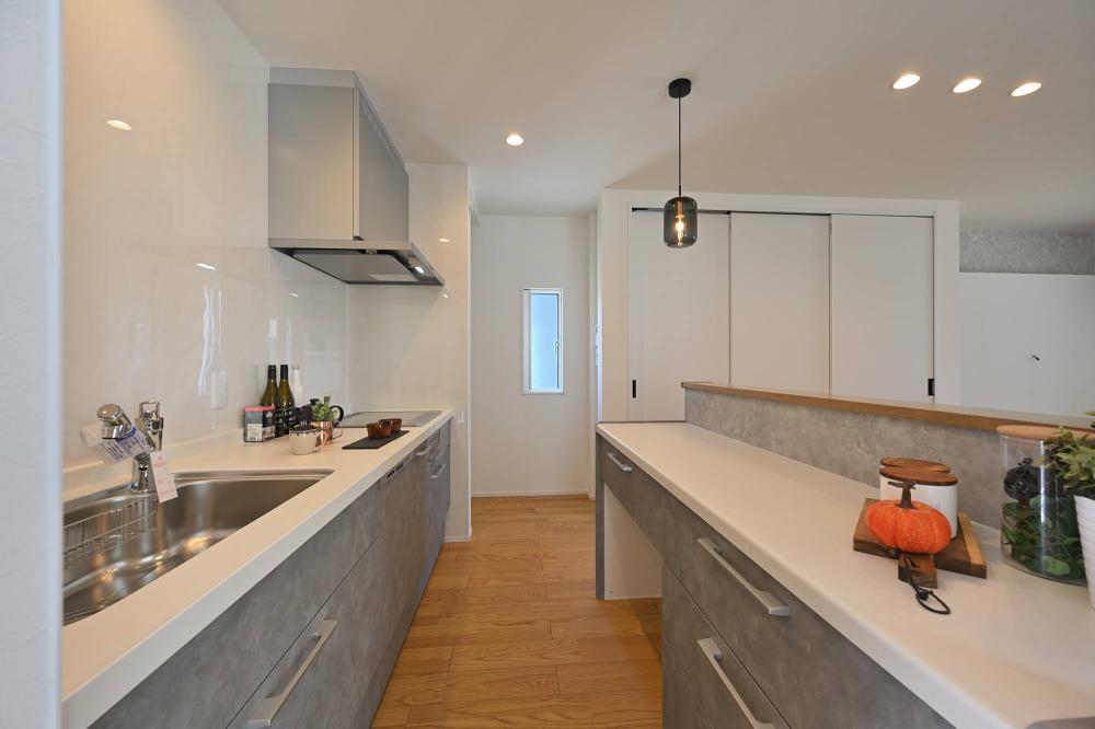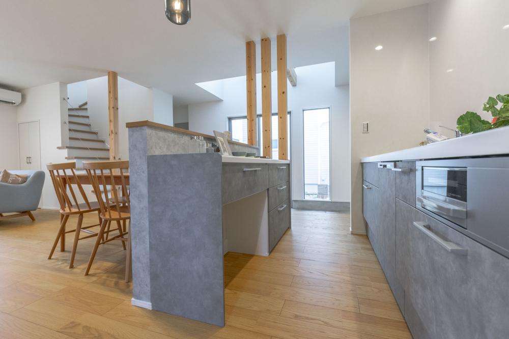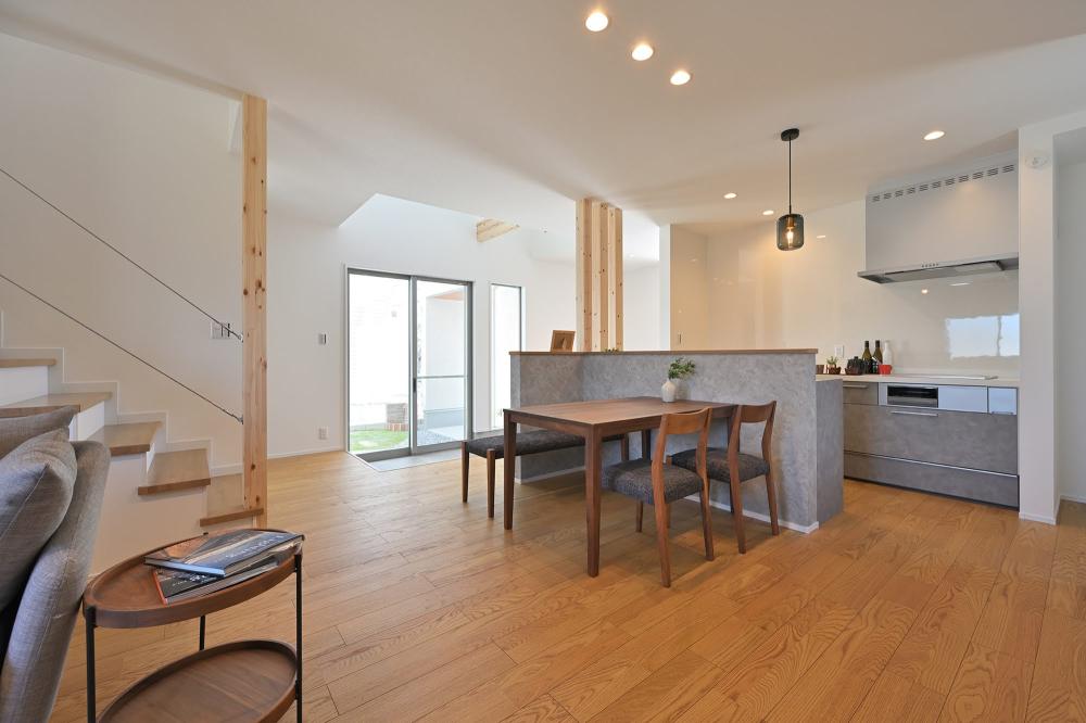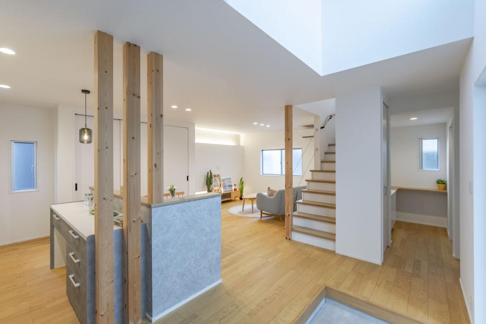 水廻りは、脱衣室と分けた洗面や敢えての壁付けキッチン等のこだわりがこもり、階段も一工夫されている見ごたえあるモデルハウス!