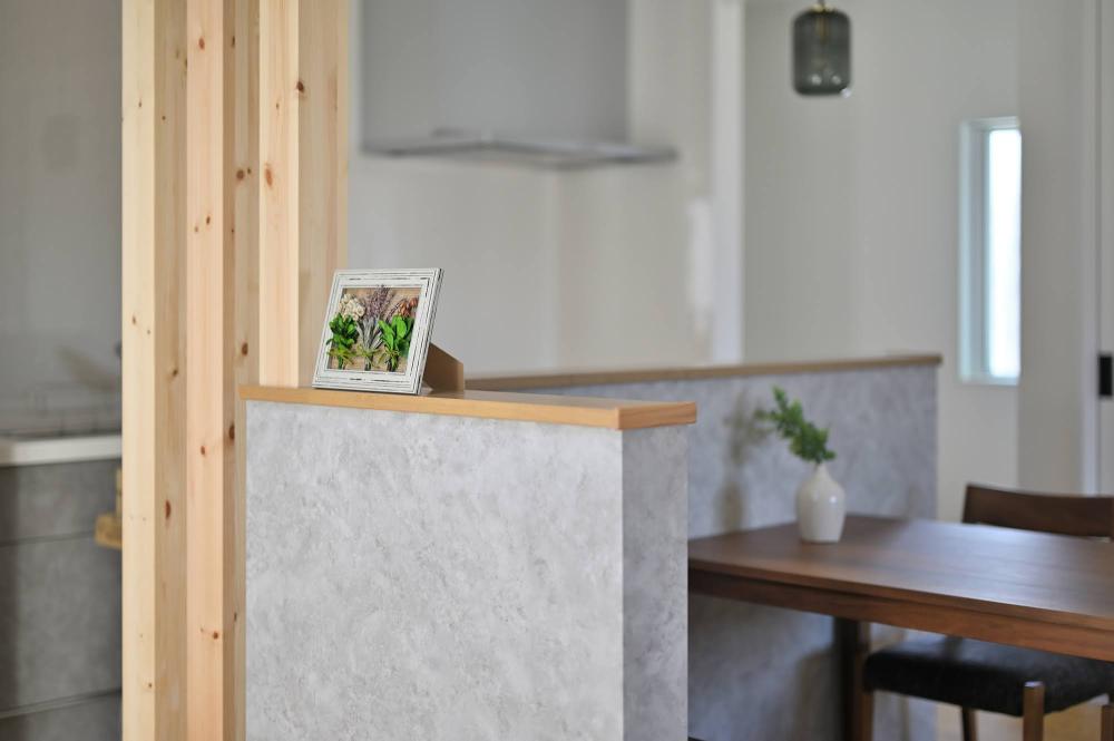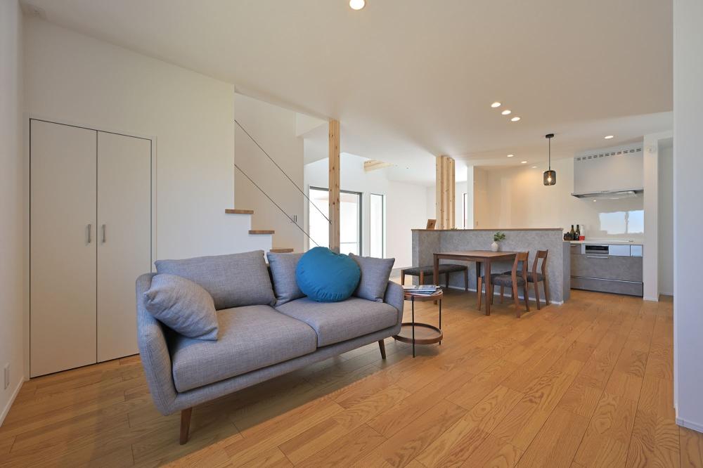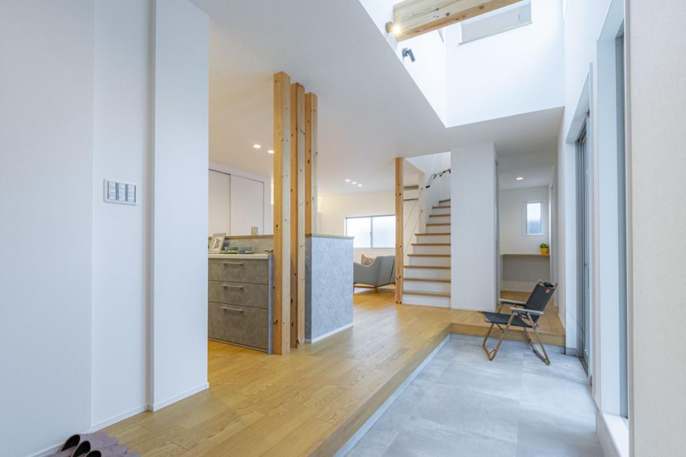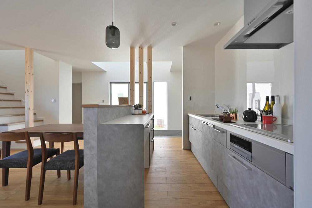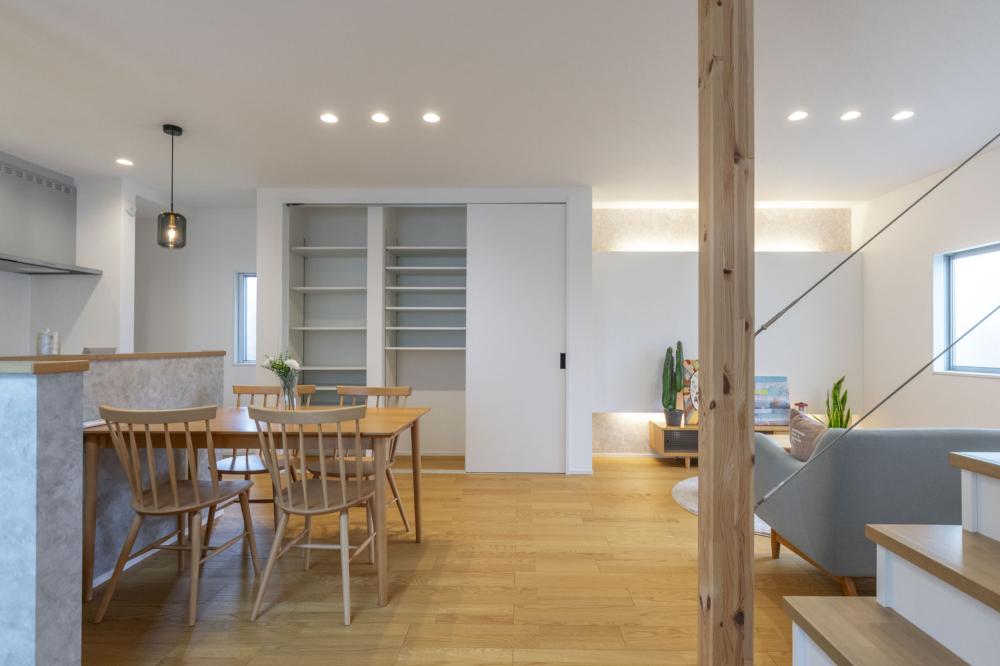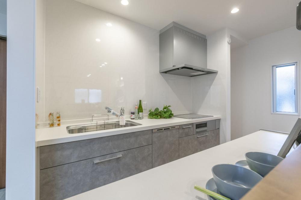 水廻りは、脱衣室と分けた洗面や敢えての壁付けキッチン等のこだわりがこもり、階段も一工夫されている見ごたえあるモデルハウス!