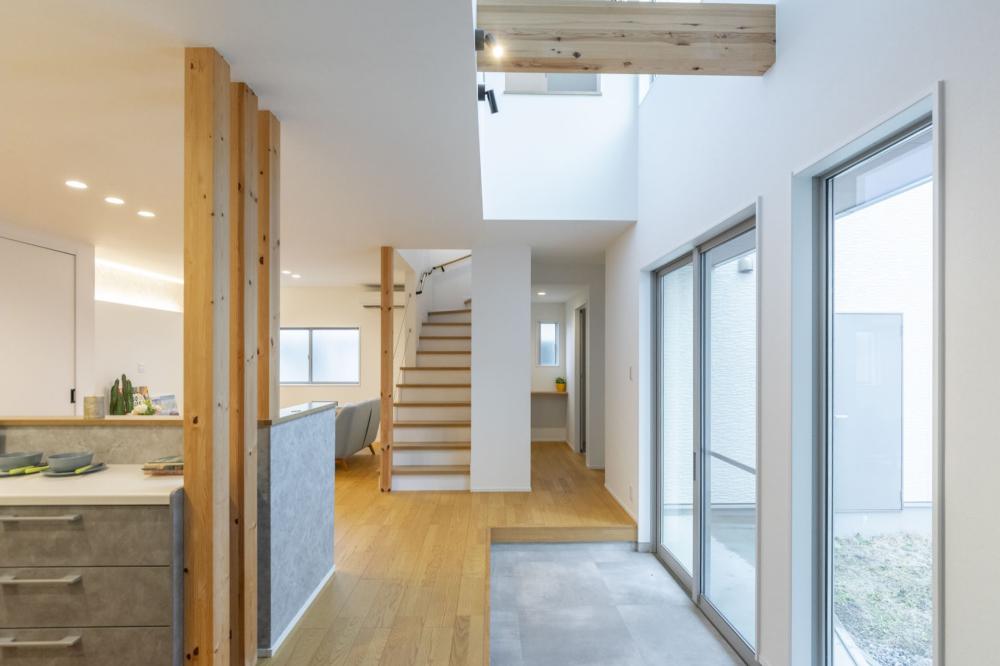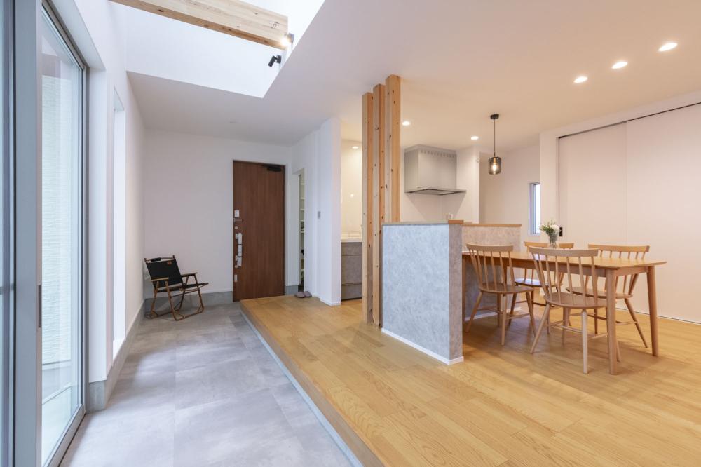 玄関から延びる土間部分は、大きな窓を介して外へと出入りが可能。