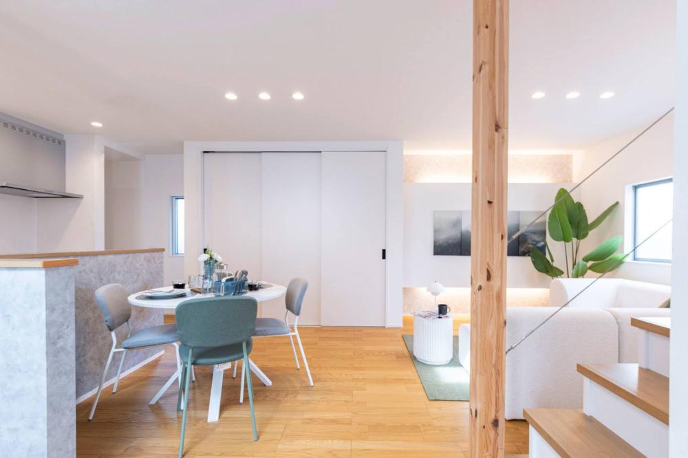明るい吹抜けから光が降り注ぐリビングダイニングは、自然素材を活かしたスタイリッシュなデザイン。キッチンカウンターの質感や、木の質感を感じる階段のアクセントが、まるで洗練されたロッジにいるような落ち着きを与えてくれます。