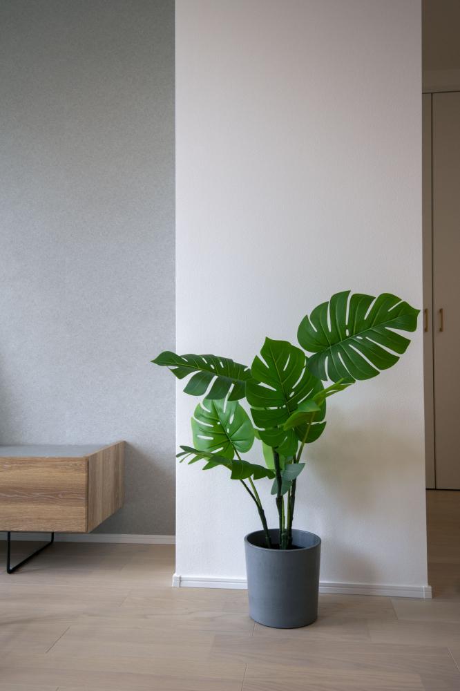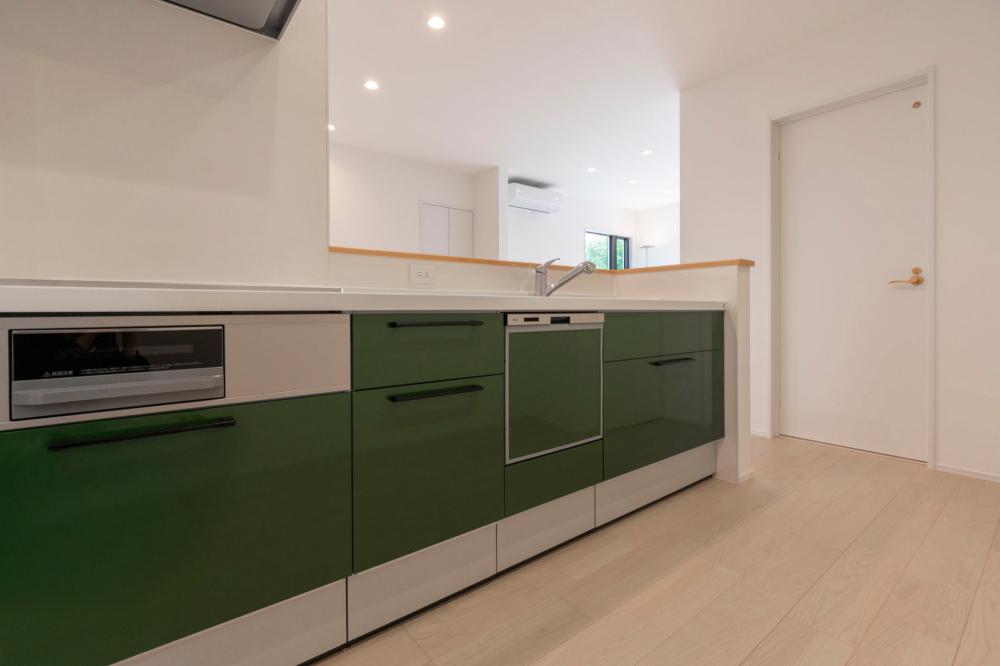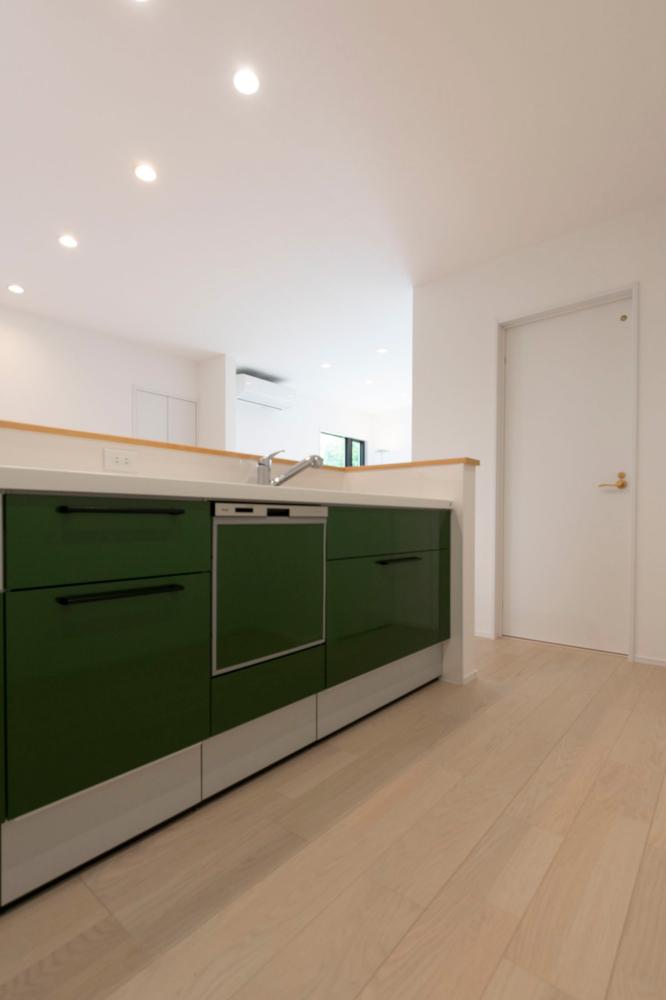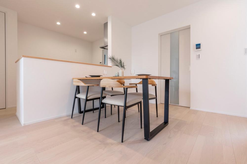 内装はホワイトベースの明るい空間で気持ちまで明るく、ポップなアクセントクロスや緑をあしらったかわいいシステムキッチンも魅力的なモデルハウスです