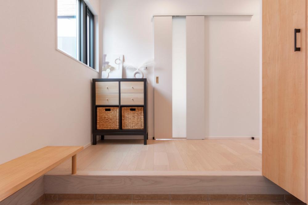 玄関には造作椅子が設置されており、靴の着脱に便利なだけでなく来客時には着席してお話も。