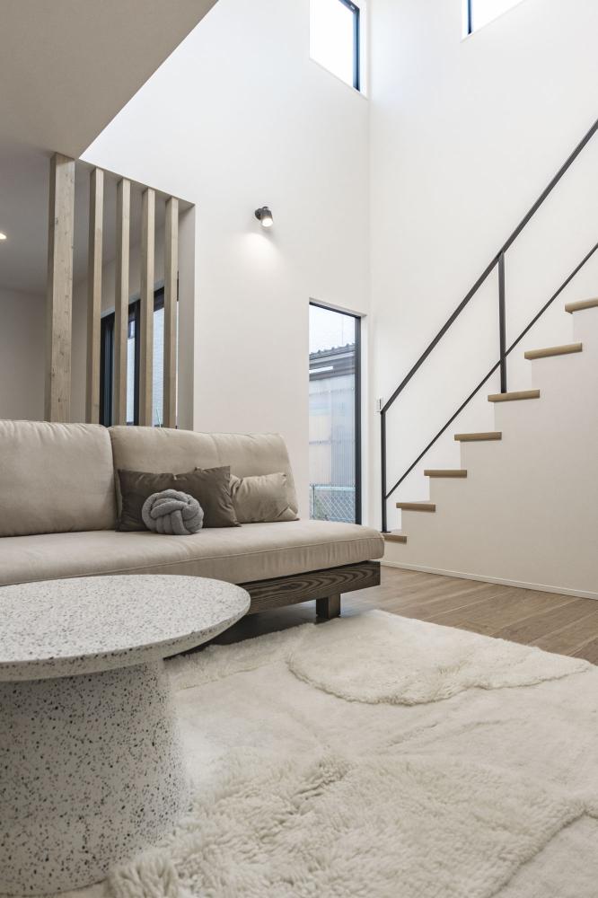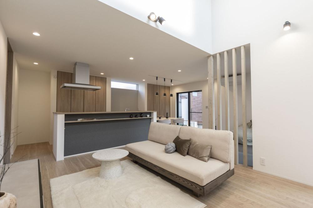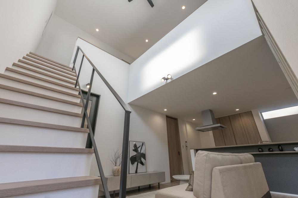 リビングは吹抜けで2階天井部分にはシーリングファンを設置。空気の循環だけでなくおしゃれインテリアとしても優秀です。