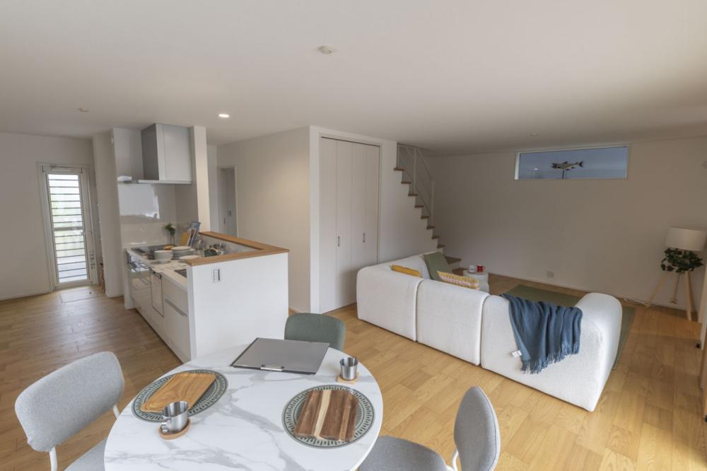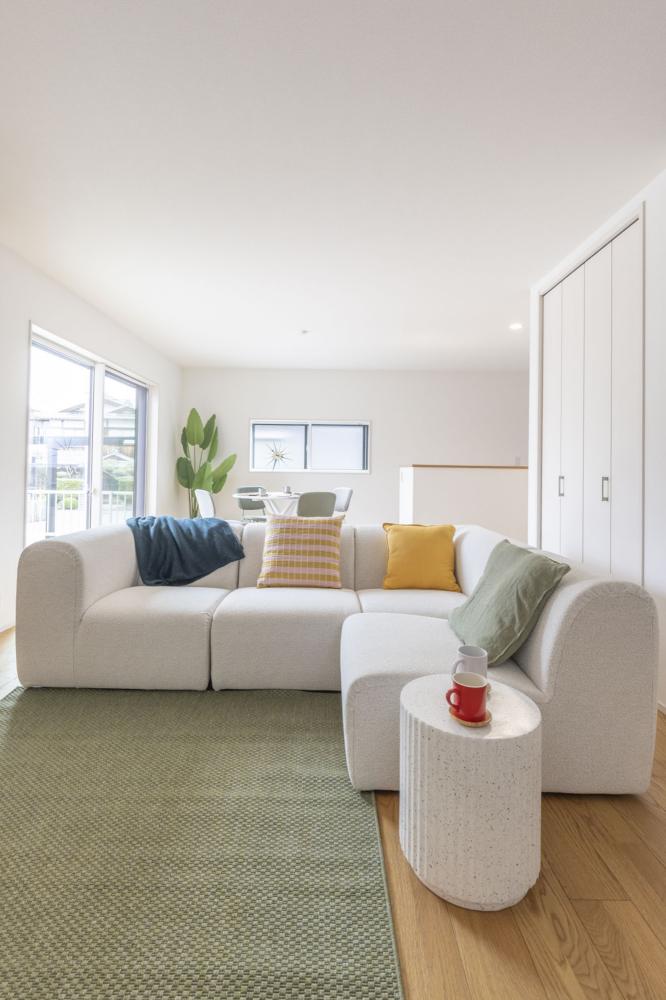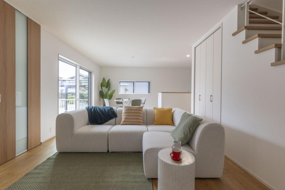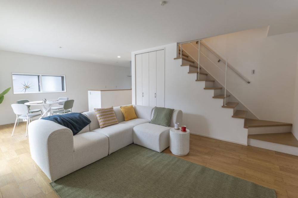 どんなインテリアも美しく映えるナチュラルな空間には、デザインのアクセントとなる一部オープン階段を採用しています 。