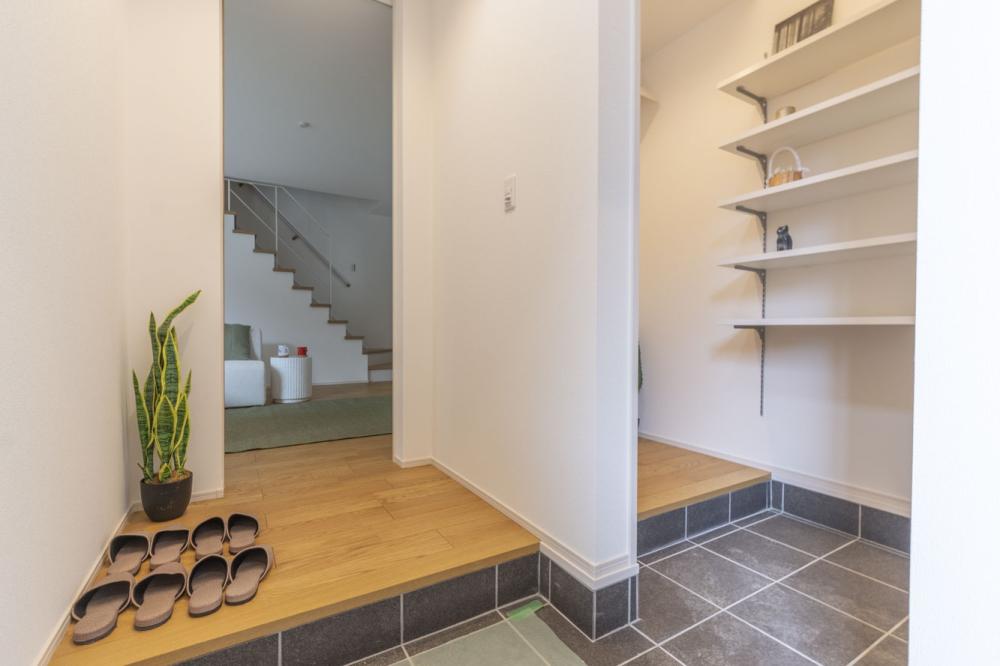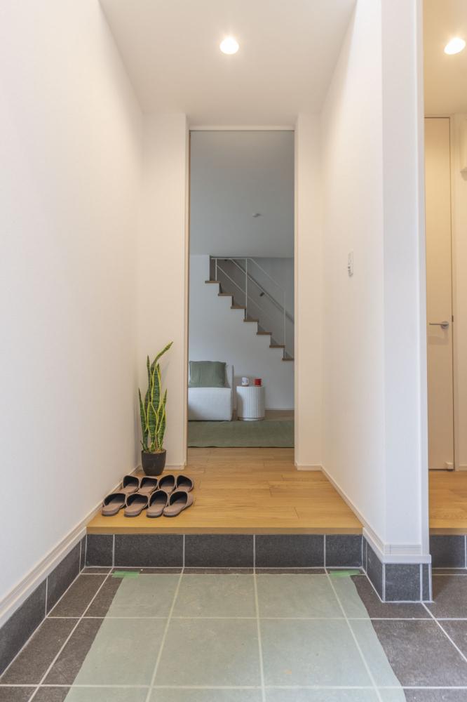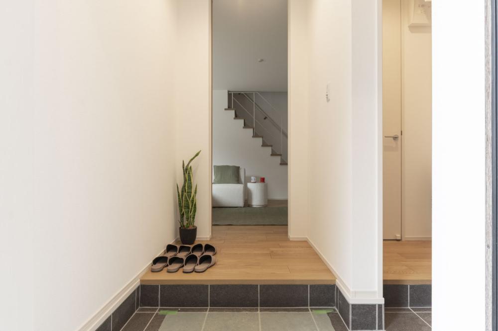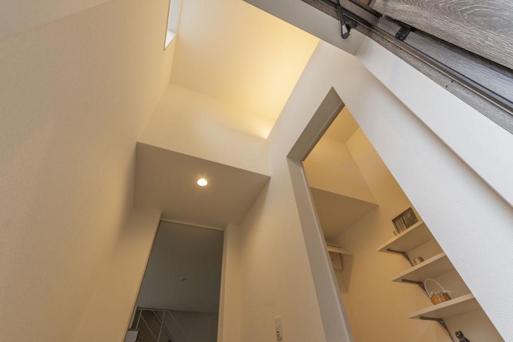 印象的な外観から一歩内へ入ると、玄関ホールの吹き抜けとハイドアが創り出す開放的な空間がご家族を迎えます 。