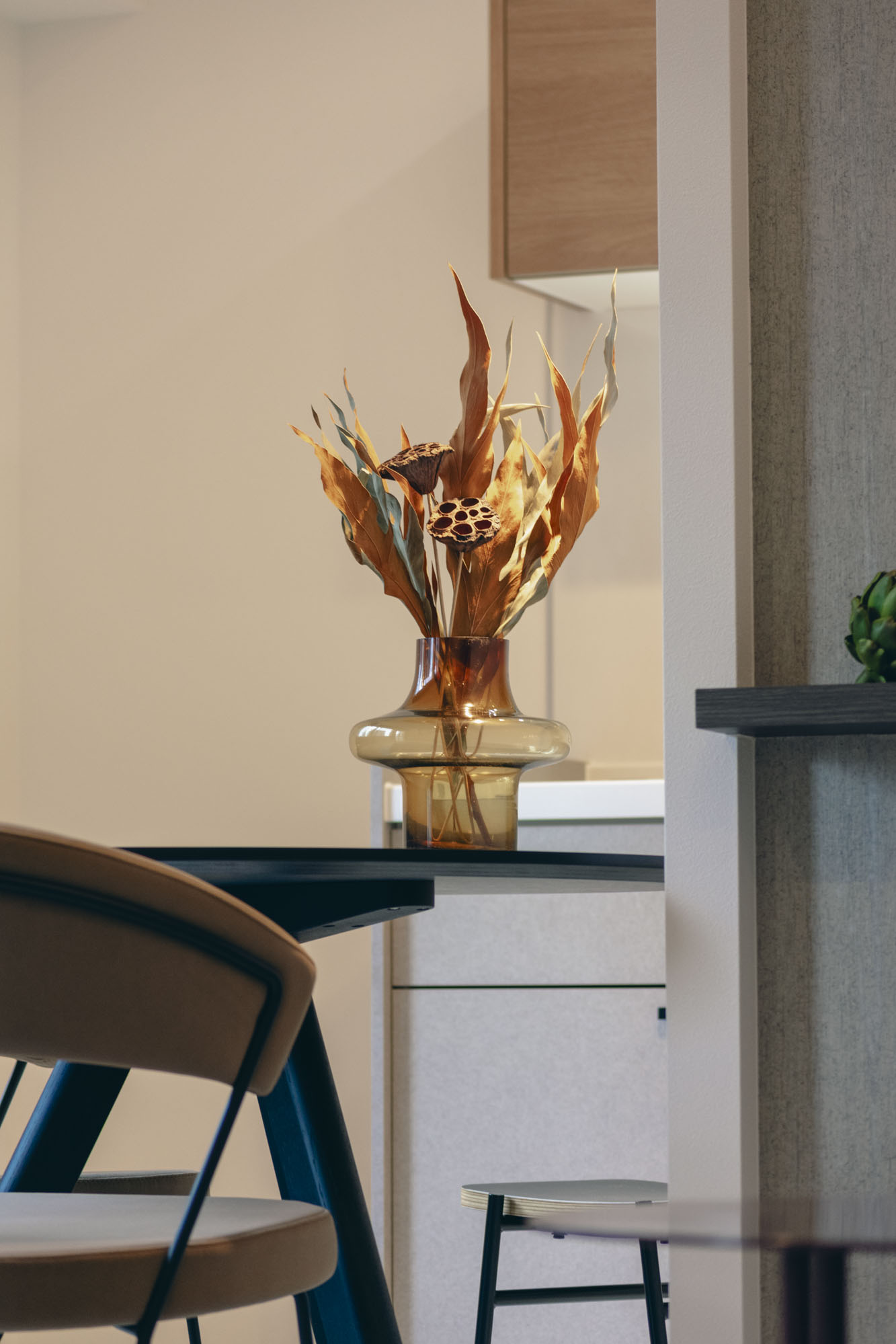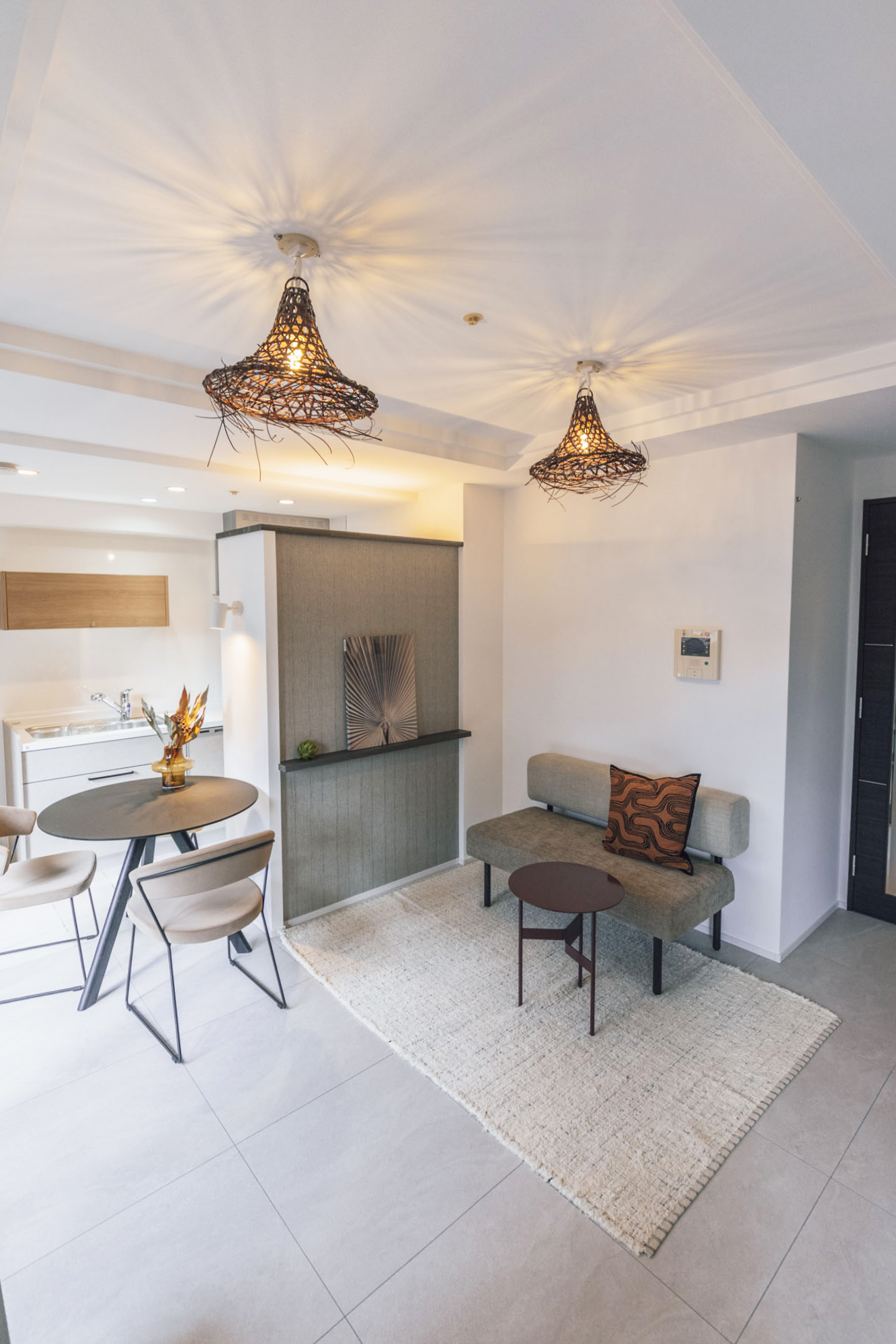 リゾートらしい自然素材の装飾を控えめに配置し、洗練された雰囲気を保ちつつも、日常から離れた癒しと贅沢感と個性をプラス