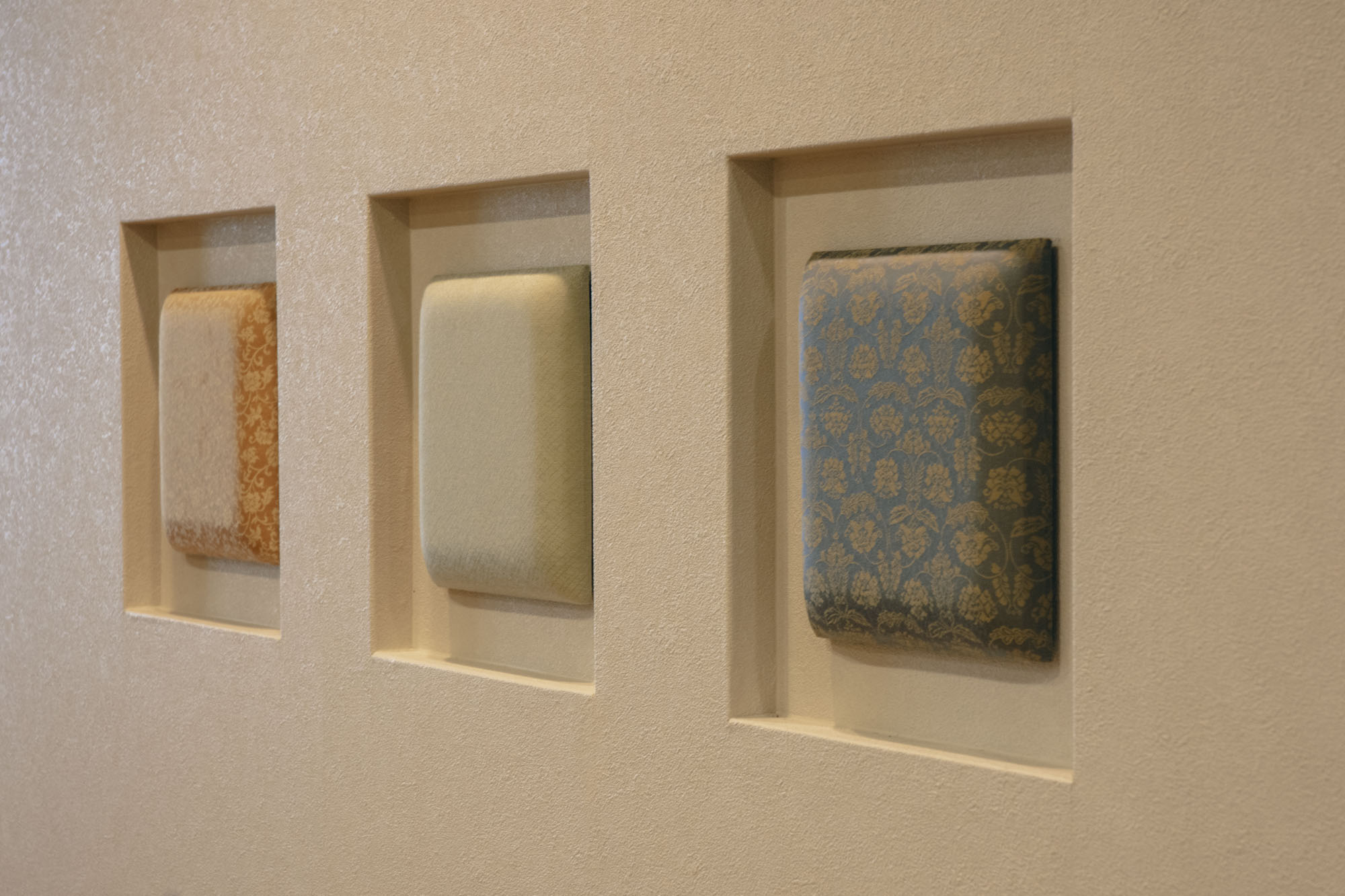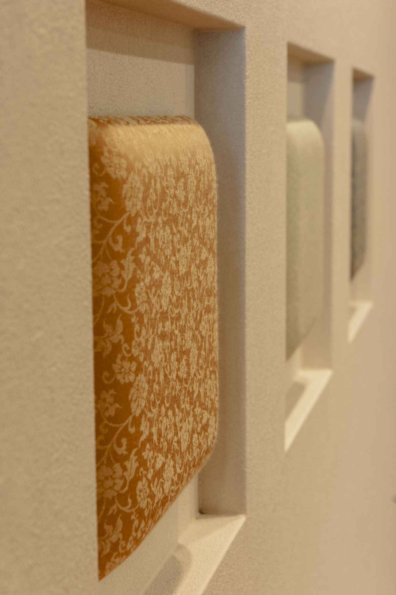 ニッチにぴったりはまるサイズ感。角を丸くすることで、立体感と優しさを演出。3種類の生地を選定しました。 ◆牡丹唐草…一重蔓唐草の先端に牡丹の花がある文様が全面的に配された図柄。表具用ででは最も定番的な植物模様。 ◆地紋柄…手書きでひっかいたような線の交差による抽象的な地紋柄。主役の本紙(絵や書)を邪魔しない合わせやすい地模様。 ◆更紗華文…インド、ペルシャから南蛮船により渡来した型染めの布は室町から江戸にかけて貴重品とされた。その表現の花文を図案化したもの。 額装や掛け軸の生地は、主張しすぎてはいけない。 脇役でありつつ、魅力的であることがポイント
