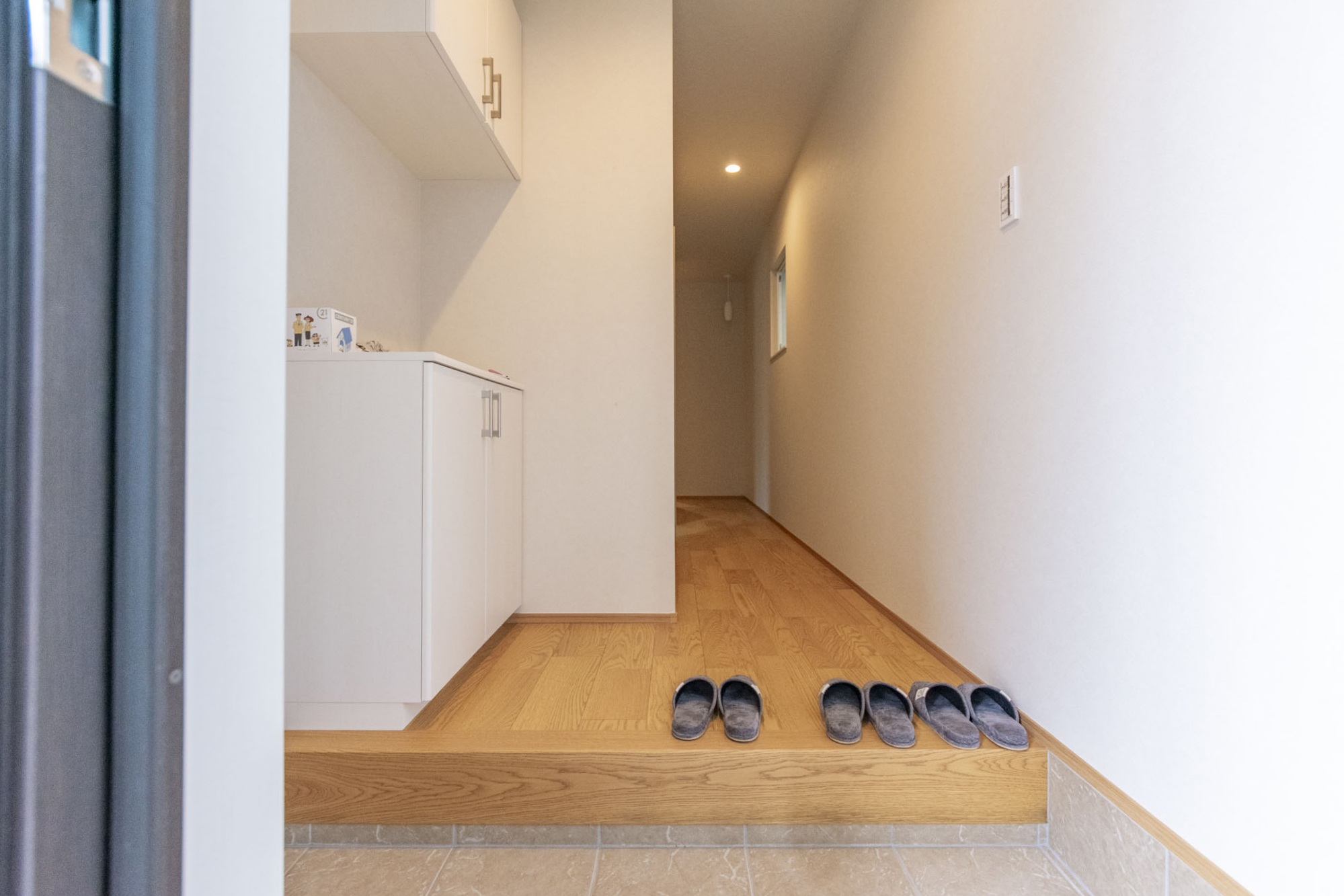 グレージュの落ち着いた床にショコラブラックの引き締まった扉で町屋風の趣のある空間を演出 落ち着いた色だけでなく、織物調の白い壁紙を使うことで狭小地でも明るく広い空間に感じられます