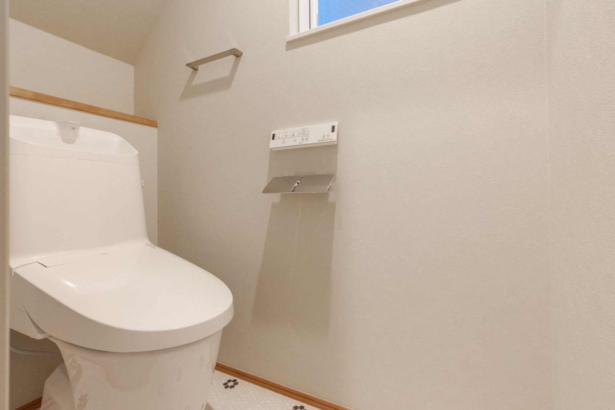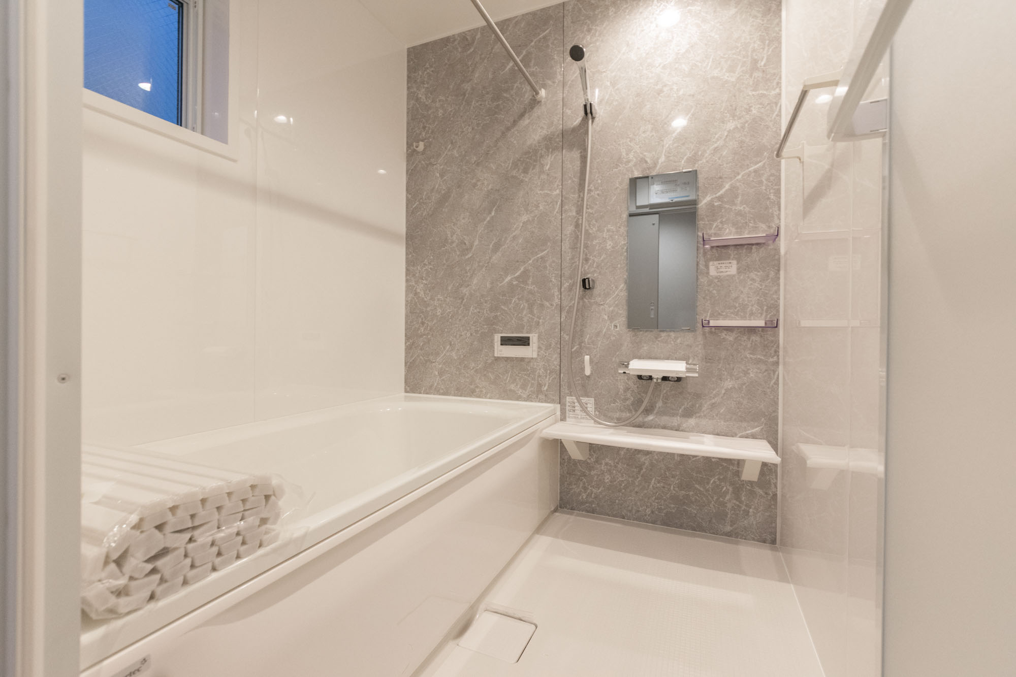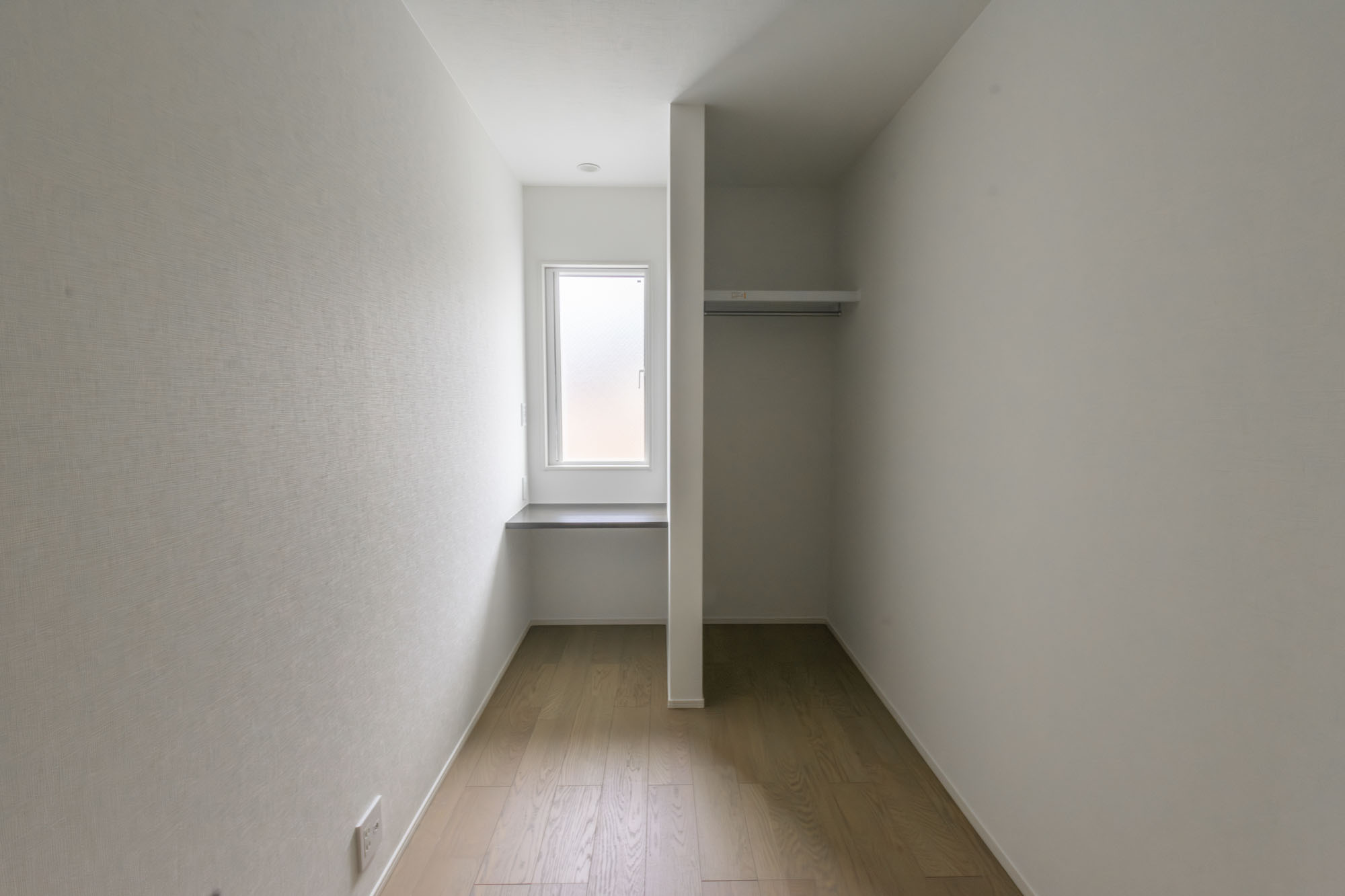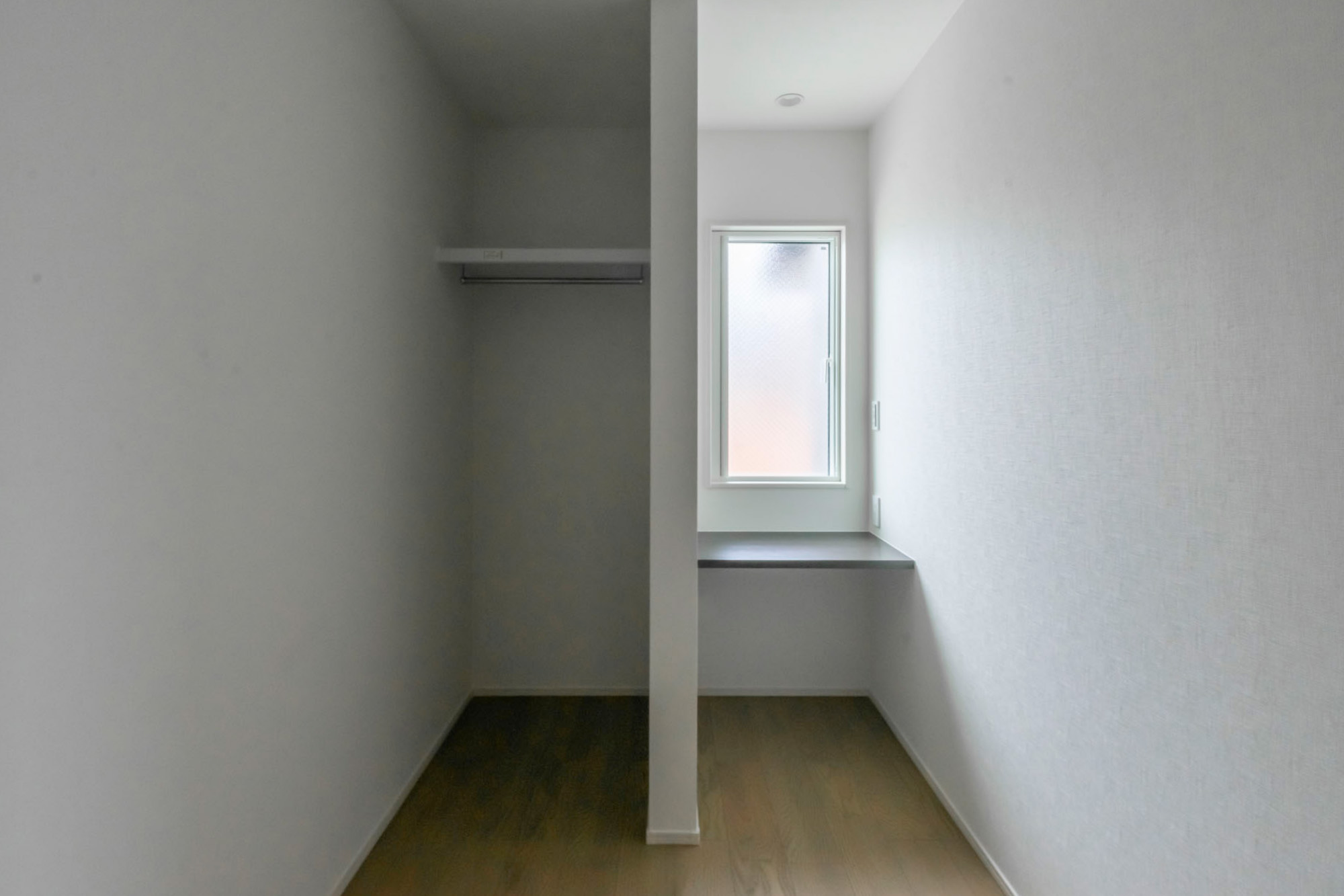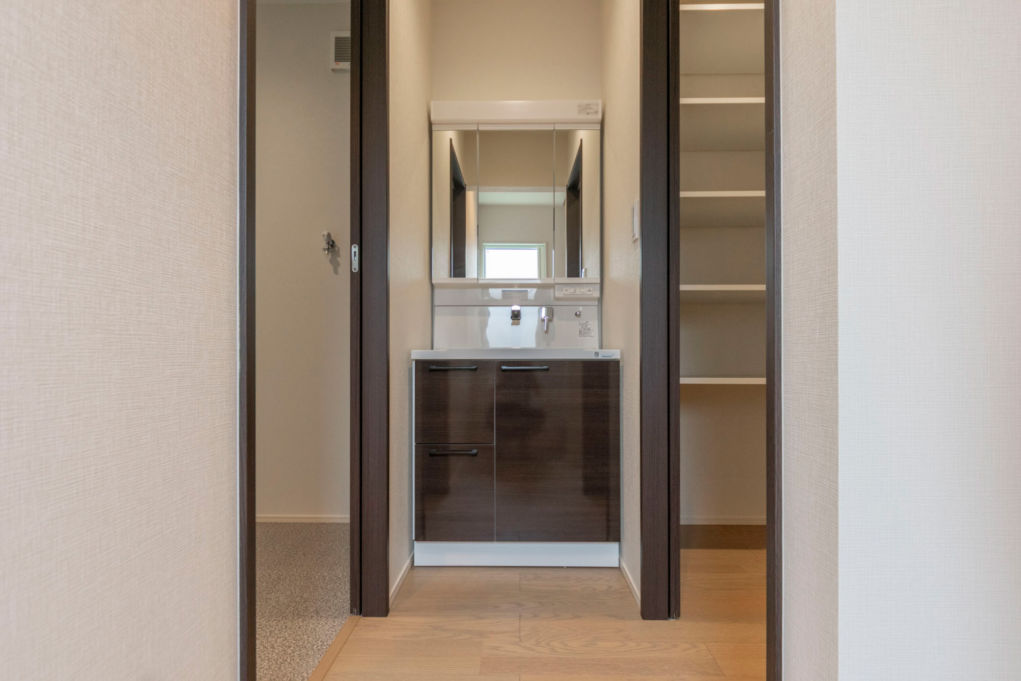 洗面(AICA):引き出し付き、収納棚付き。優しい木目柄の洗面とモルタル調のクッションフロアで和モダンを演出しました。 ・鏡(カワジュン):大小2枚。一人は立って洗面ボウルを使い、一人は座って化粧することもできます。お年頃のお子様が髪の毛を巻くのに洗面台を占領し、朝の洗面渋滞が起こることもありません!