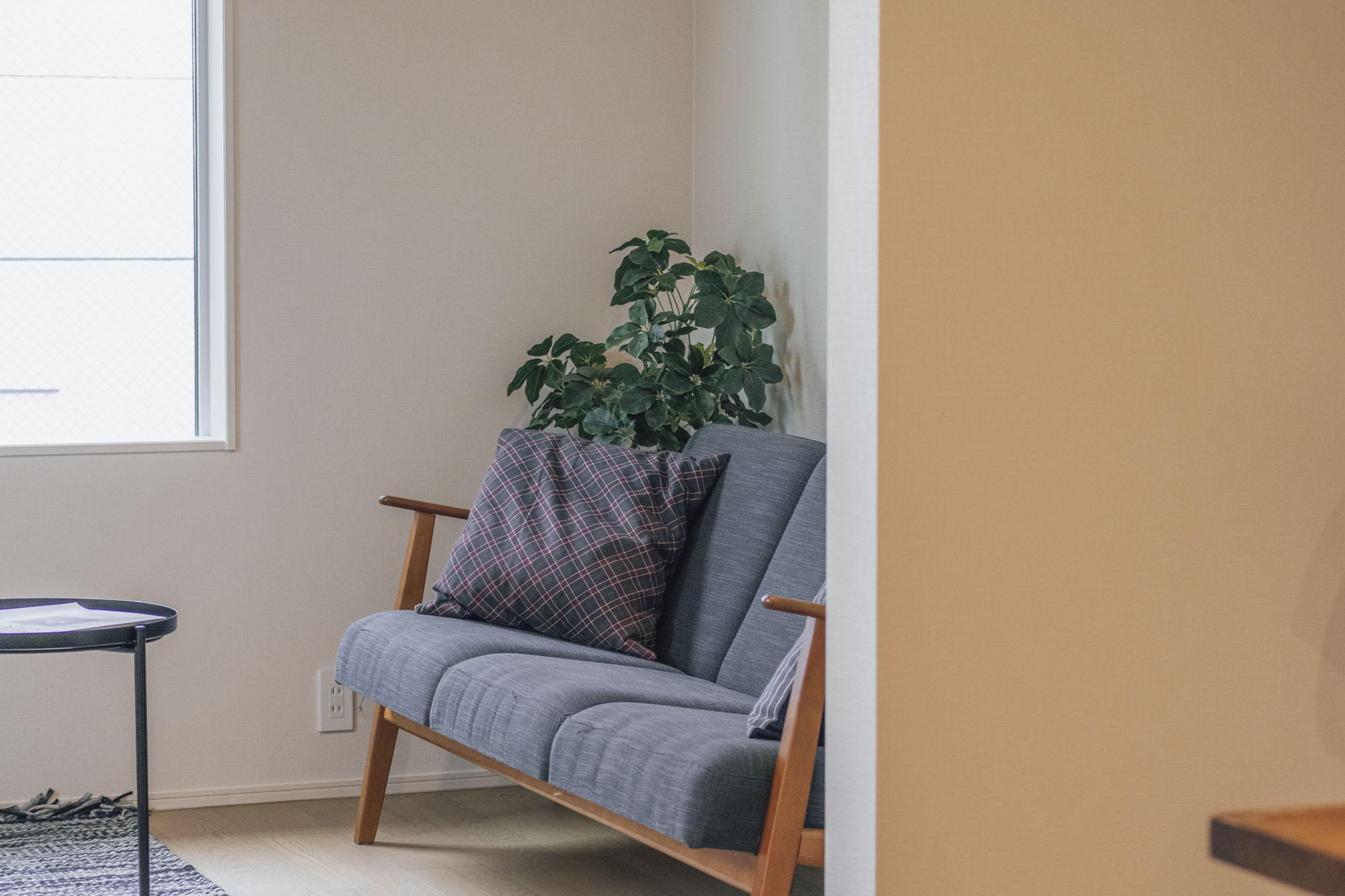 狭小地だからこそ活きる、無駄のない設計。間仕切りの一部を格子と柱にしているので、 お父さんはリビングでテレビ鑑賞-お子さんはスタディスペースで勉強-お母さんはキッチンで夜ご飯の支度と、家族が一つの空間でお互いの空気を感じることができます