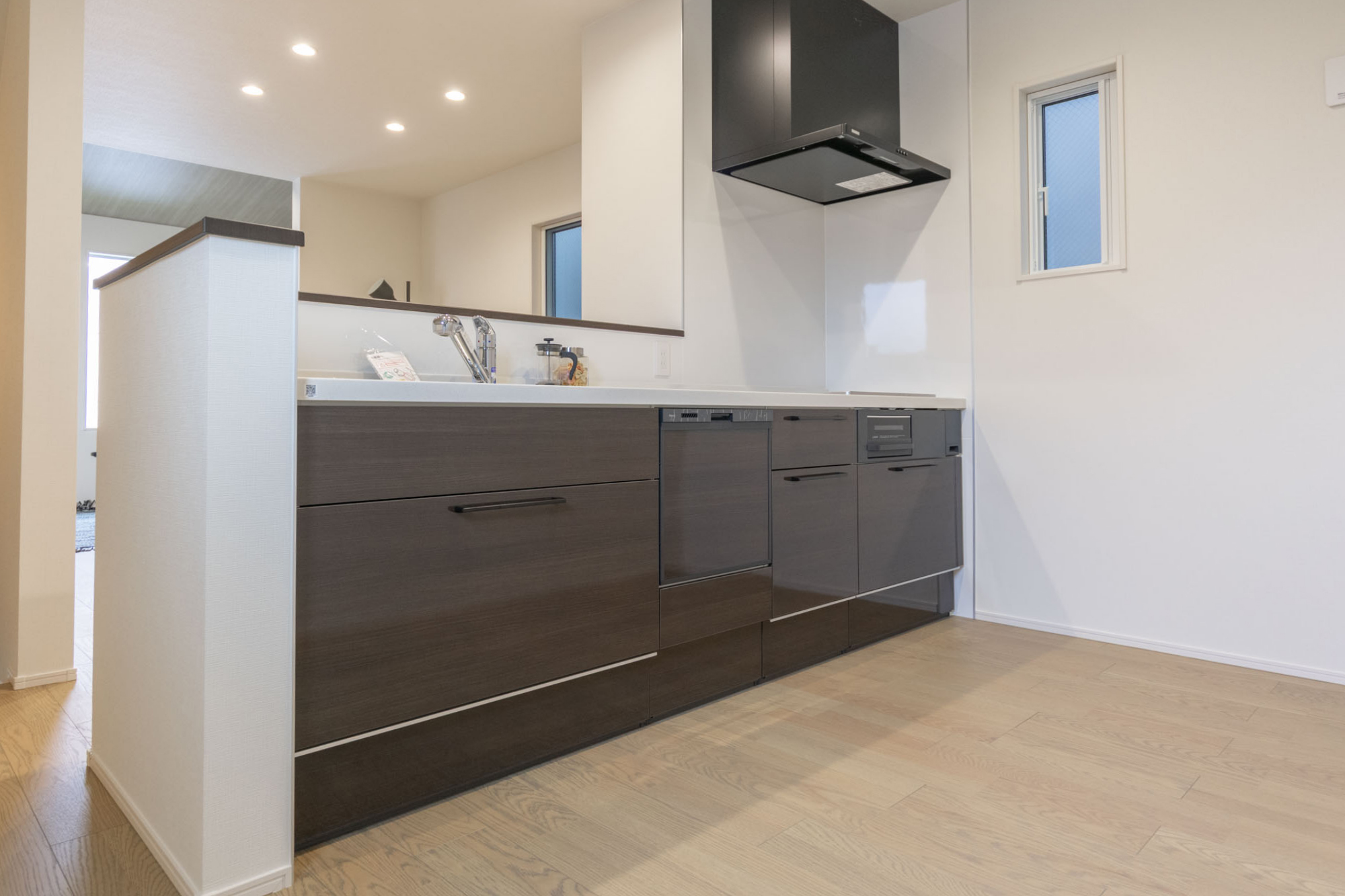 外壁はぺブルという、細かくちりばめた石をイメージした意匠が特徴のサイディングを使用しました。落ち着いた色味のシルバーグレーと、チェリーウッドの格子が京都の街並みになじみます。