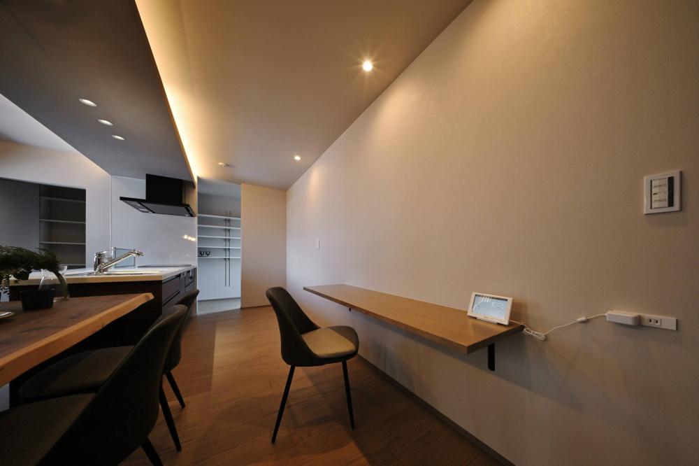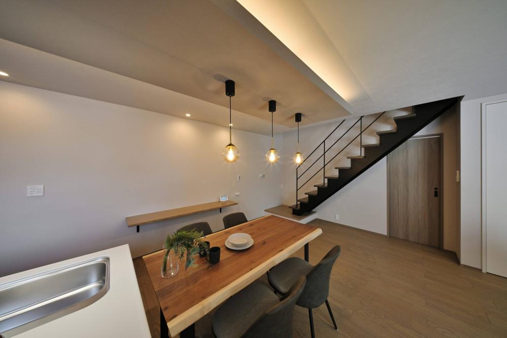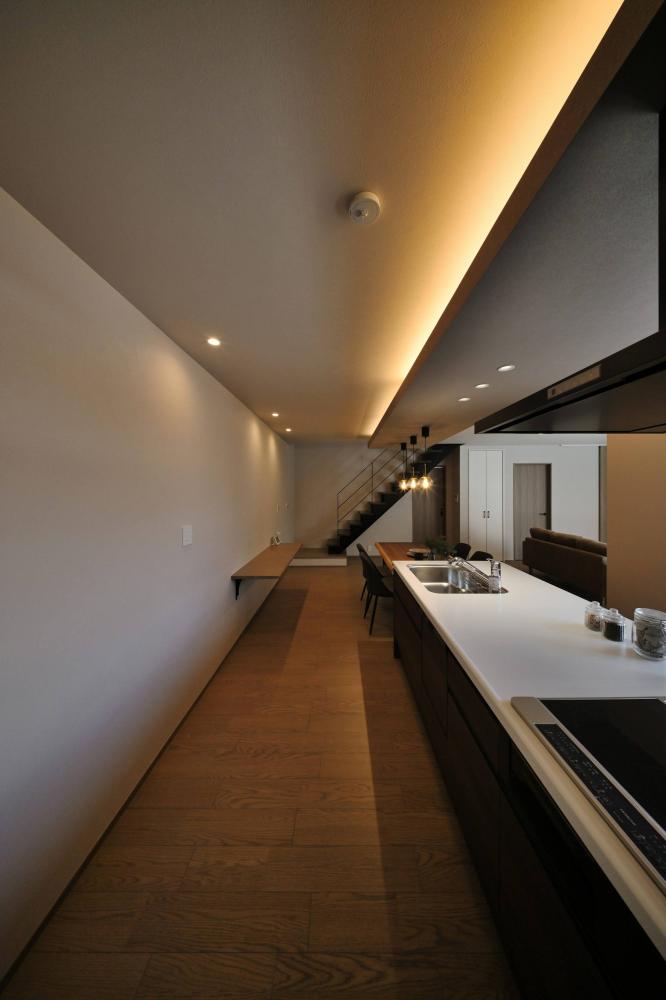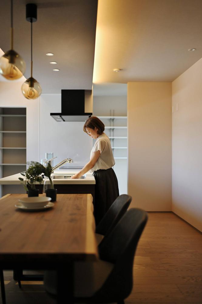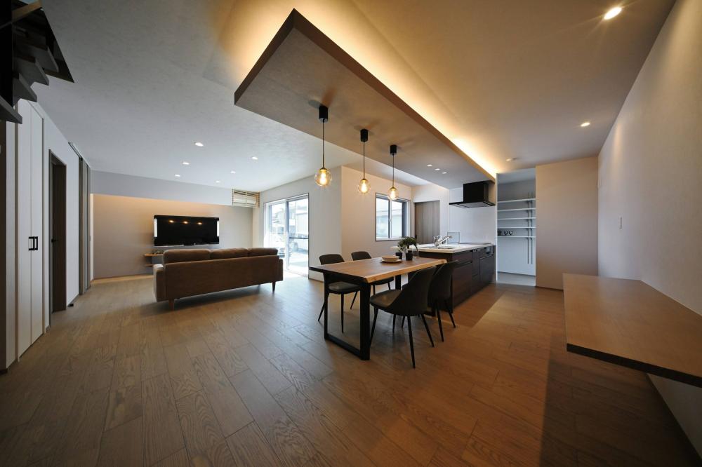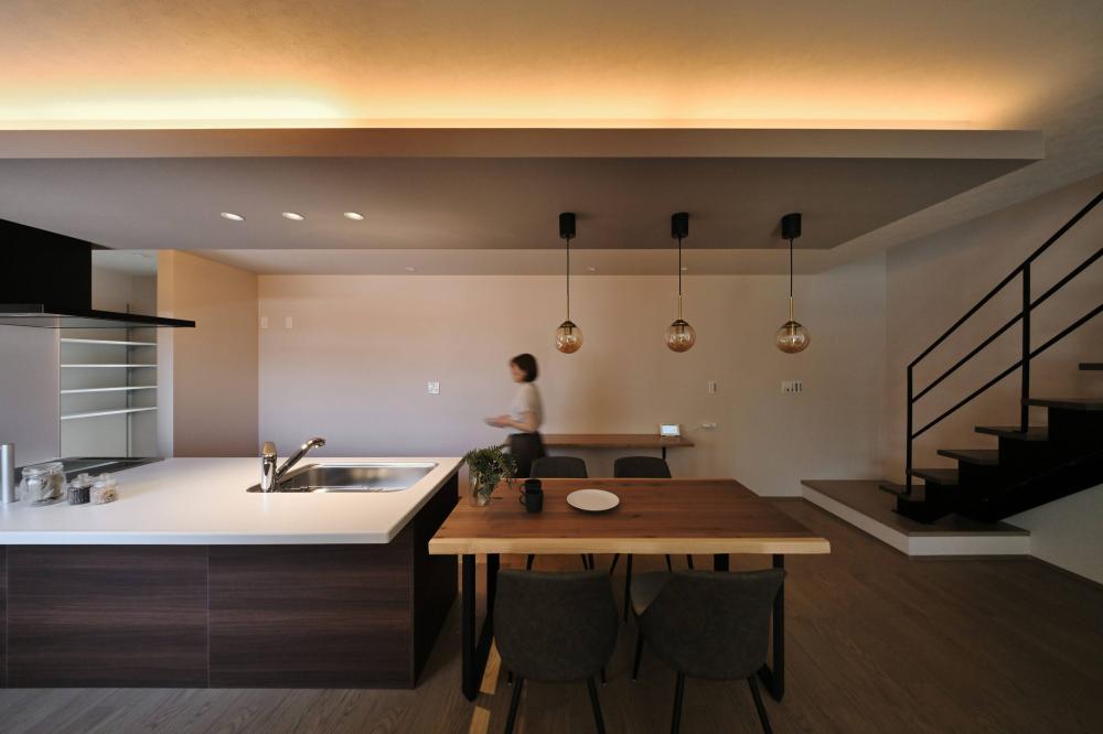 下がり天井と間接照明が、食卓に落ち着きを添える。家族が自然と集まる、横並びのダイニング。