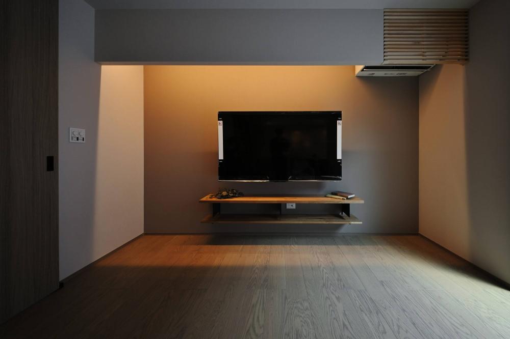 生活感を抑える工夫が、空間に余白を生む。壁掛けテレビと格子で、整うリビング