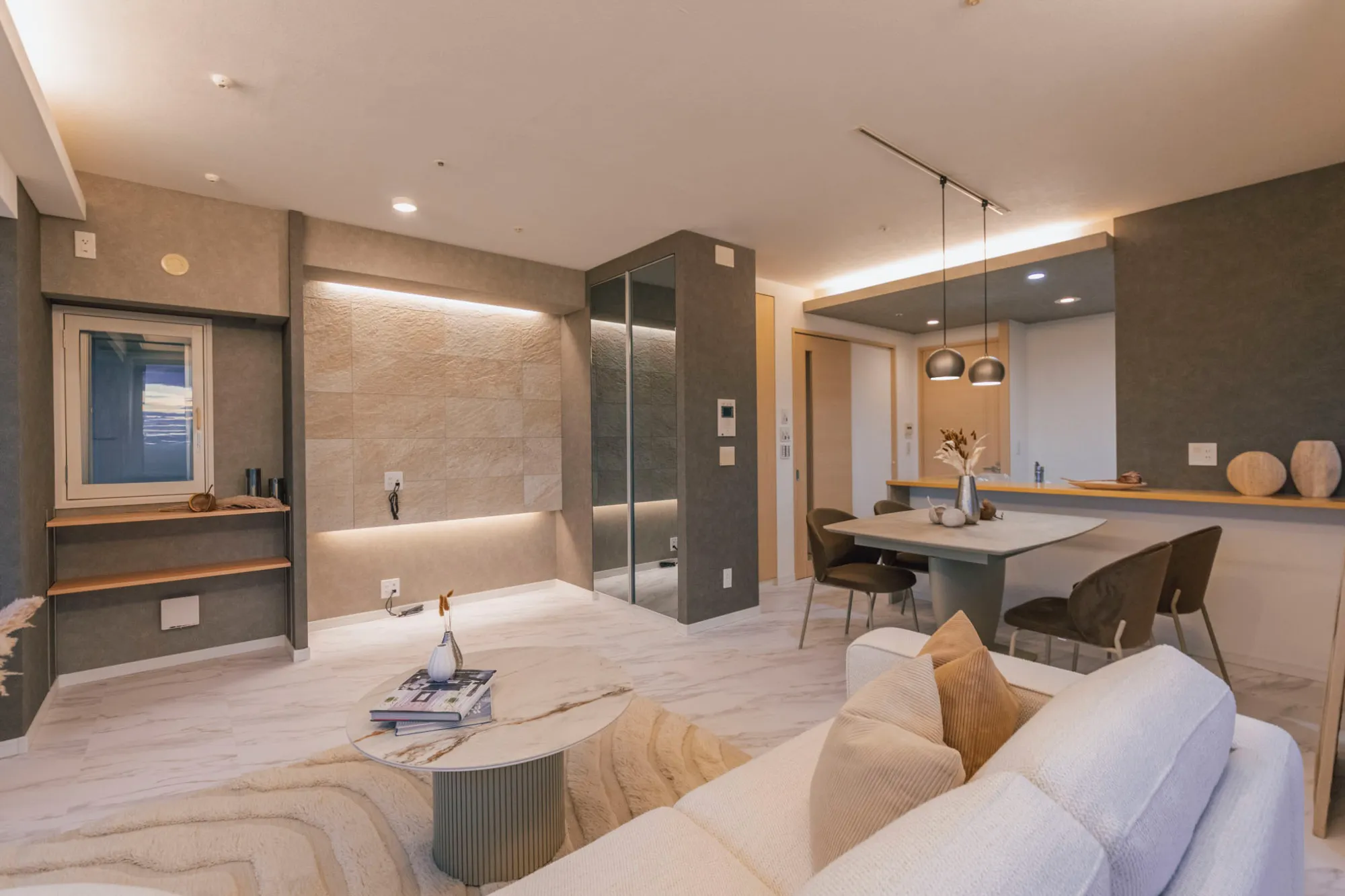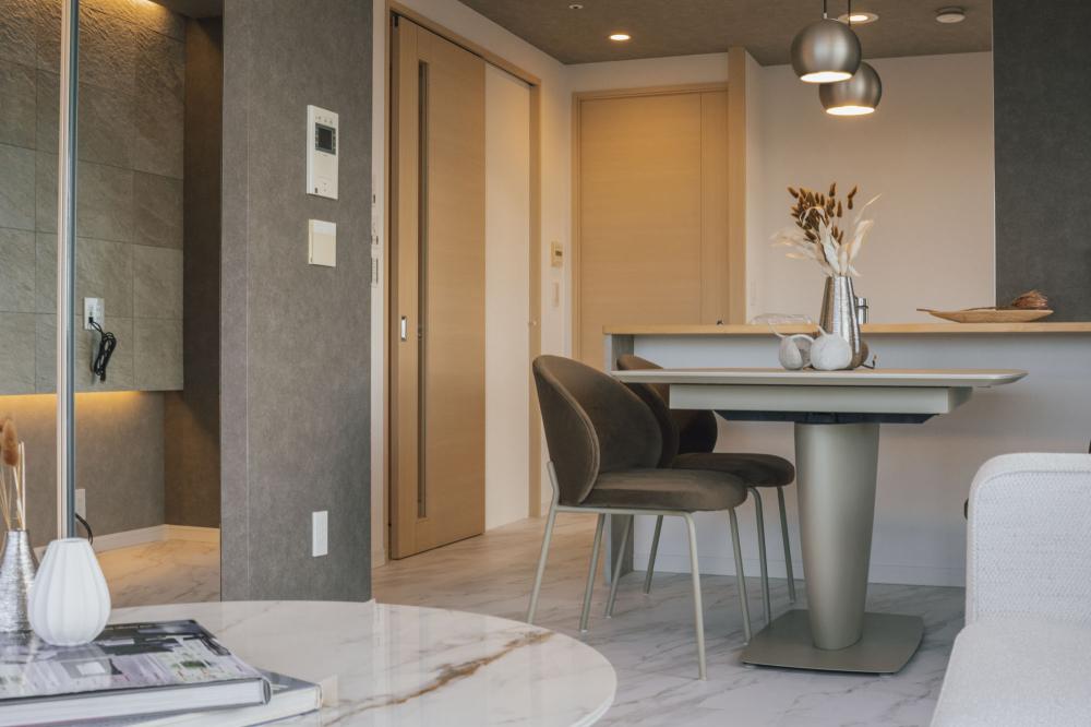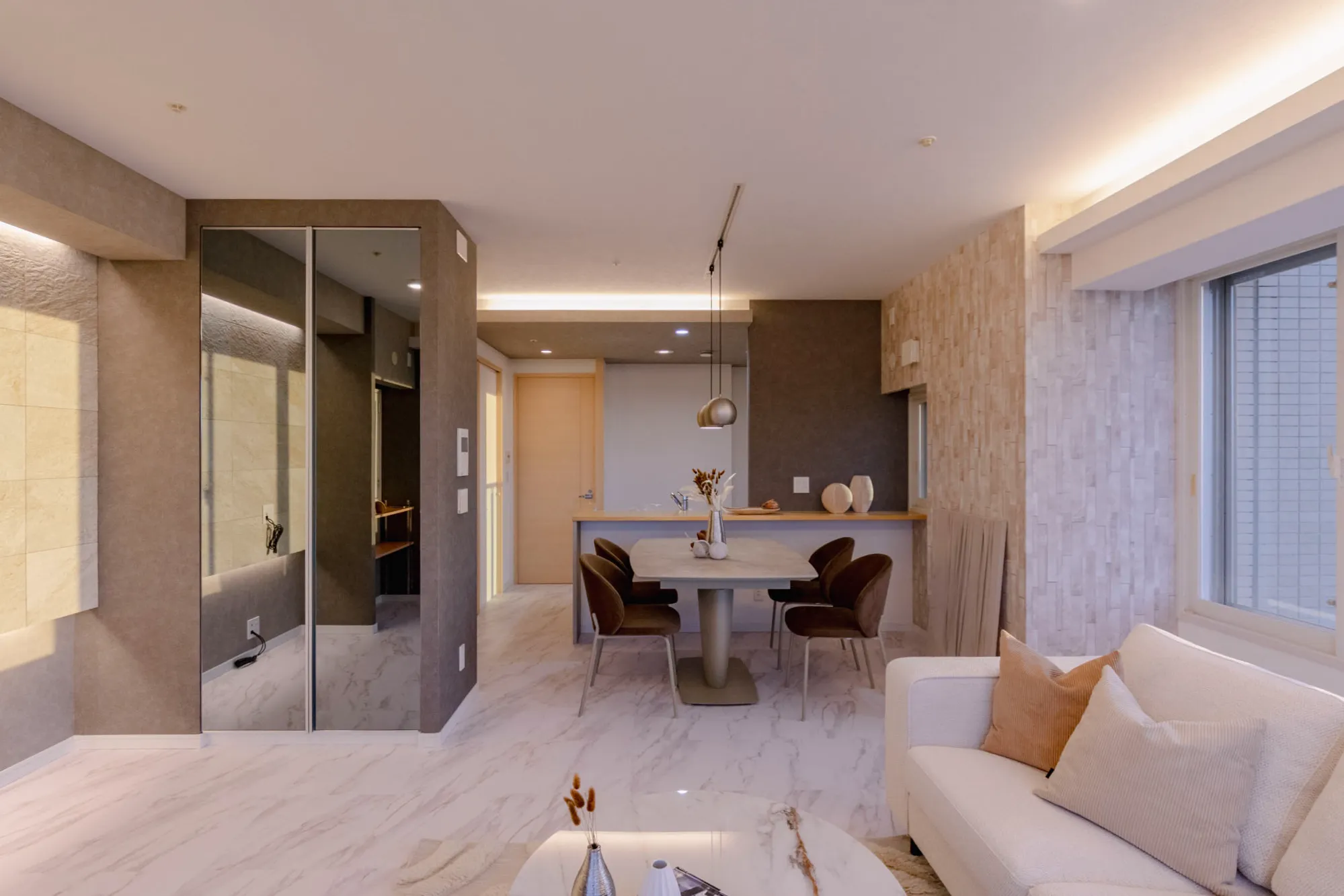 ナチュラルな色調、大理石調フロア、デザイナー家具が調和した洗練されたモダンエレガンスなインテリア