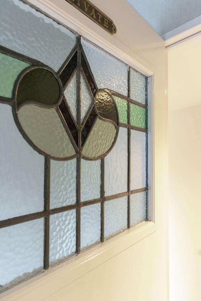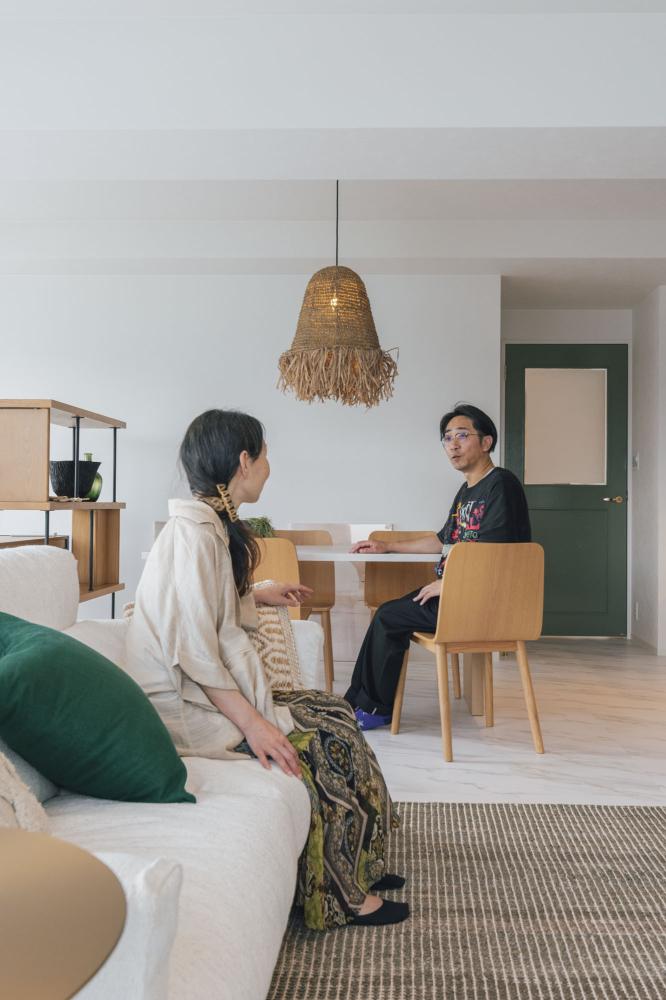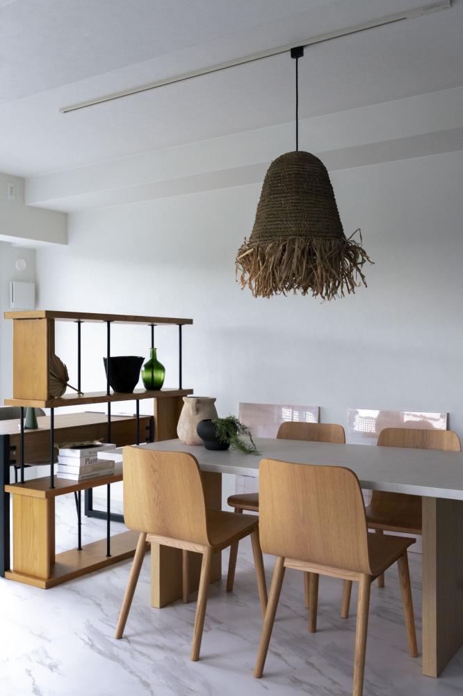 ナチュラルになりすぎて高級感が薄れないようにと、既存建具のステンドガラスがかわいかったのでそれが映えるようにと床や壁などベースとなる部分は白ベースのシンプルでモダンなテイストにし、家具や小物で自然素材をふんだんに取り入れリゾート感を演出しました。