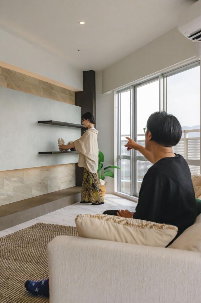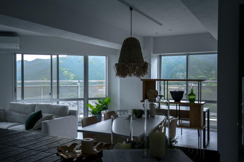 使わないホビールームを取り込むことでスペースと窓面を増やし、広々と開放的なLDKに。窓からみえる山並みと琵琶湖をインテリアの主役に!このサイズのLDスペースと窓面を確保できることは珍しいので、かなりのゆとりの贅沢感があります