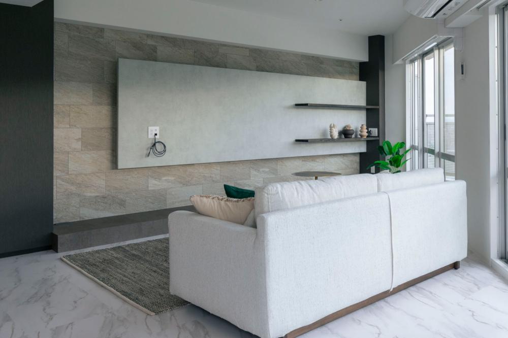 TV面はリゾートホテルのロビーの暖炉でほっとするようなくつろぎを演出しています。マントルピースをイメージさせるタイルと下台と間接光でデザインしました。
