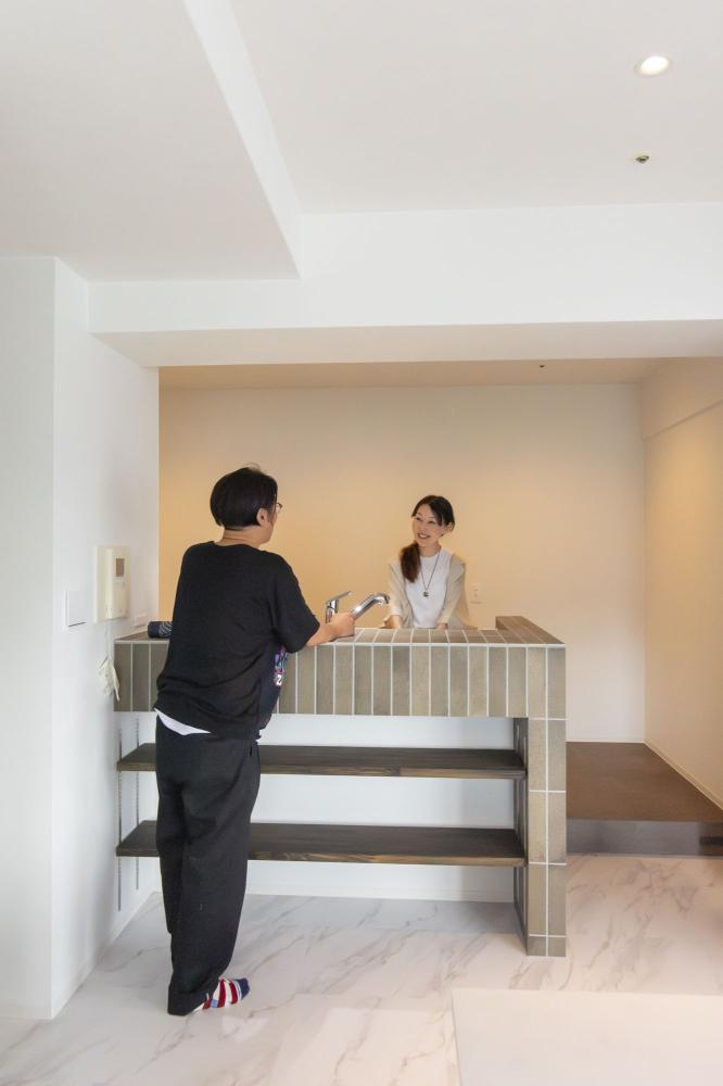 光が届かず陰気だったキッチンを対面にし、パントリースペースも充実させました。うれしい2way。タイルで造作リゾートキッチンにみせかけておしゃれに。嫌厭してたキッチンなのに…思わずキッチンへも行きたくなります!
