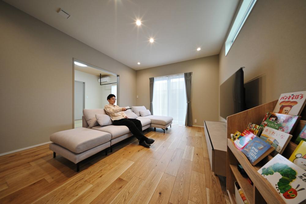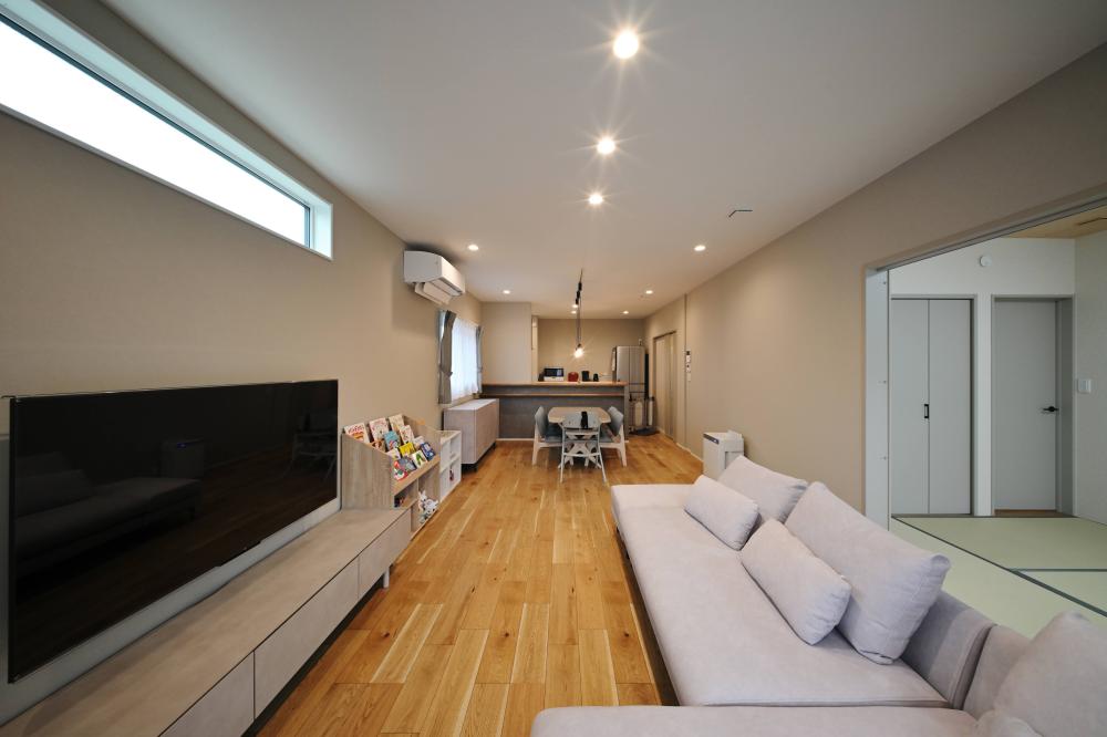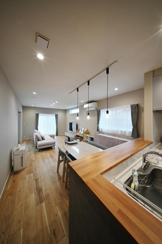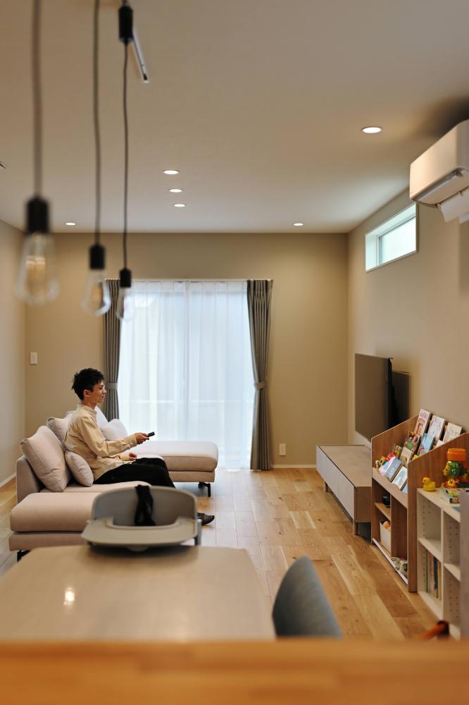 あえて真っ白なクロスを使わないLDK。グレージュを取り入れ落ち着く空間へ仕上げました
