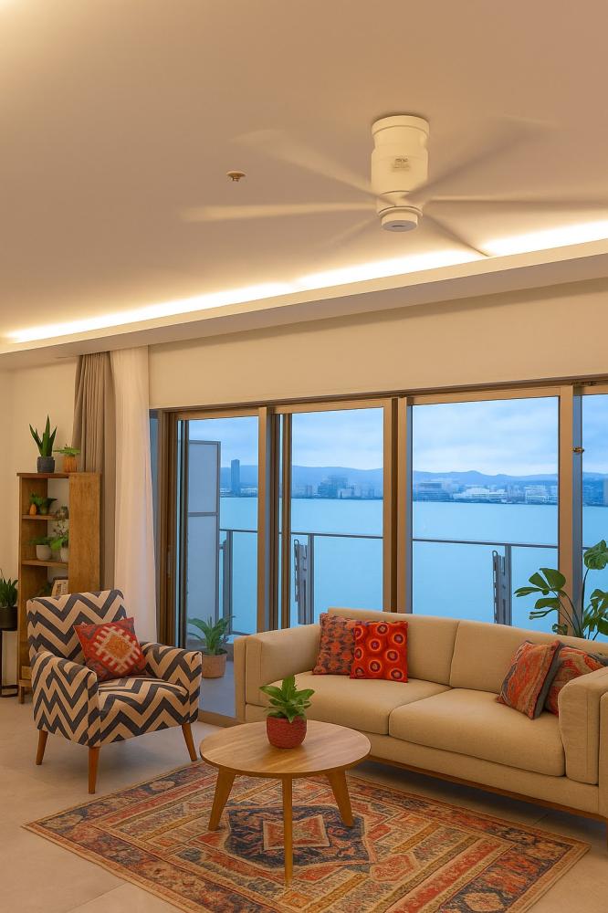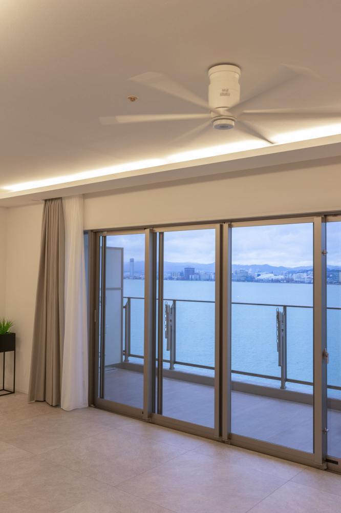 床は大判のフロアタイル。洋室、廊下も同じフロアタイルを使用することで一体感や広さを演出します。窓から見える琵琶湖の絶景とシーリングファンの雰囲気がマッチして最高の空間です