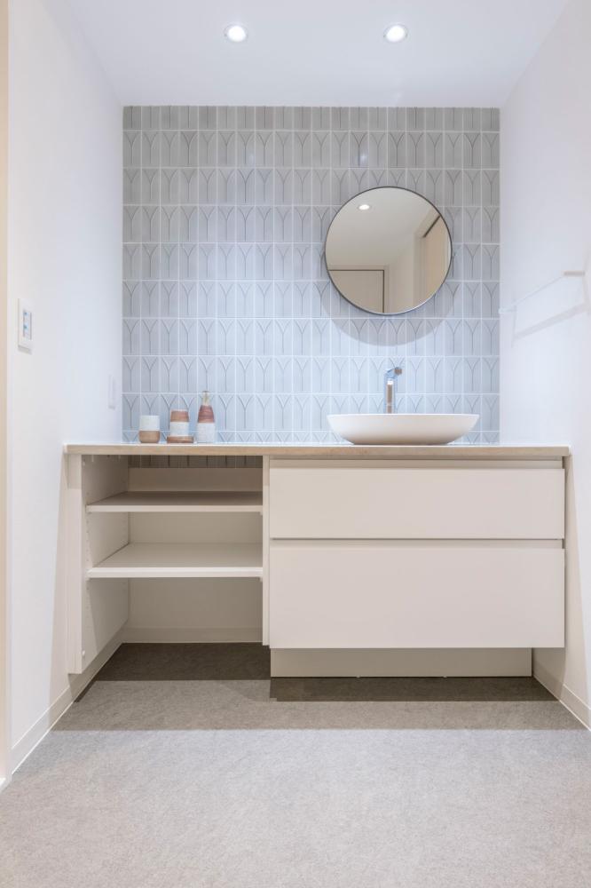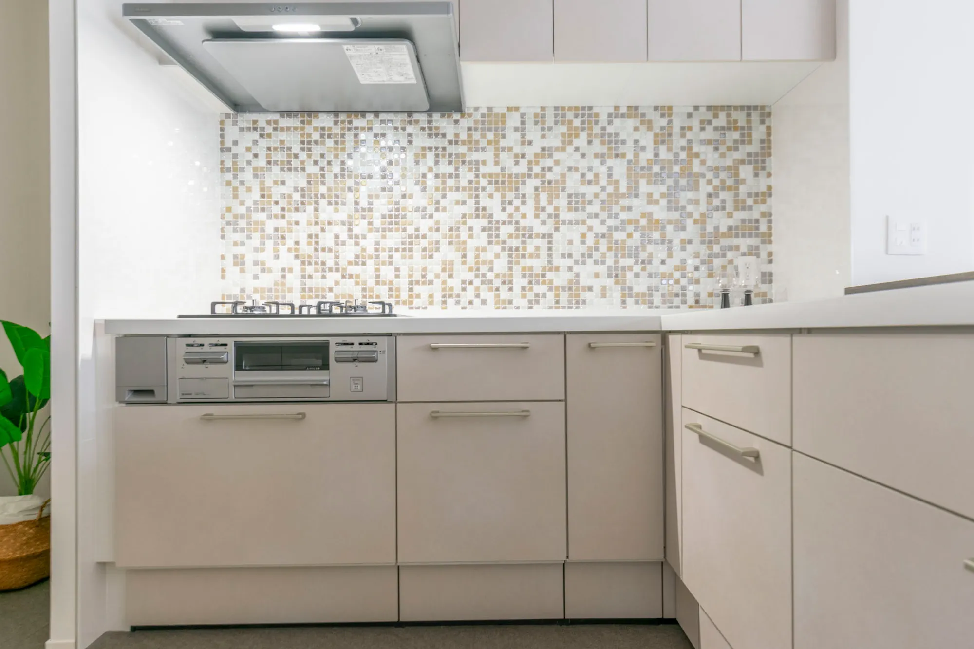 お料理がしやすいL型キッチン。リビング側にも向いておりますので家族の様子がよく見えます。タイルはお洒落なモザイク柄です