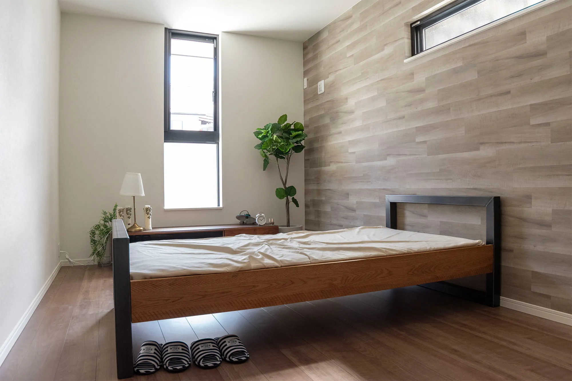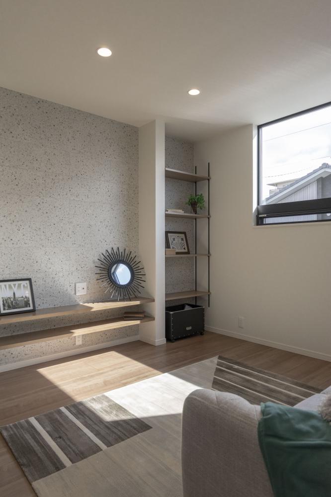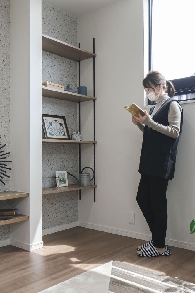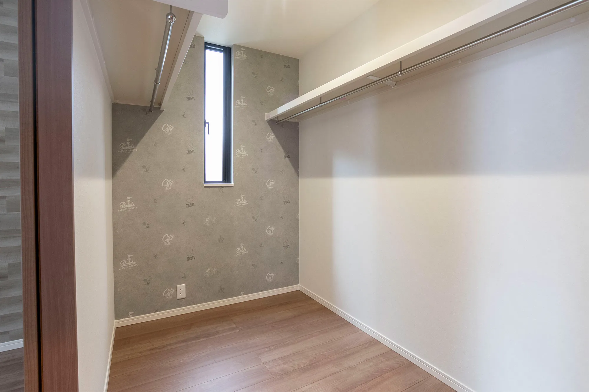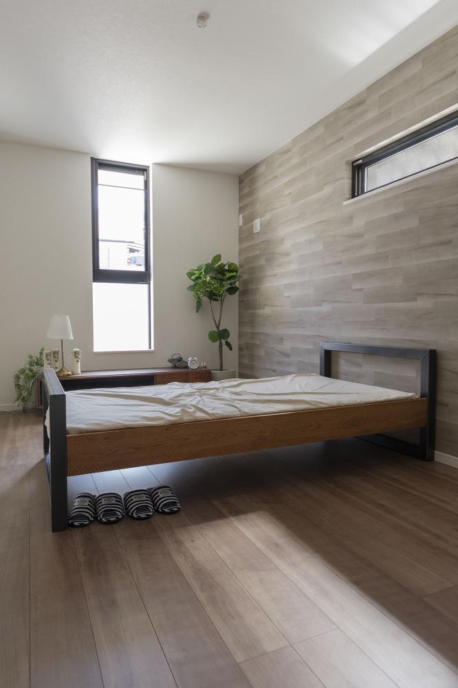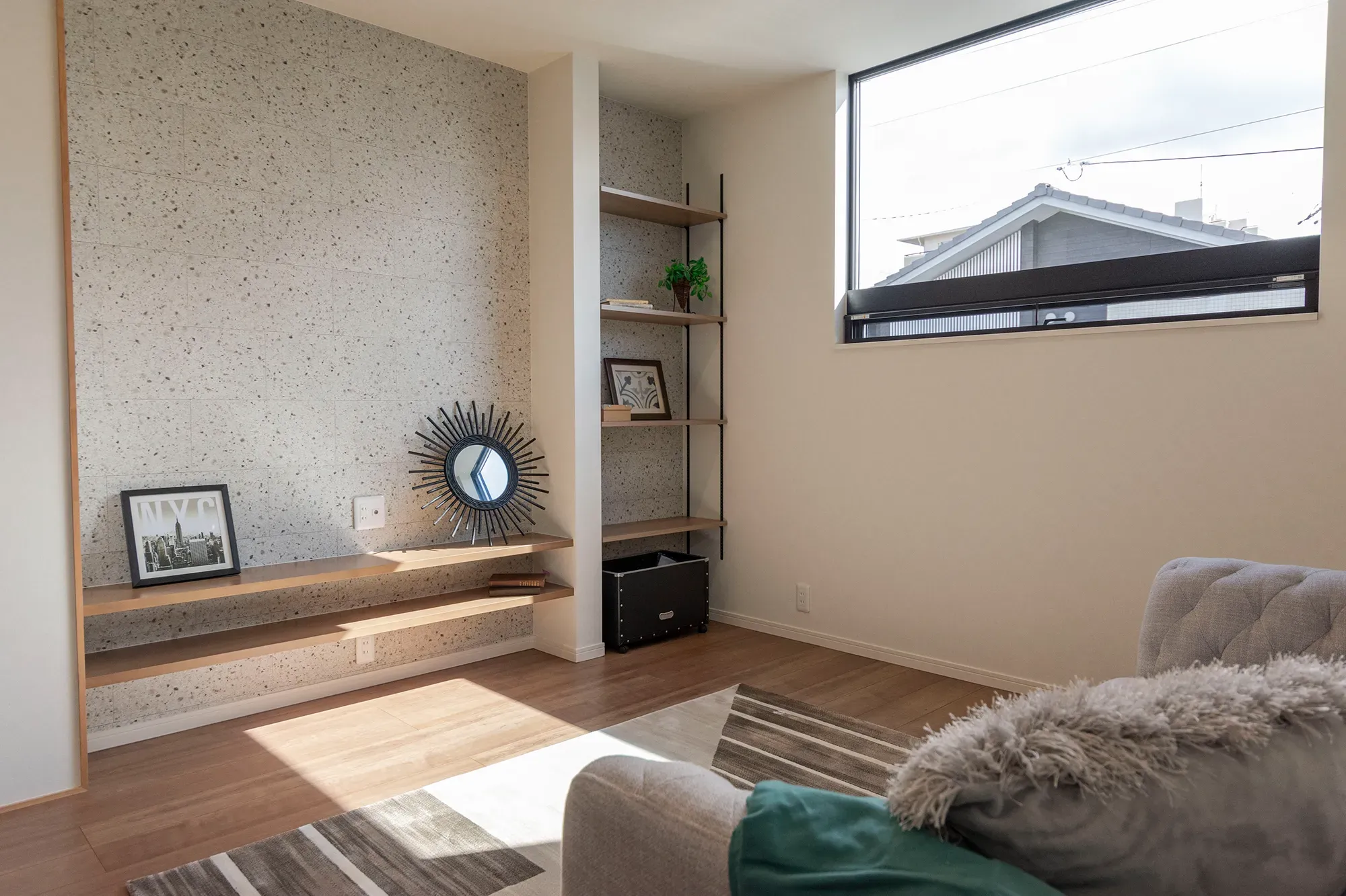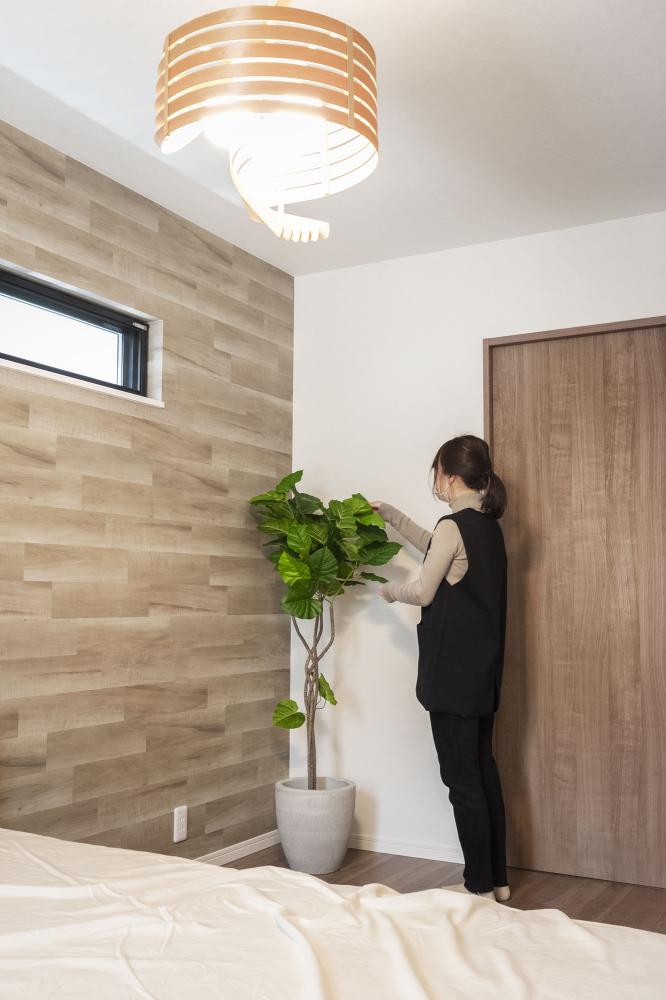 1階の洋室にはおしゃれなアクセントクロスをあしらいました