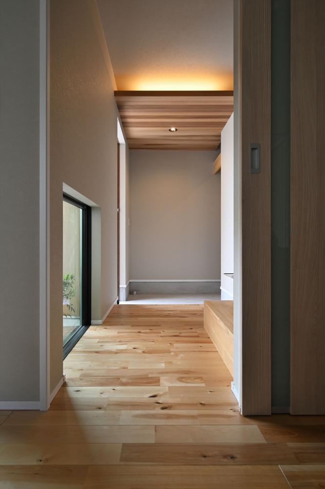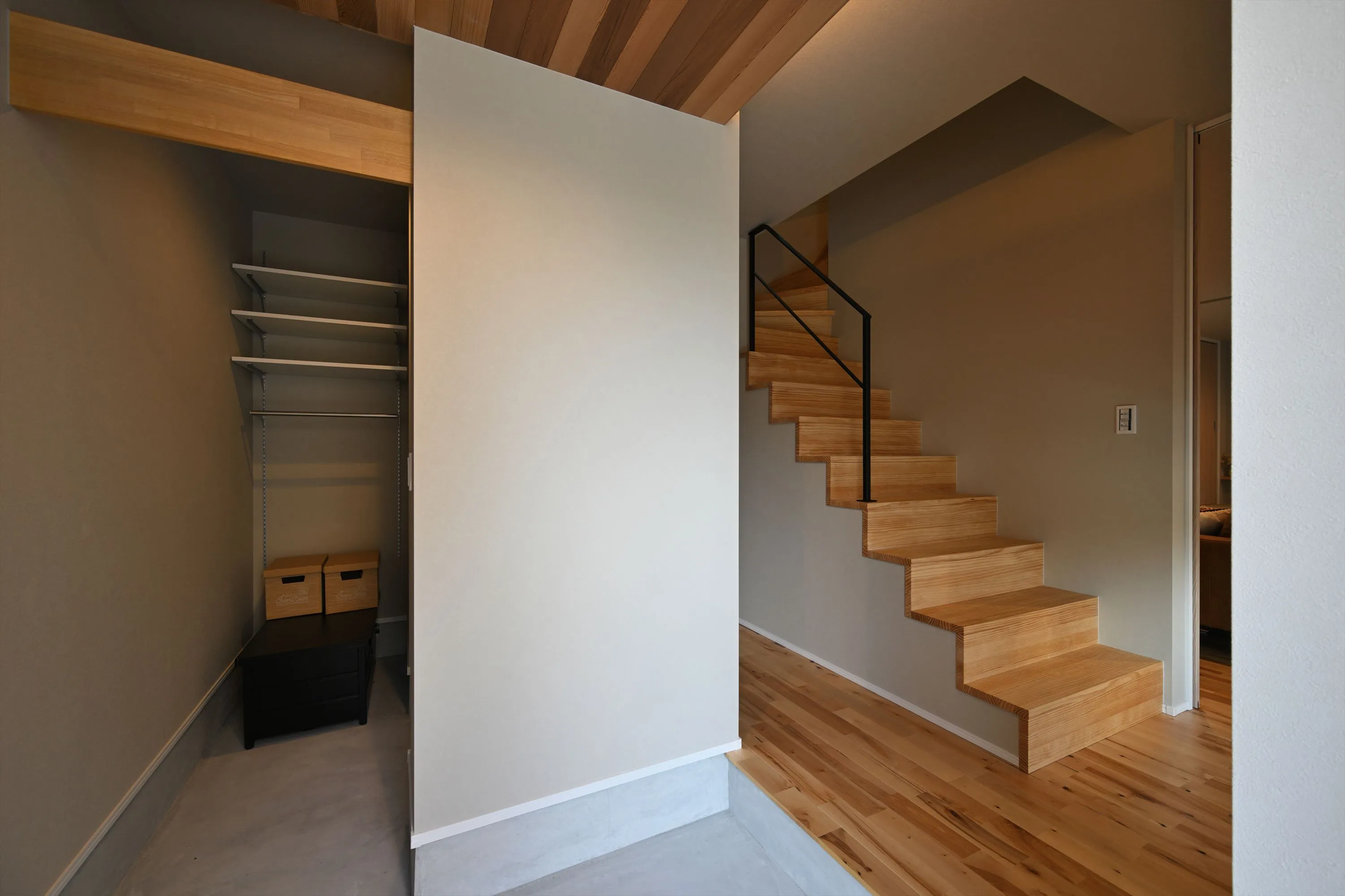 外観だけでなく玄関内部にもレッドシダー。SICつきで長いブーツやベビーカーもらくらく収納