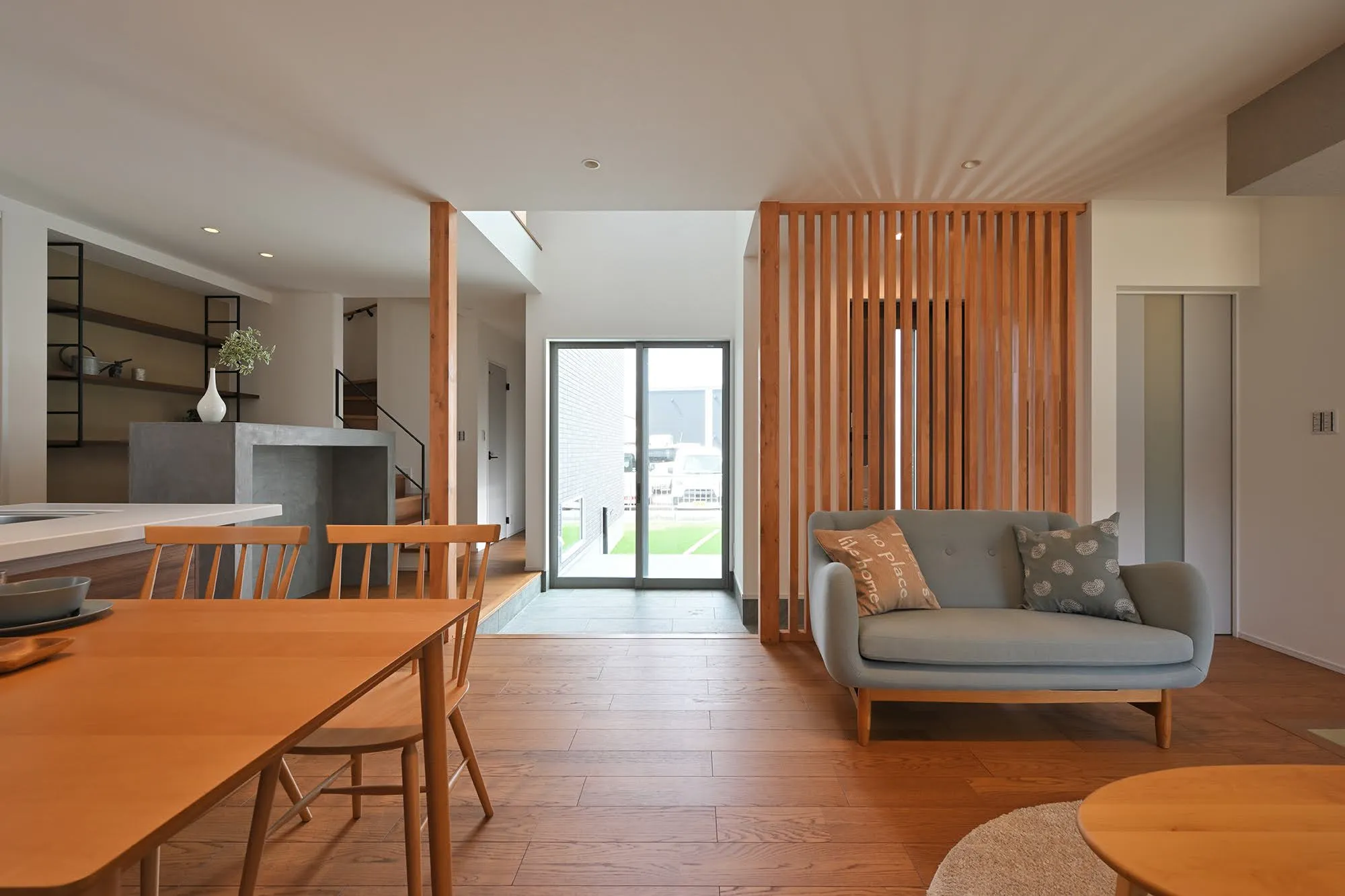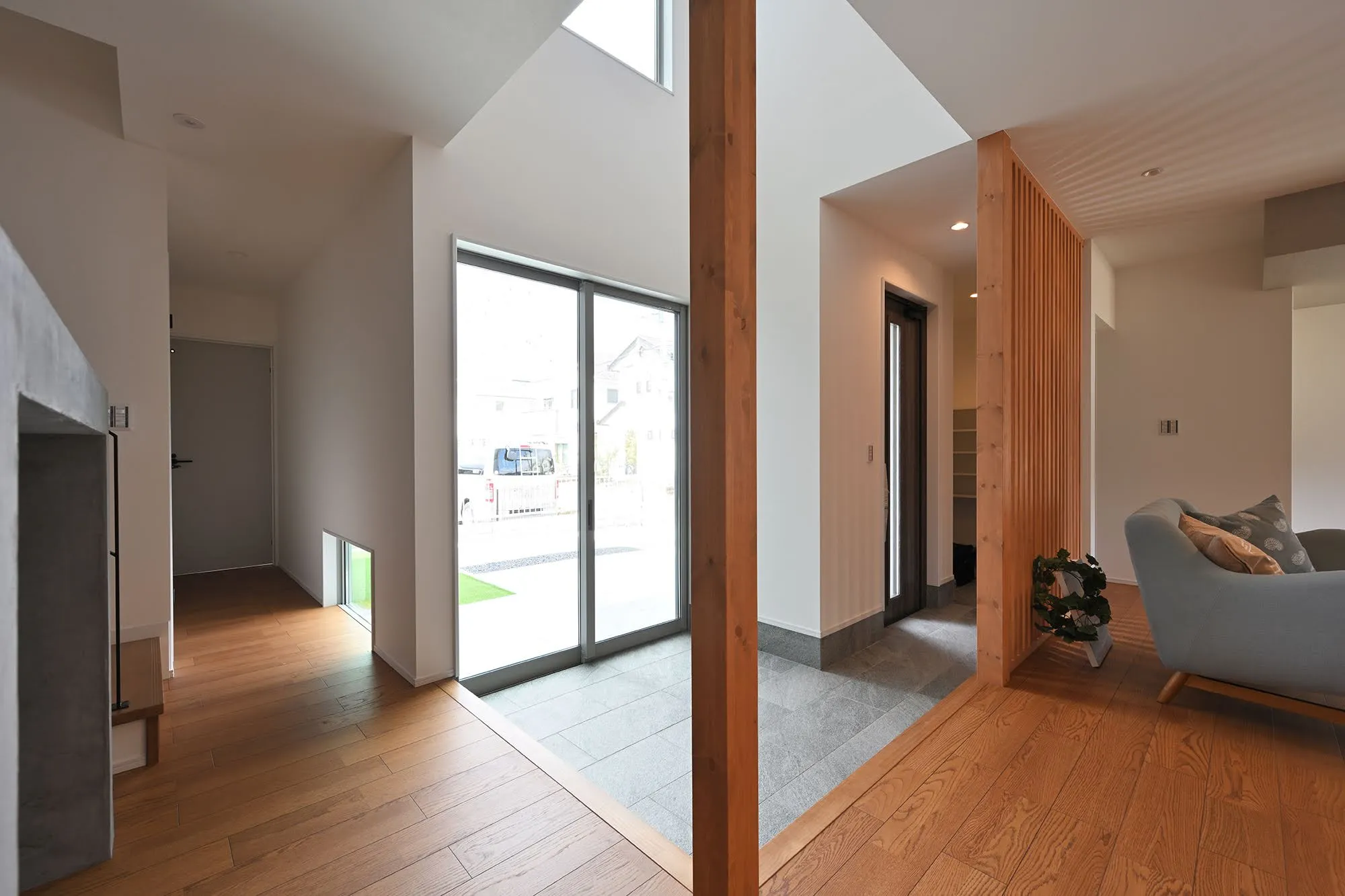 玄関側には格子を設けており、ドアを開けたときの外からの視線を遮ります