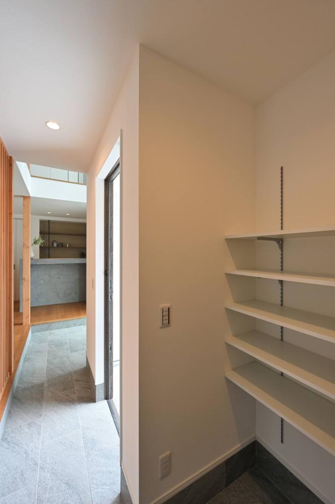 シューズクロークを広くとり、釣り具・キャンプ道具含め収納盛りだくさん。