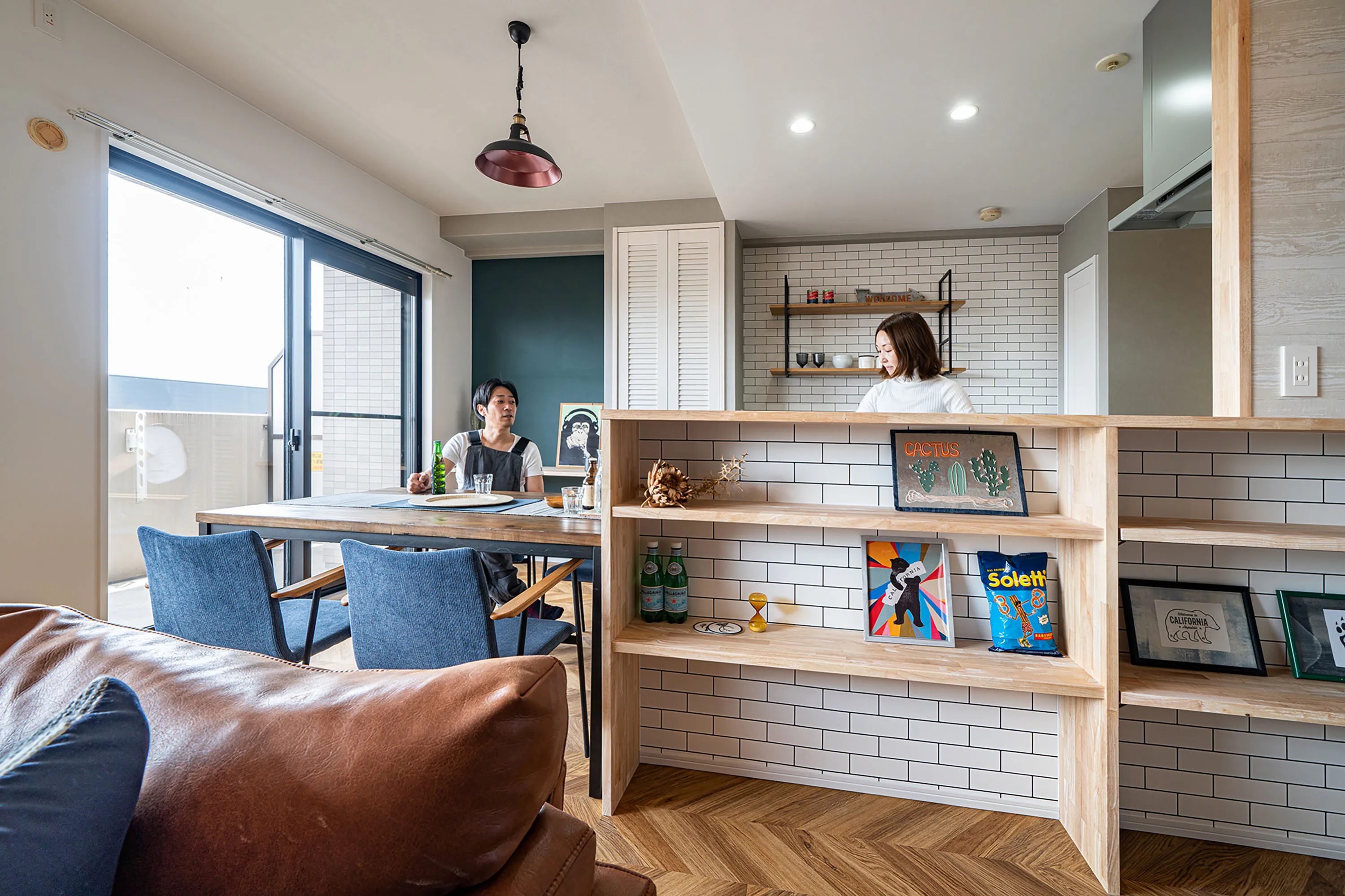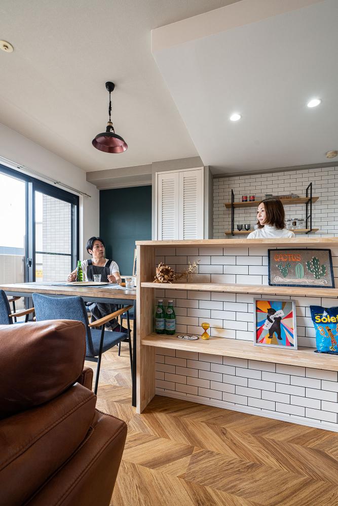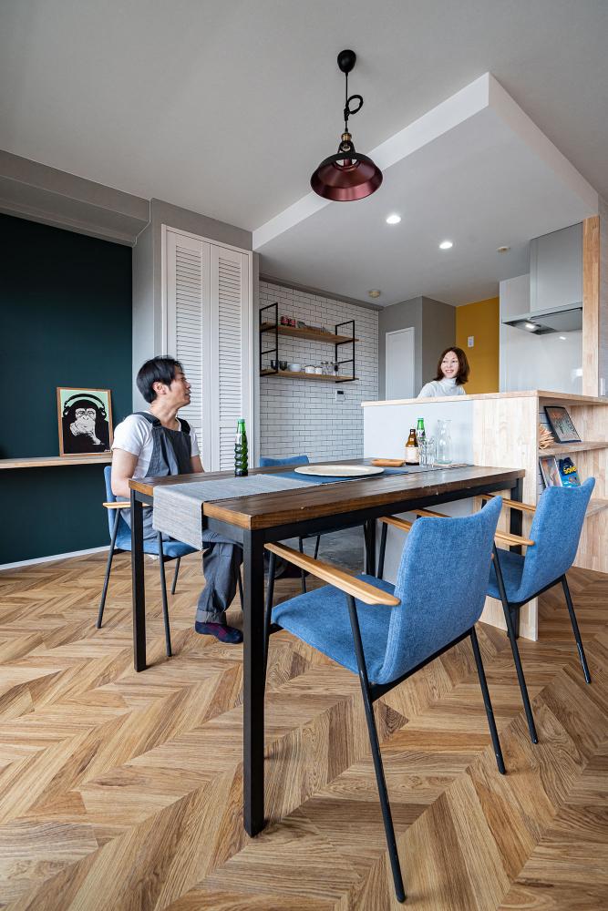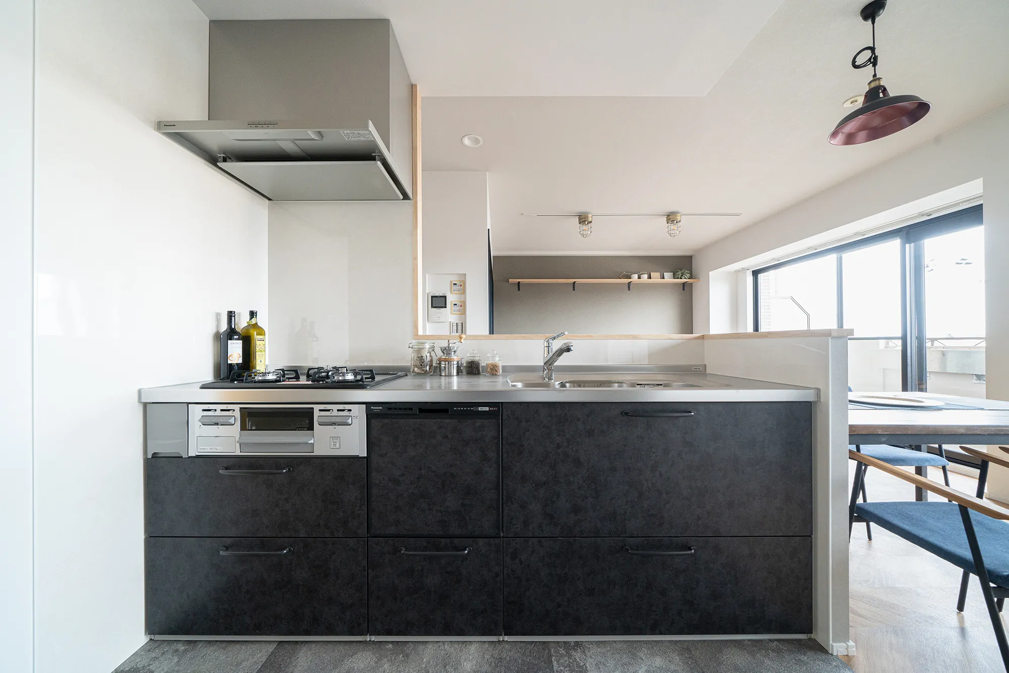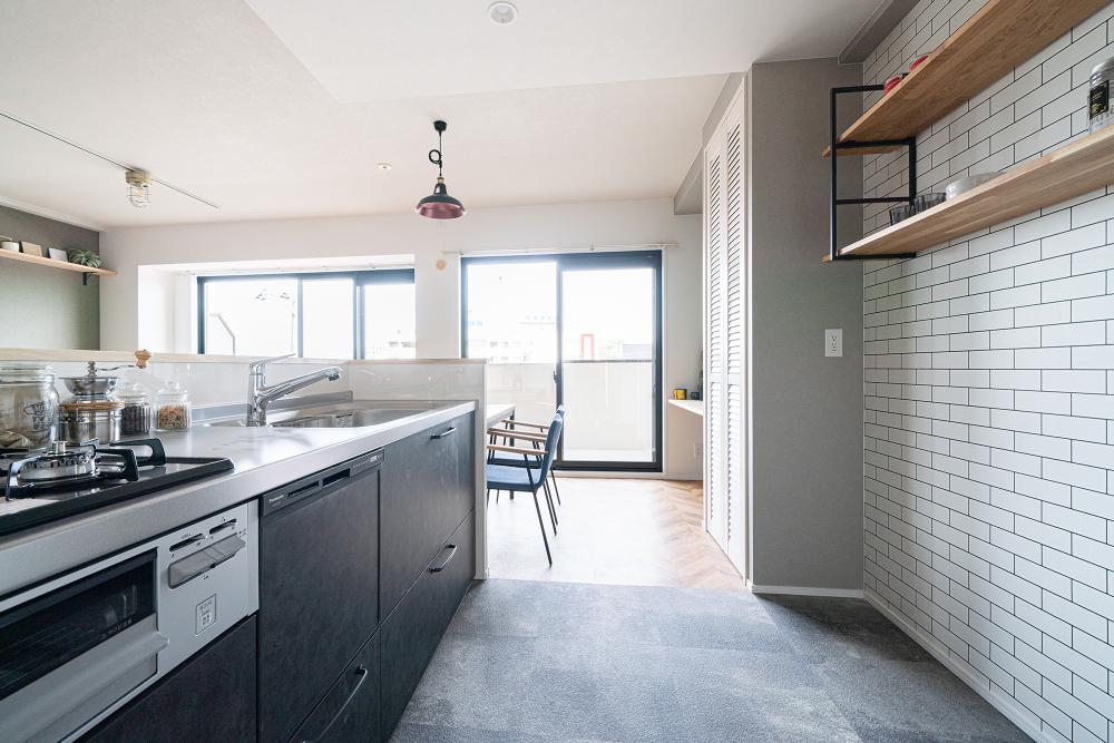 キッチンとダイニングは横並びにしてコンパクトにまとめた。部屋の広さが決まっているマンションリノベーションの中で部屋を広く使える工夫の一つ。キッチンからすぐに料理を出せるので、食事の準備も楽々。