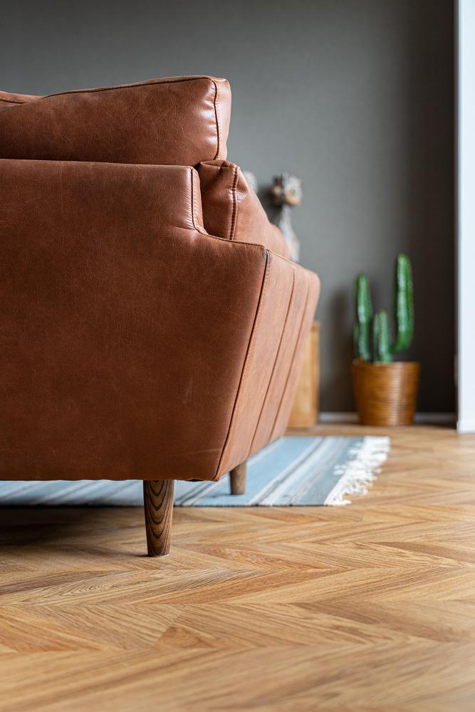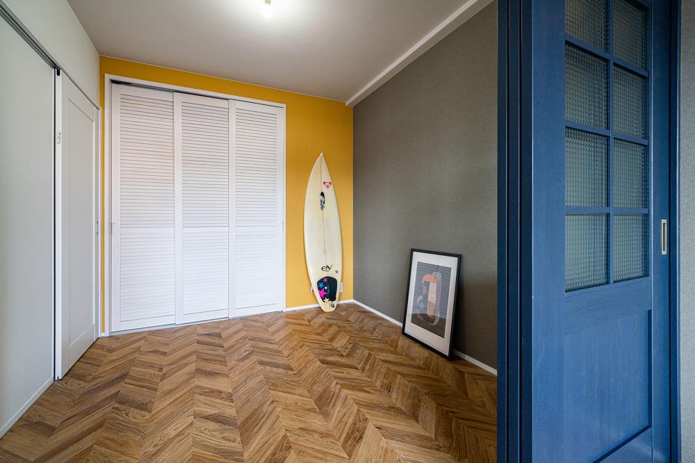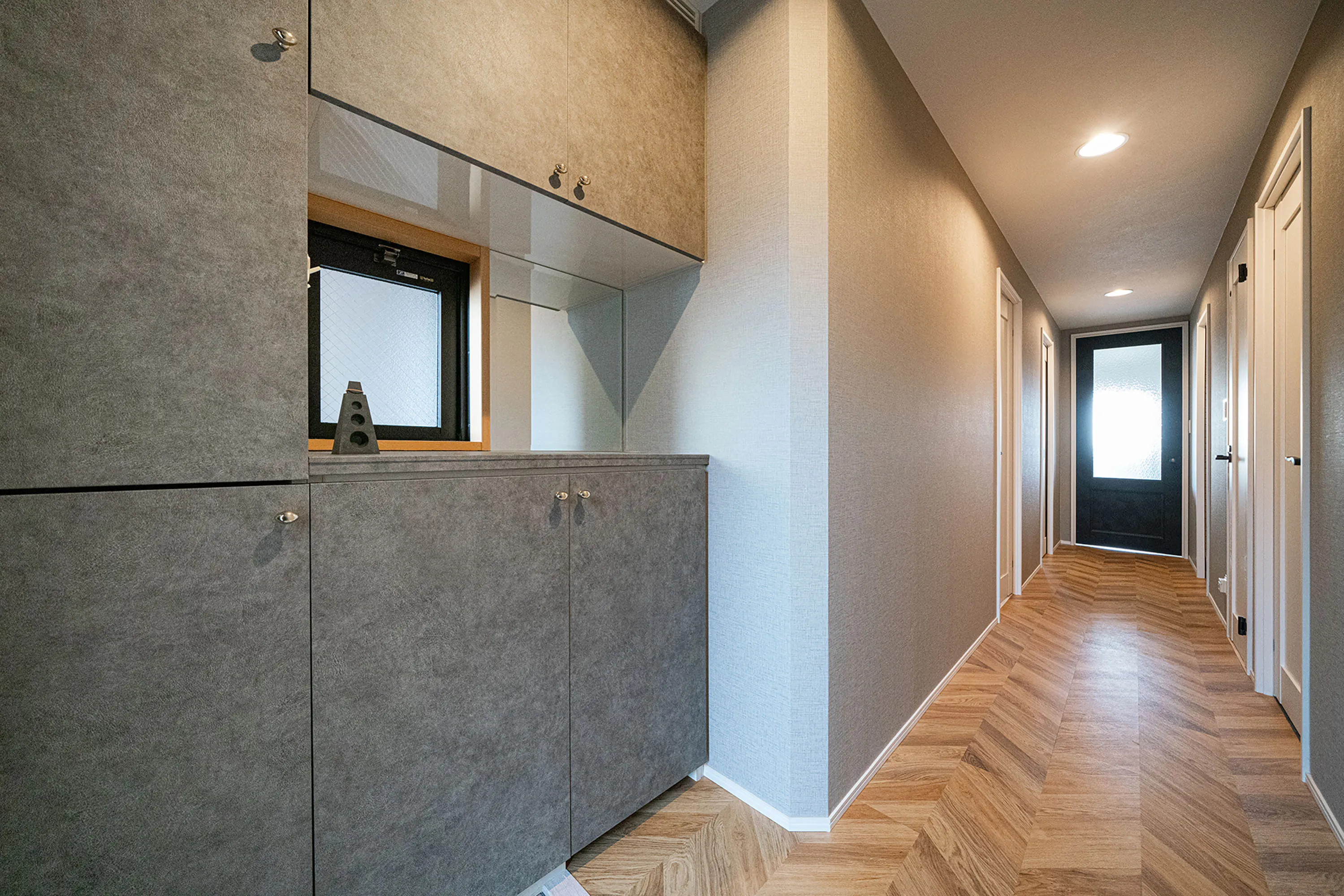 玄関からつづく廊下もLDKに合わせてフレンチヘリンボーンに。サイドのドアをホワイトで統一してホテルライクな洗練された空間に