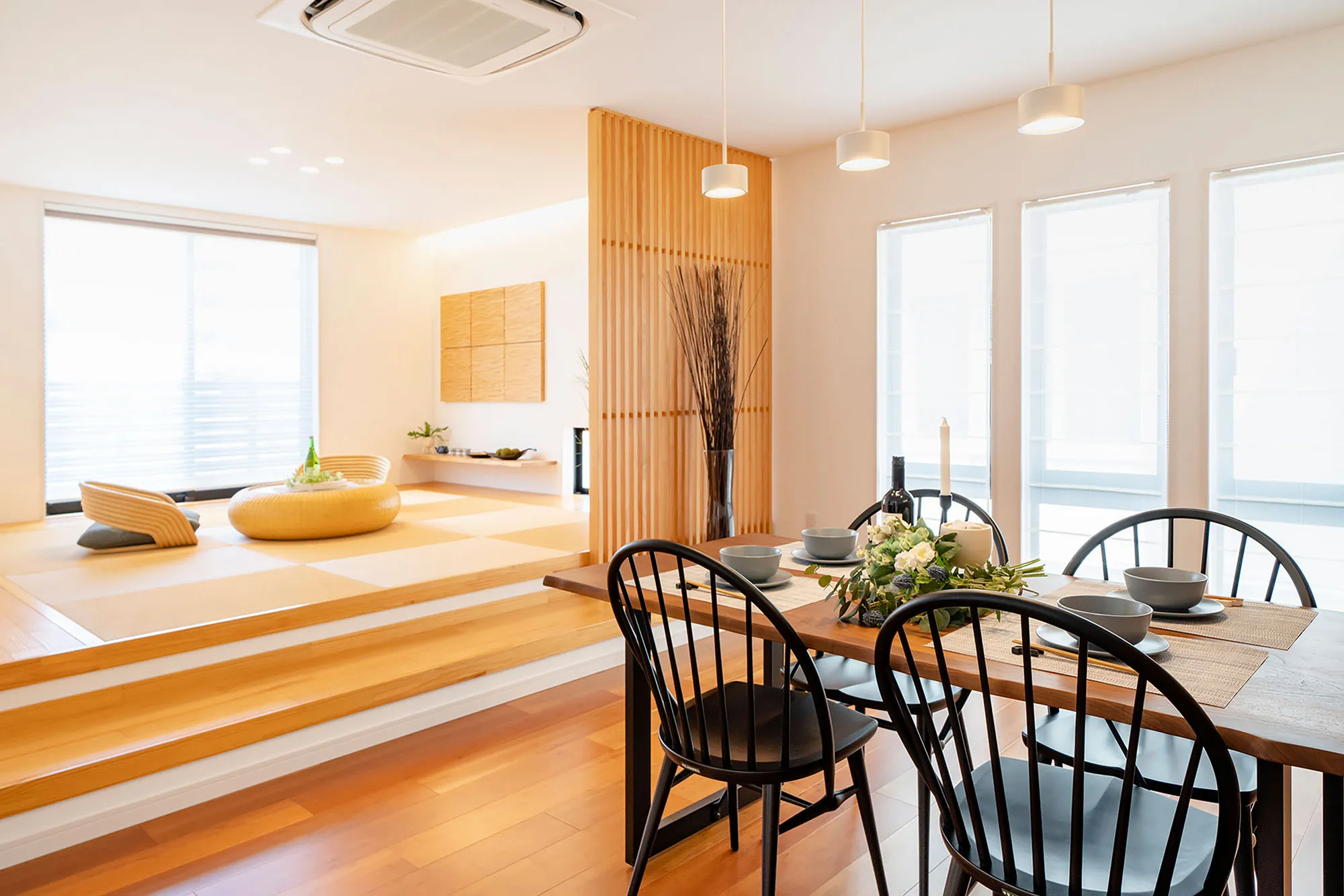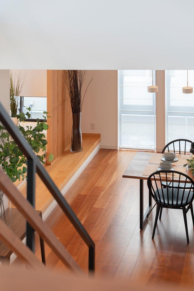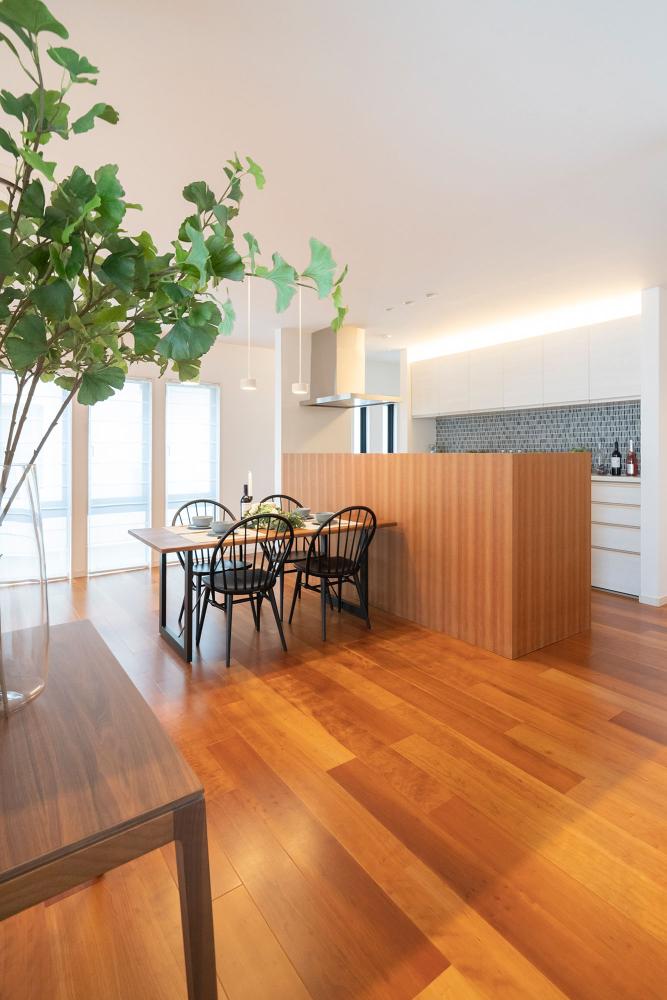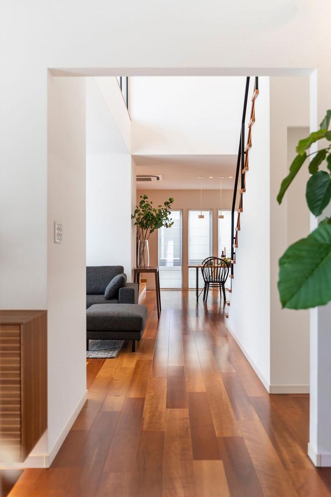 家族の気配やぬくもりを感じやすい、開放的で回遊式の間取り。収納や高低差を利用したゆるやかな空間の仕切りは暮らしに心地よさを感じさせてくれる。全てをオープンにつなげることなく、みせる空間と隠す空間を織り交ぜる事で、生活感を抑えホテルライクな暮らしを実現する。