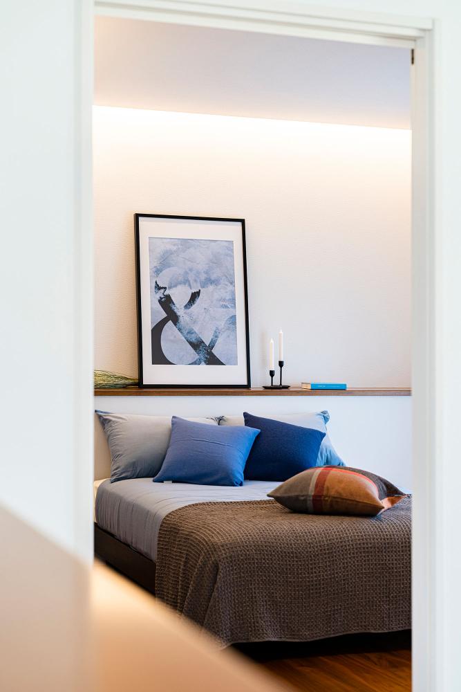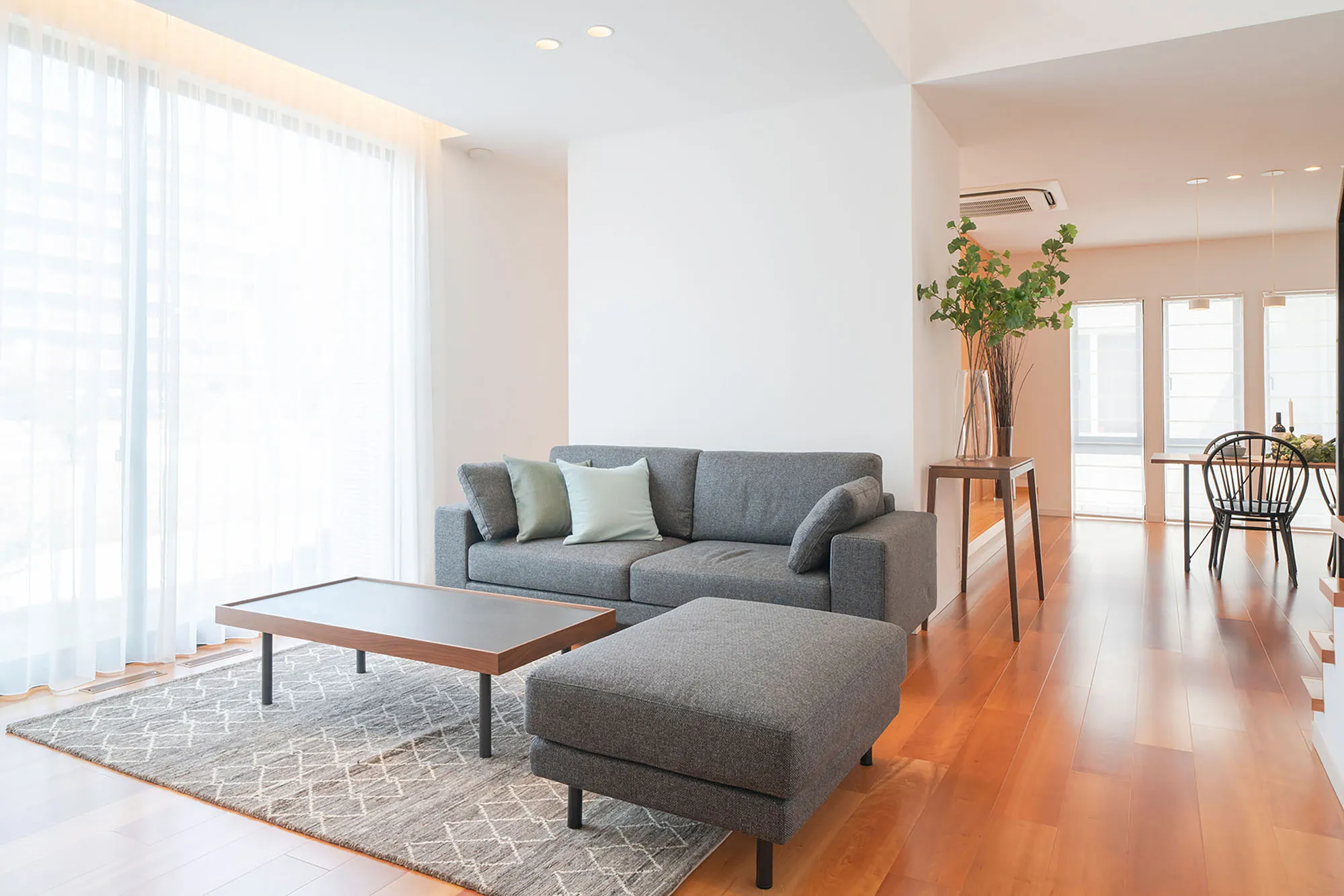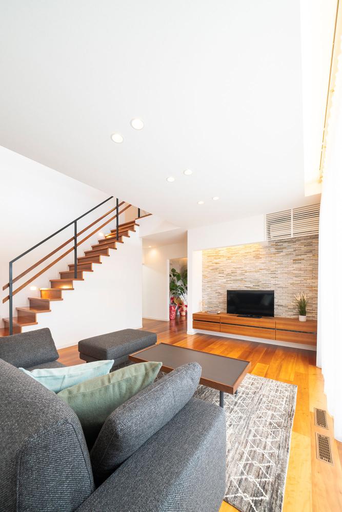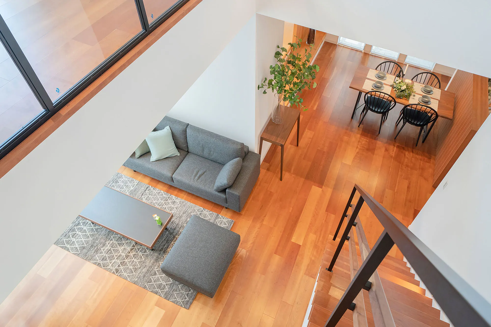 家族の気配やぬくもりを感じやすい、開放的で回遊式の間取り。収納や高低差を利用したゆるやかな空間の仕切りは暮らしに心地よさを感じさせてくれる。全てをオープンにつなげることなく、みせる空間と隠す空間を織り交ぜる事で、生活感を抑えホテルライクな暮らしを実現する。