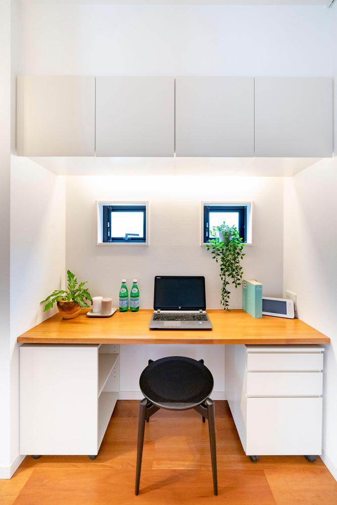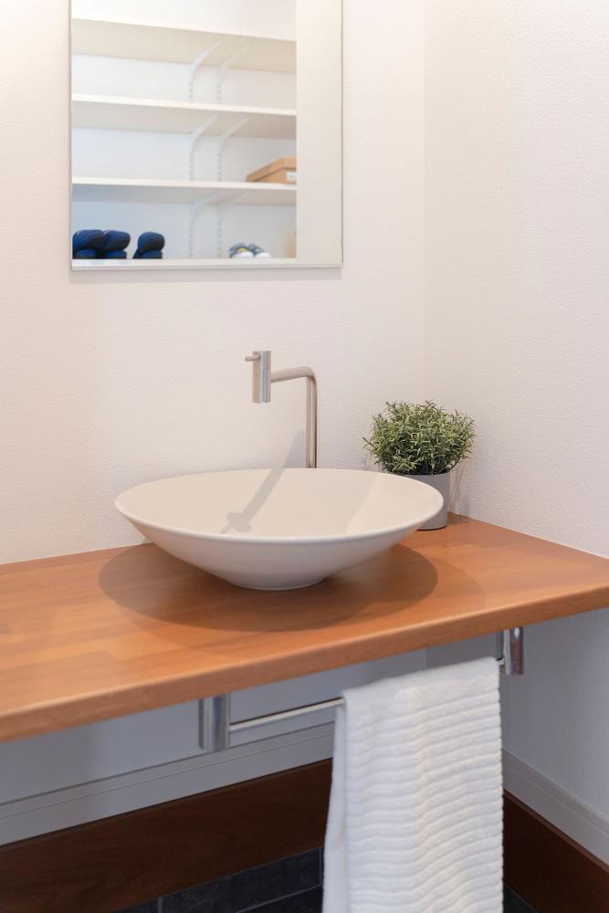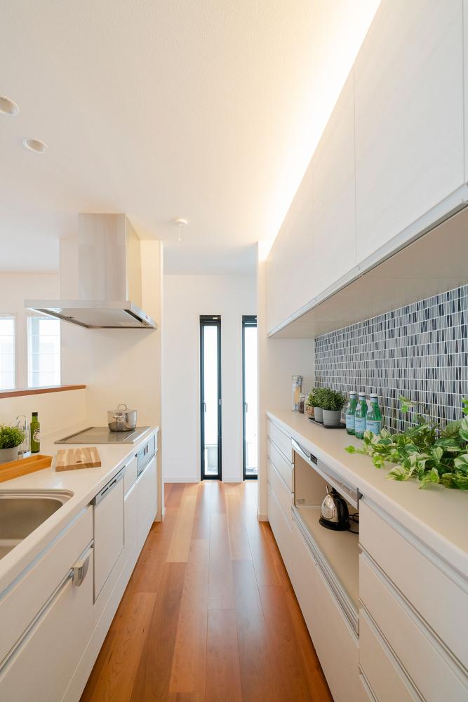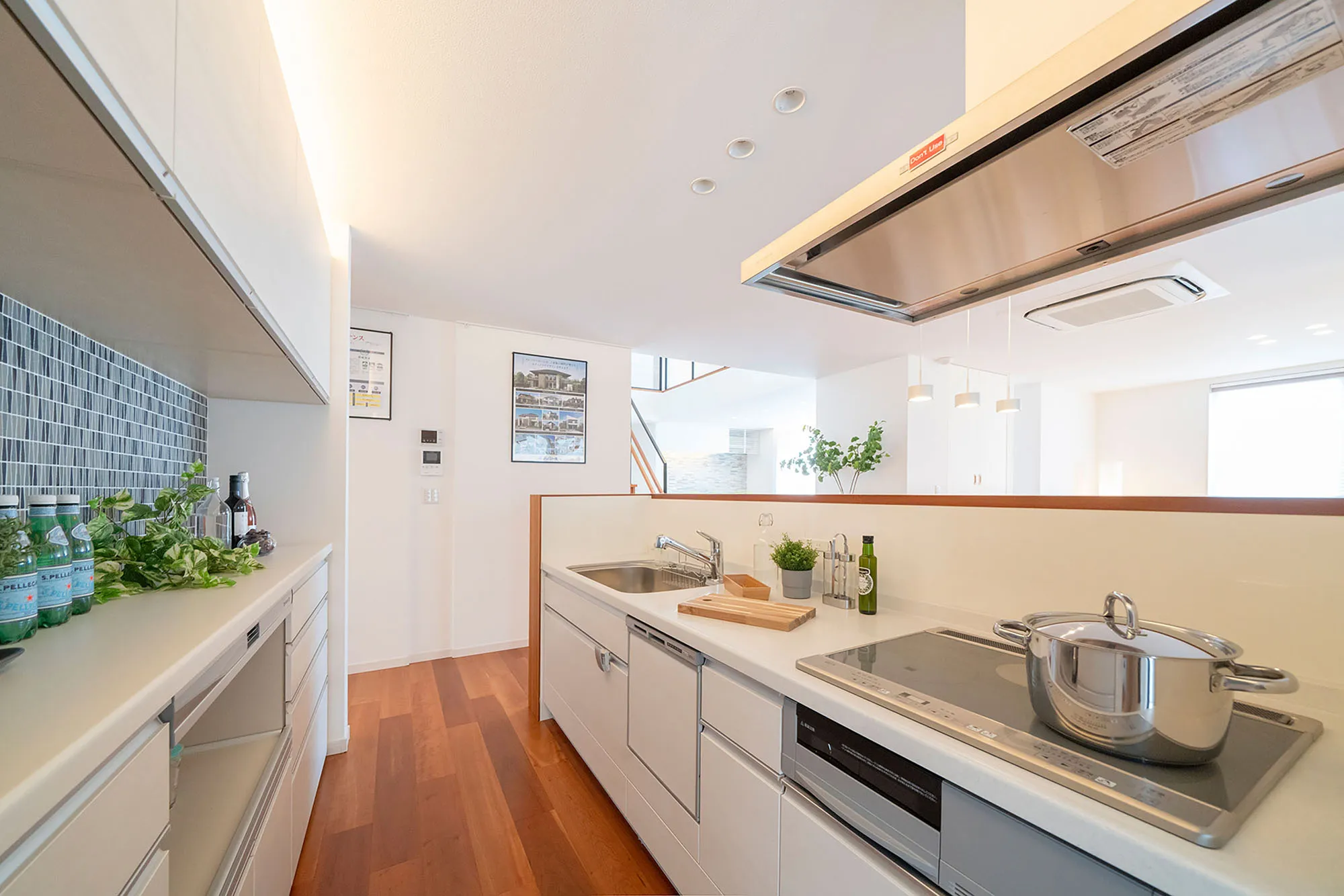 キッチンカウンターは少し高めの立ち上げ。来客があっても手元が見えないから日常感を隠すことができる。