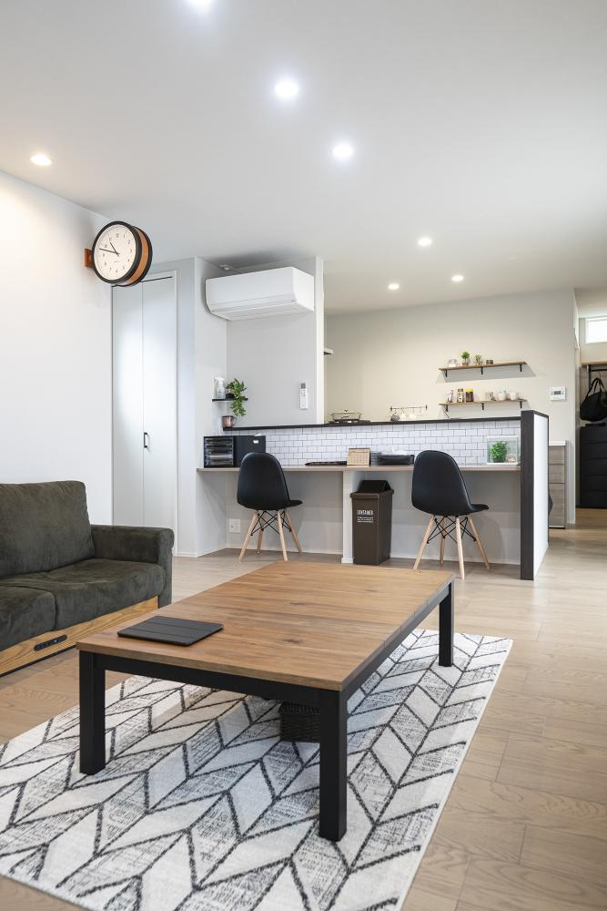 モノトーンを基調としたおちついたLDK。ご自分で取り付けた木目調の壁付け時計がアクセントに。