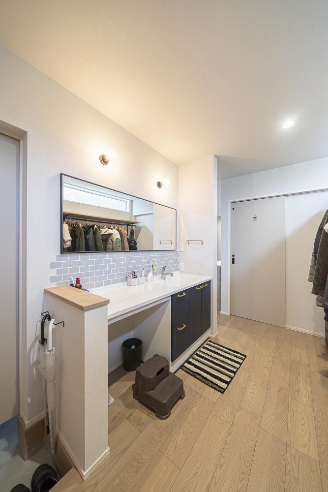 コンロ前の壁には、洗面所・カウンターとおそろいのタイルを。