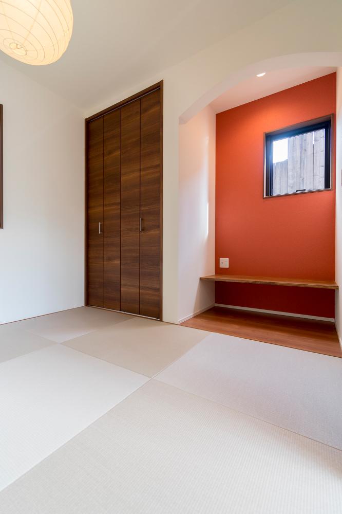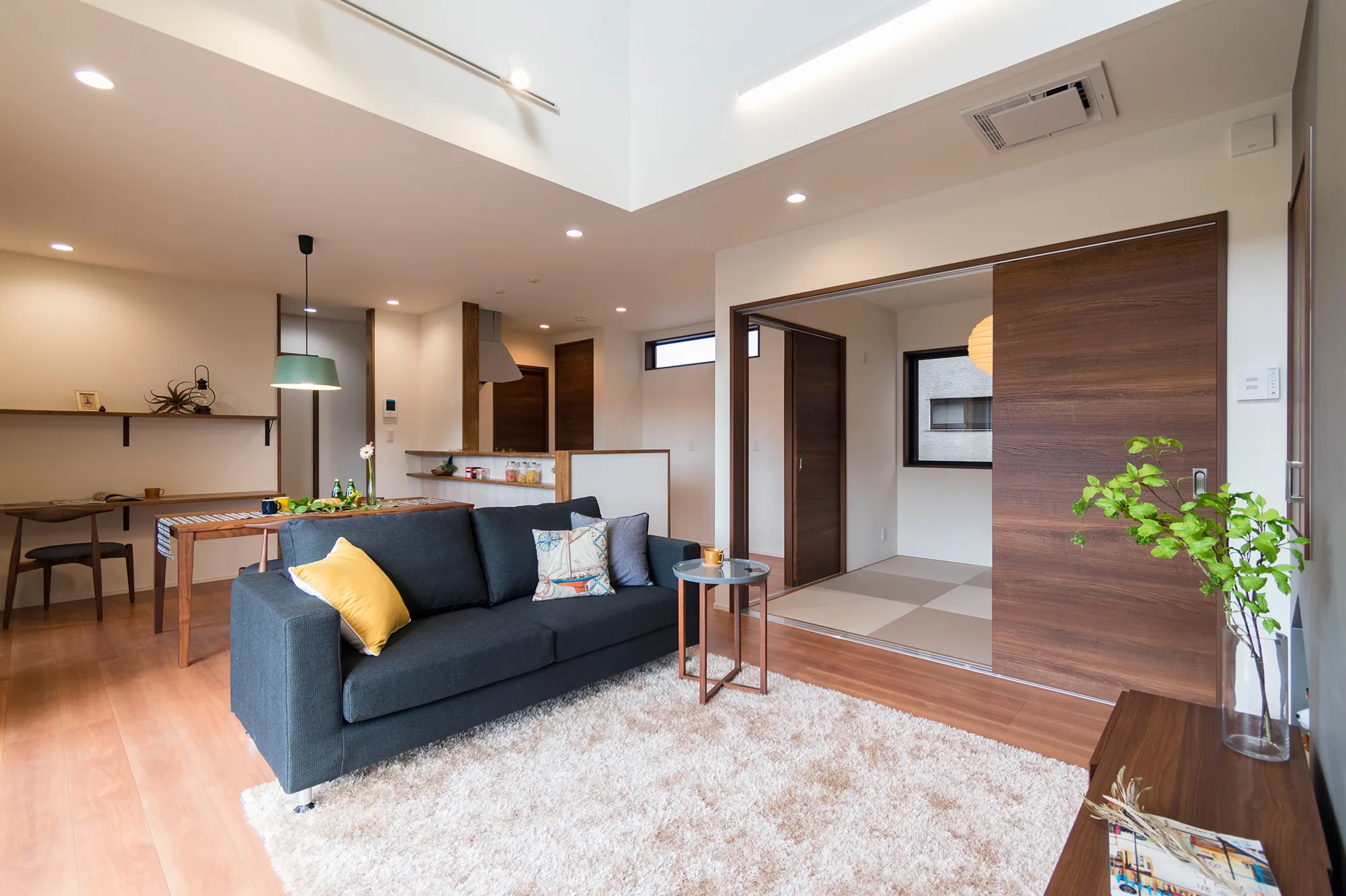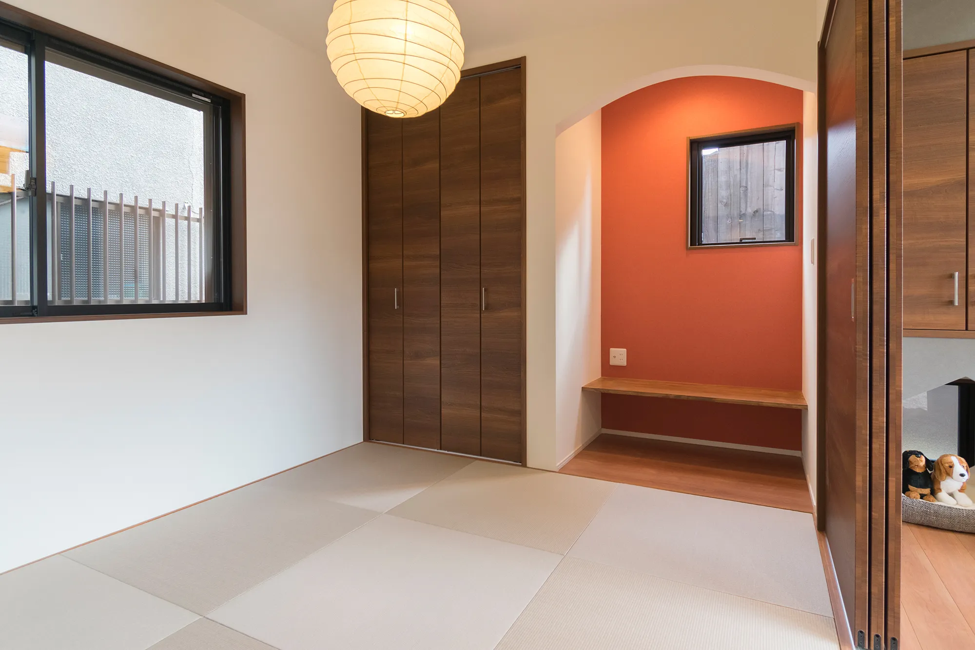 リビングに隣接する和室は、引き⼾で区切れば客間としても活⽤できる。天井埋め込み式の空気清浄機を設置し、ワンちゃんの臭いを未然に防いでくれるから安⼼