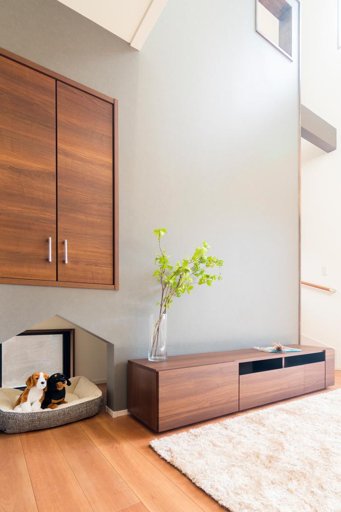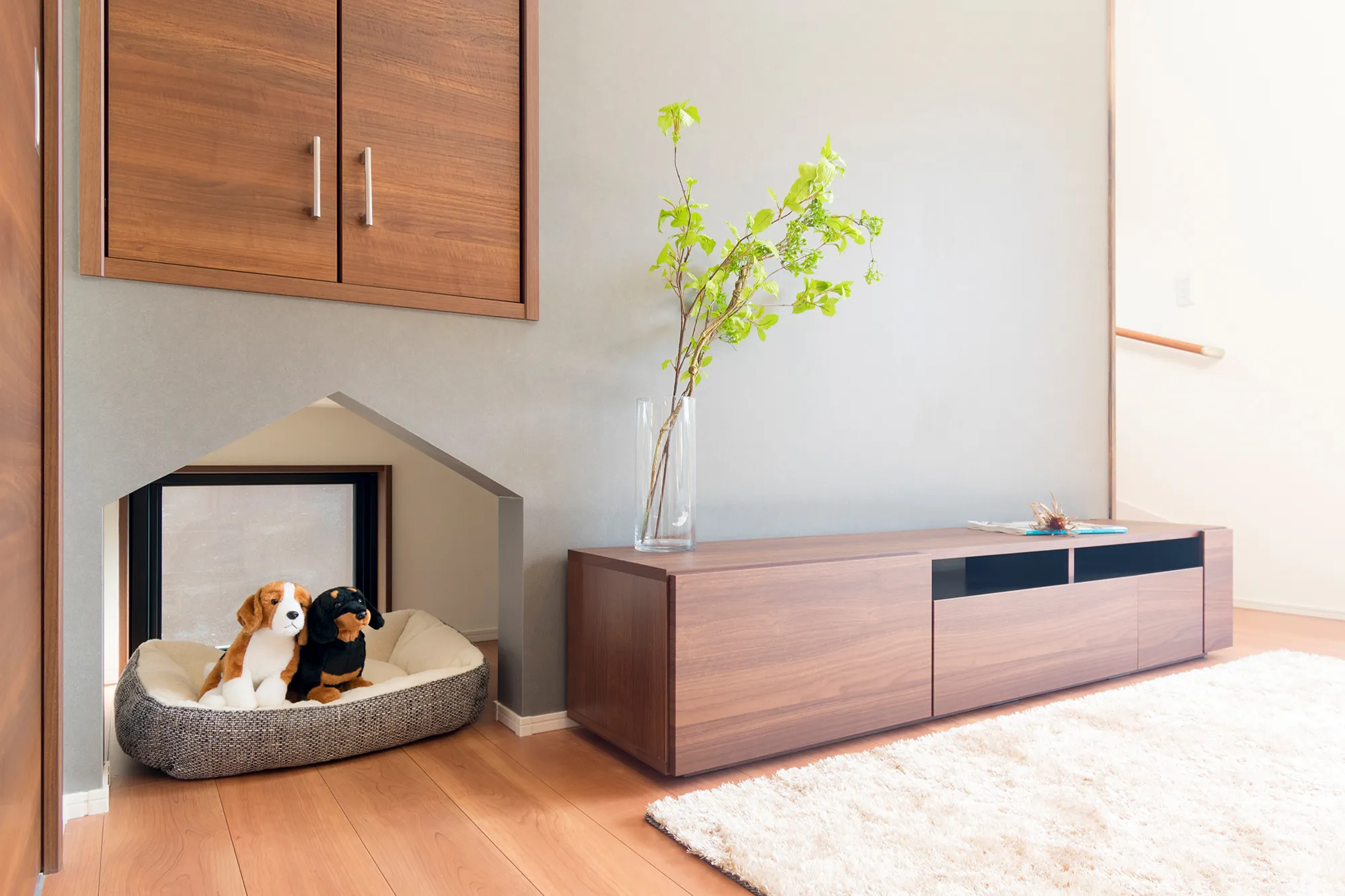 階段下のデッドスペースには、ドッグハウス型の 可愛らしい愛⽝⽤スペースを確保。上部の収納に はペットシーツやフードなど、何かとかさばる愛 ⽝グッズを収納し、リビングはいつもすっきり