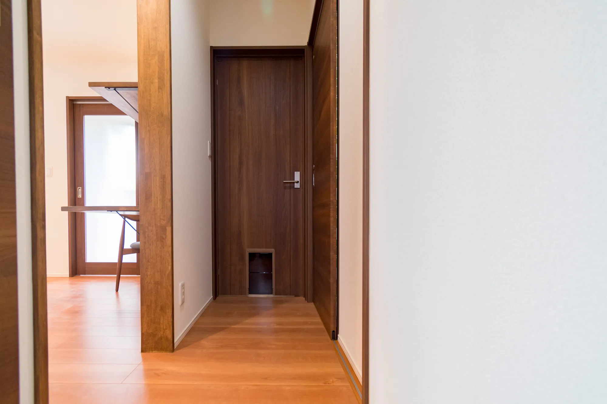 要所の扉にペットドアが取り付けられているから、冷暖房を使う時期もドアを開け放つことなくワンちゃんだけが行き来できる。