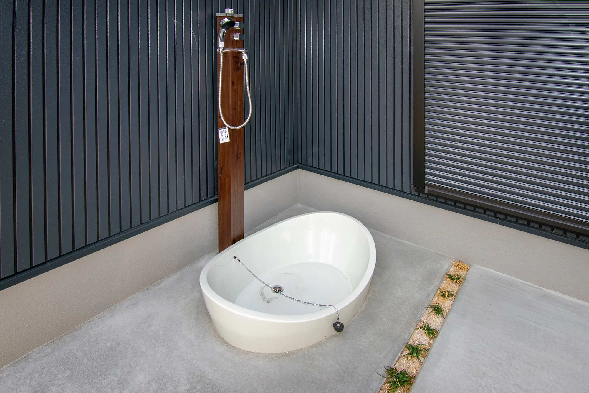 玄関ドア横に足洗い場があり、散歩から帰ったらすぐに足元を洗えるほか、広い土間はワンちゃんのグルーミングスペースにも活用できる。