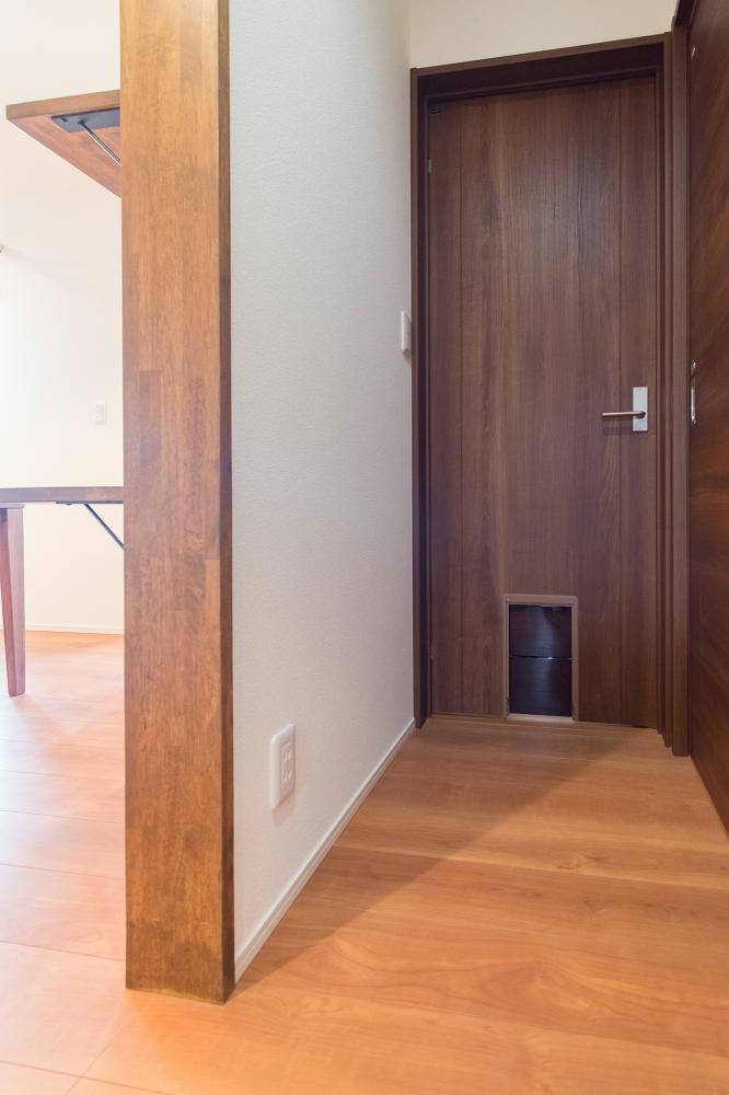 リビングと⽞関⼟間の間には⽝が⾃由に⾏き来できるペットドアを設置。ドアの向こうに⼟間があり、トイレを設置することで居住スペースと分けることができて臭いも気にならない
