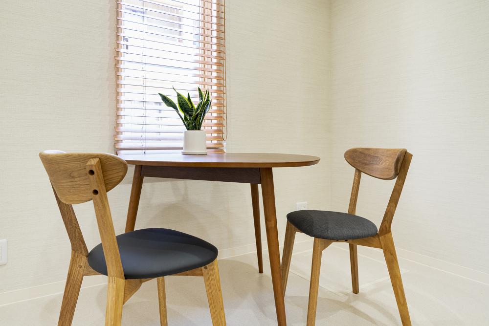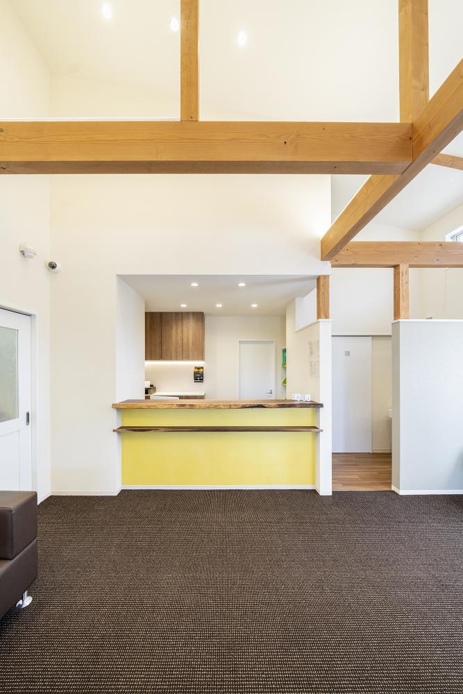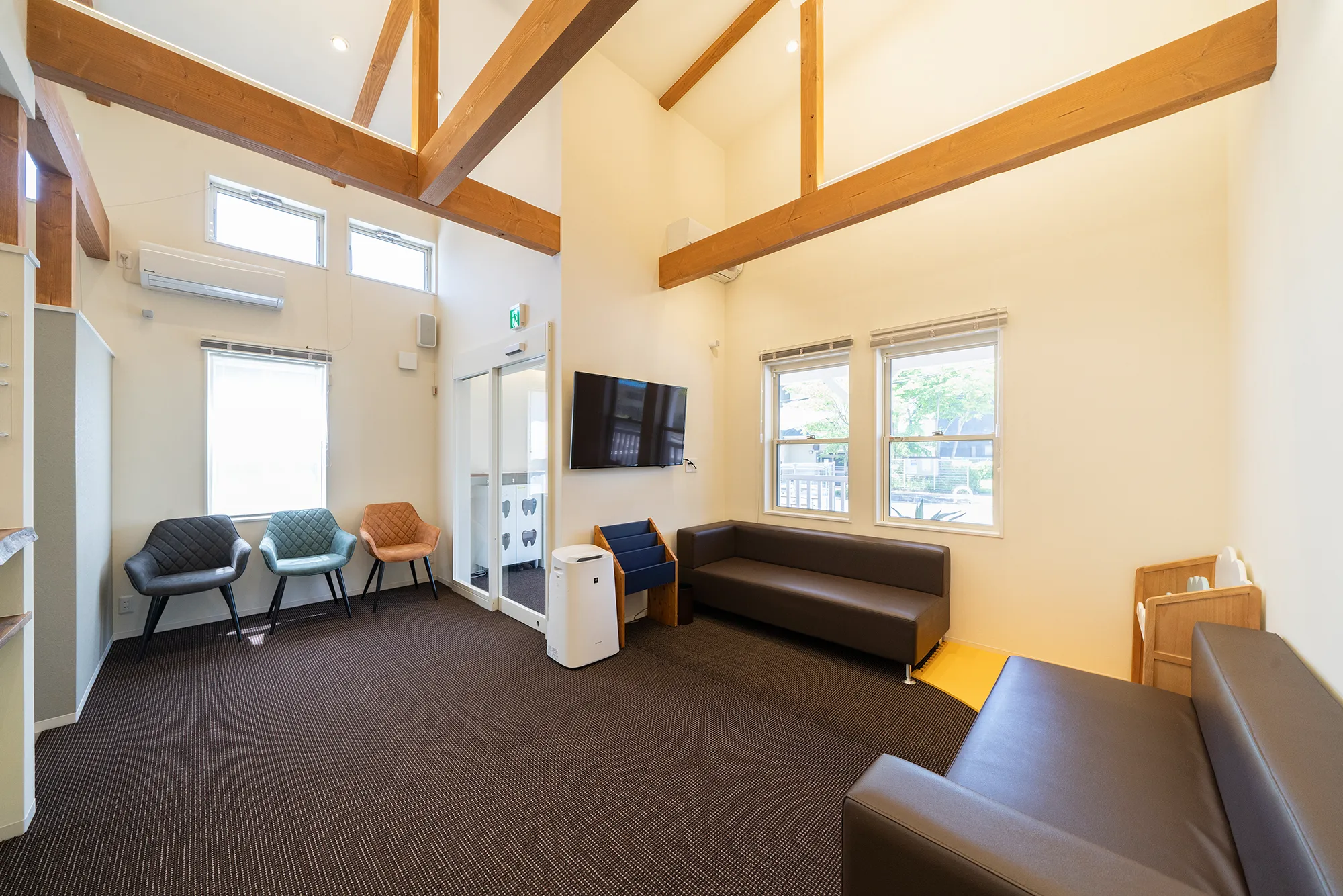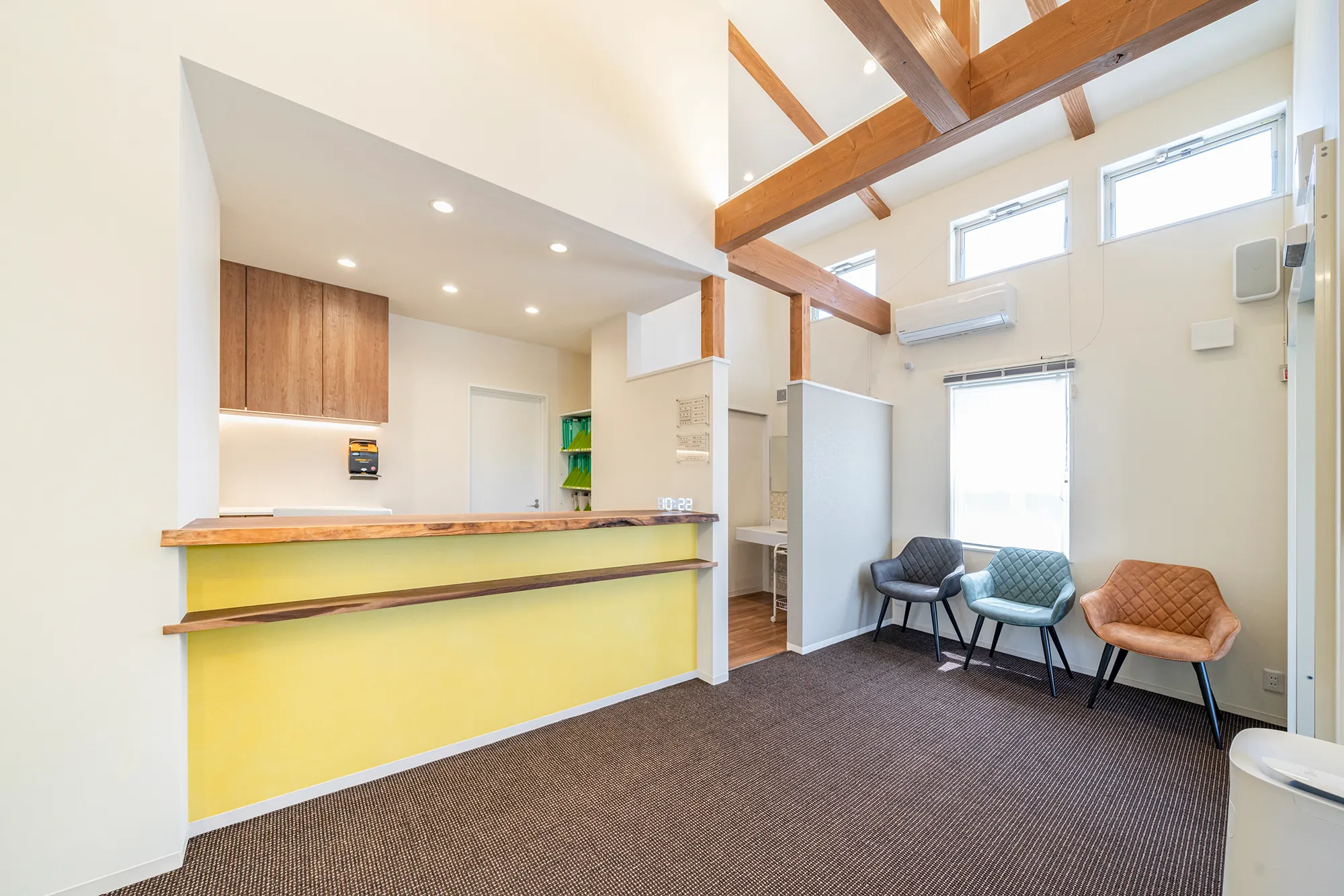 茶色の梁が映える待合室