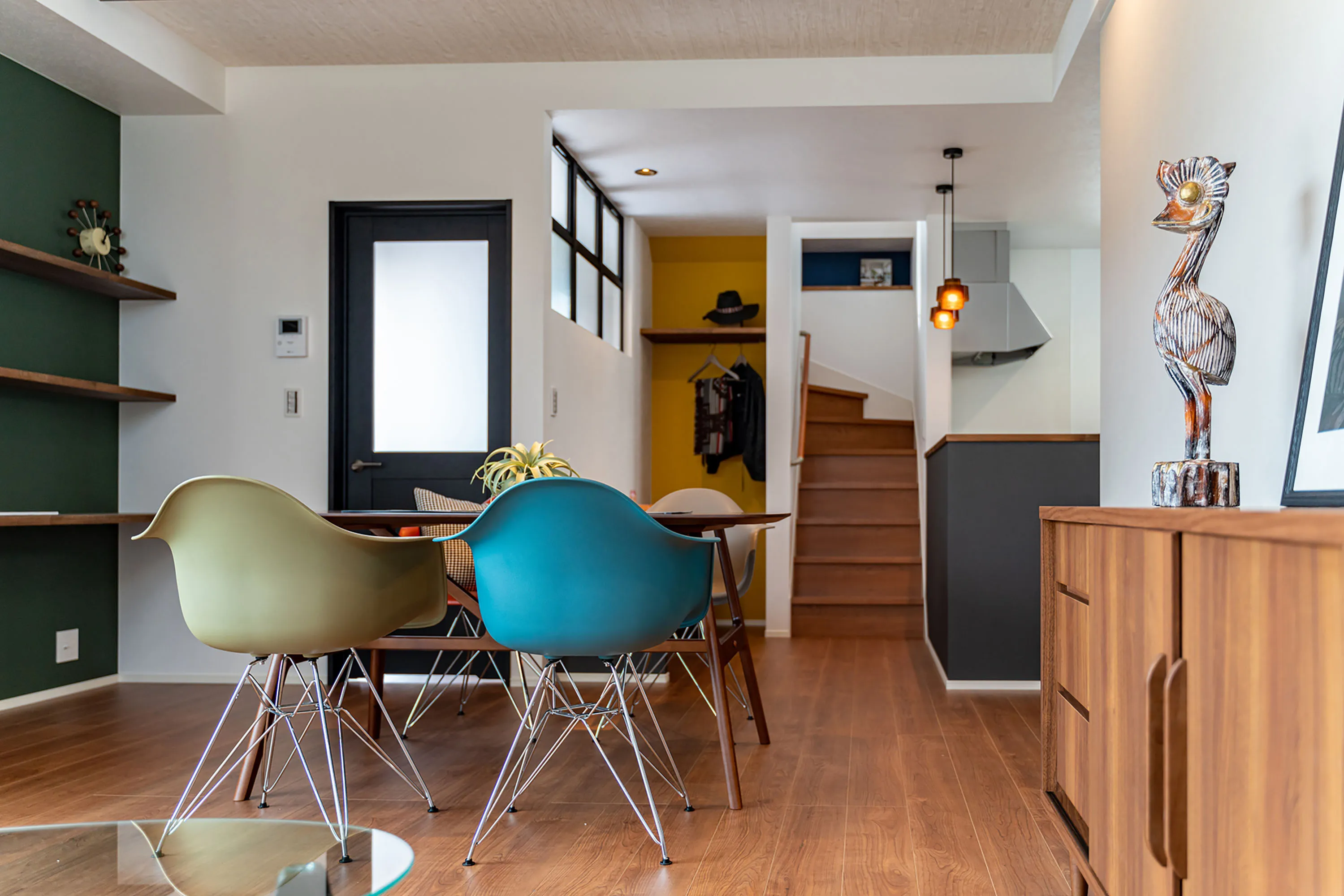 ダイニング横には オープン棚を造作し、ファミリーライブラリーと して活⽤