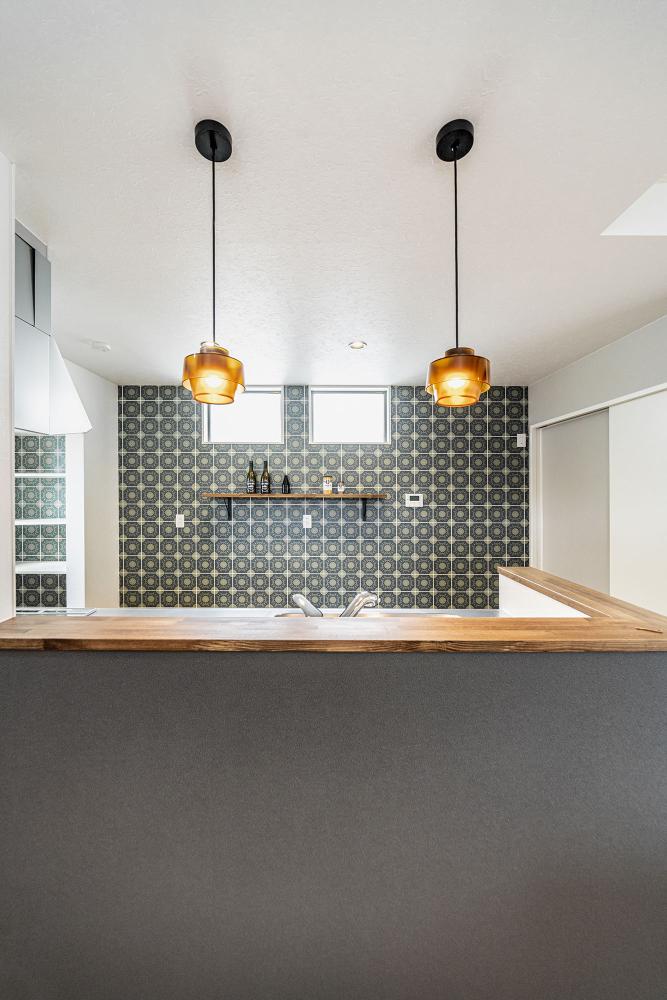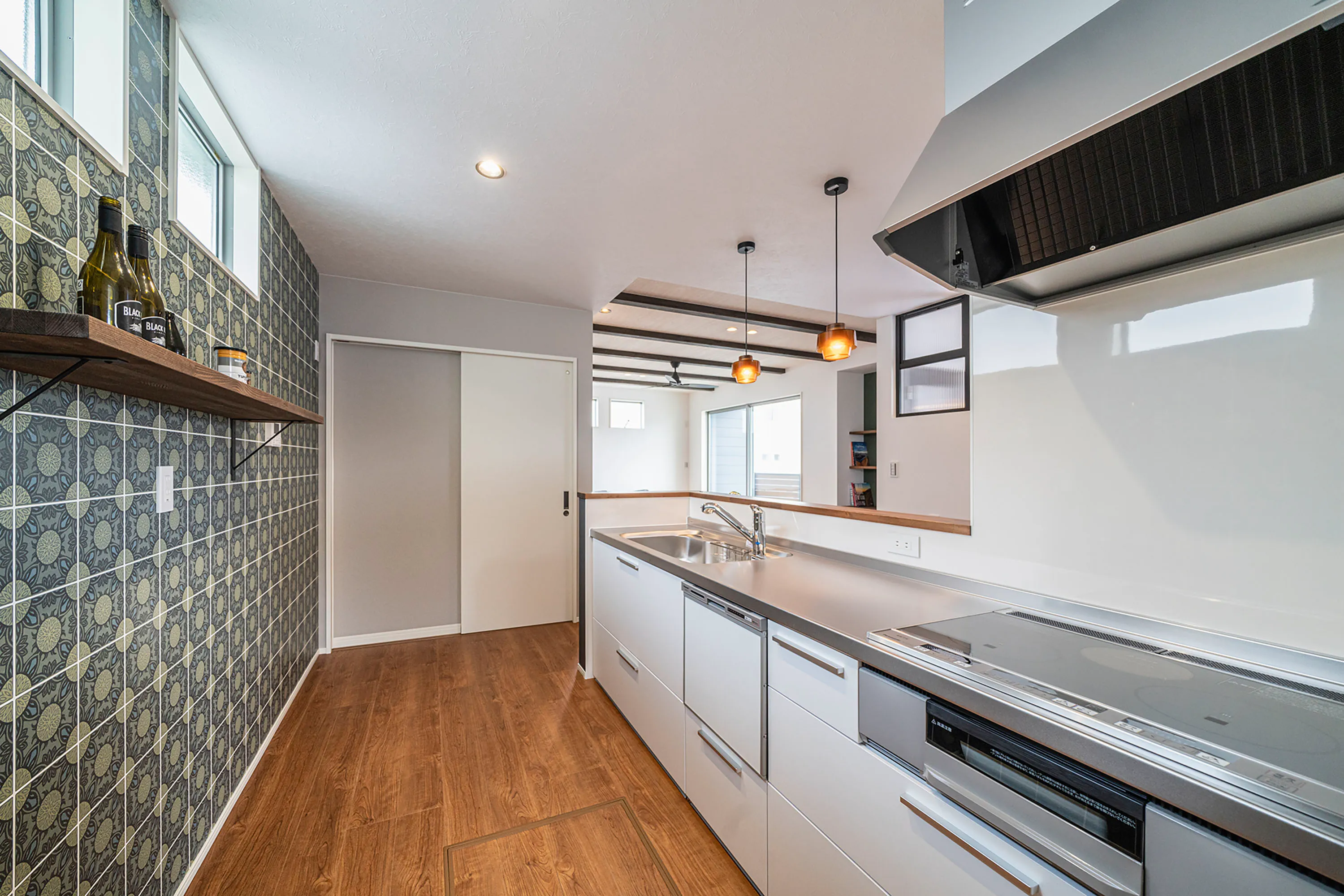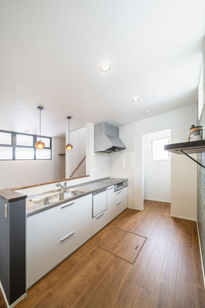 キッチン背⾯には飾り棚と明かり取り窓を設け た。奥の扉は洗⾯・浴室へ。家事の移動を最⼩限 にする間取り