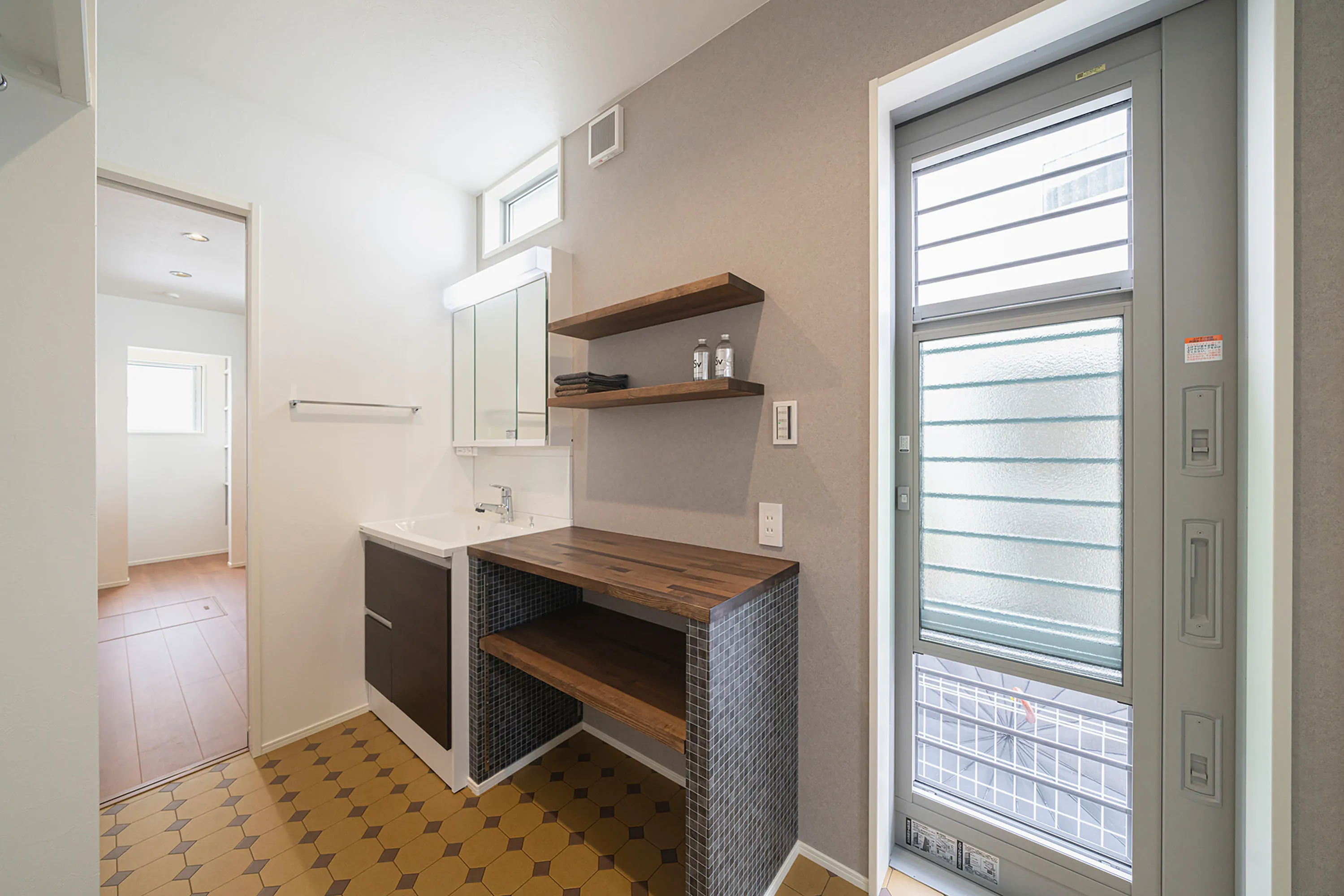 キッチンから一直線につながる洗面室には、勝手口を設置。洗濯してそのまま干しに出たり、取り込んでその場で畳んだり、室内干しのできるランドリールームを兼ねた広々空間だ。