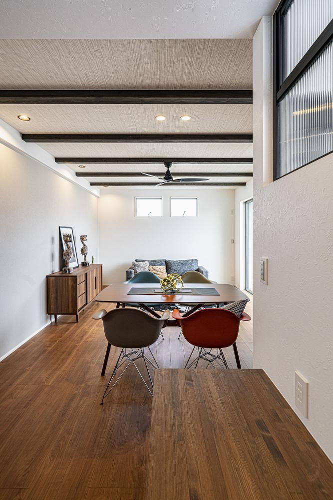 デッキに⾯した⼤開⼝の明るいリビング。ウッド感を活かし、直線的にデザインしたミッドセンチュリーモダン。